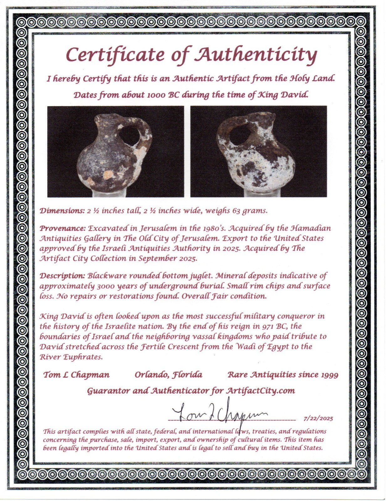 Dimensions: 2 ½ inches tall, 2 ½ inches wide, weighs 63 grams. Provenance: Excavated in Jerusalem in the 1980’s. Acquired by the Hamadian Antiquities Gallery in The Old City of Jerusalem. Export to the United States approved by the Israeli Antiquities Authority in 2025. Acquired by The Artifact City Collection in September 2025. Description: Blackware rounded bottom juglet. Mineral deposits indicative of approximately 3000 years of underground burial. Small rim chips and surface loss. No repairs or restorations found. Overall Fair condition. King David is often looked upon as the most successful military conqueror in the history of the Israelite nation. By the end of his reign in 971 BC, the boundaries of Israel and the neighboring vassal kingdoms who paid tribute to David stretched across the Fertile Crescent from the Wadi of Egypt to the River Euphrates.