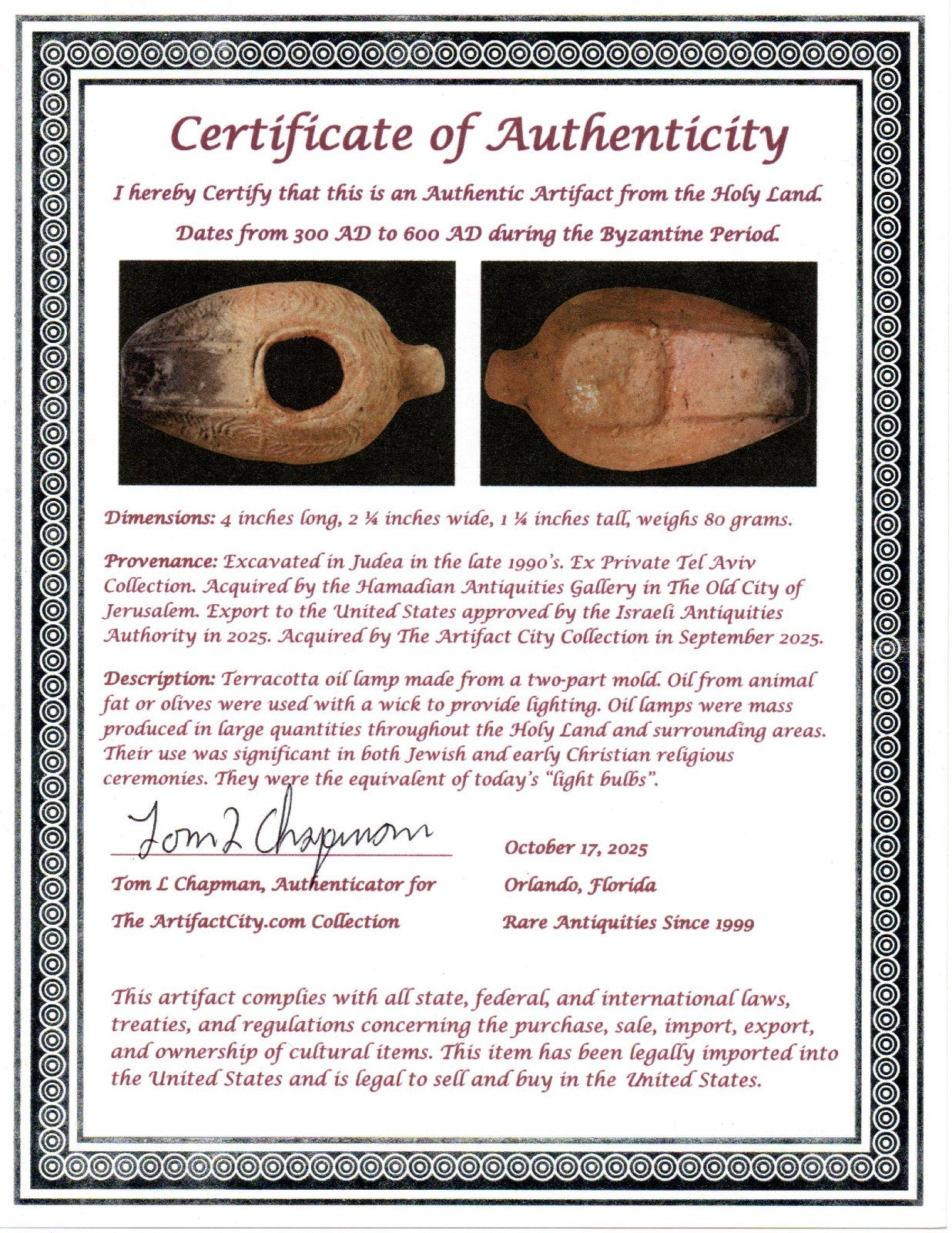 Dimensions: 4 inches long, 2 ¼ inches wide, 1 ¼ inches tall, weighs 80 grams. Provenance: Excavated in Judea in the late 1990’s. Ex Private Tel Aviv Collection. Acquired by the Hamadian Antiquities Gallery in The Old City of Jerusalem. Export to the United States approved by the Israeli Antiquities Authority in 2025. Acquired by The Artifact City Collection in September 2025. Description: Terracotta oil lamp made from a two-part mold. Oil from animal fat or olives were used with a wick to provide lighting. Oil lamps were mass produced in large quantities throughout the Holy Land and surrounding areas. Their use was significant in both Jewish and early Christian religious ceremonies. They were the equivalent of today’s “light bulbs”.