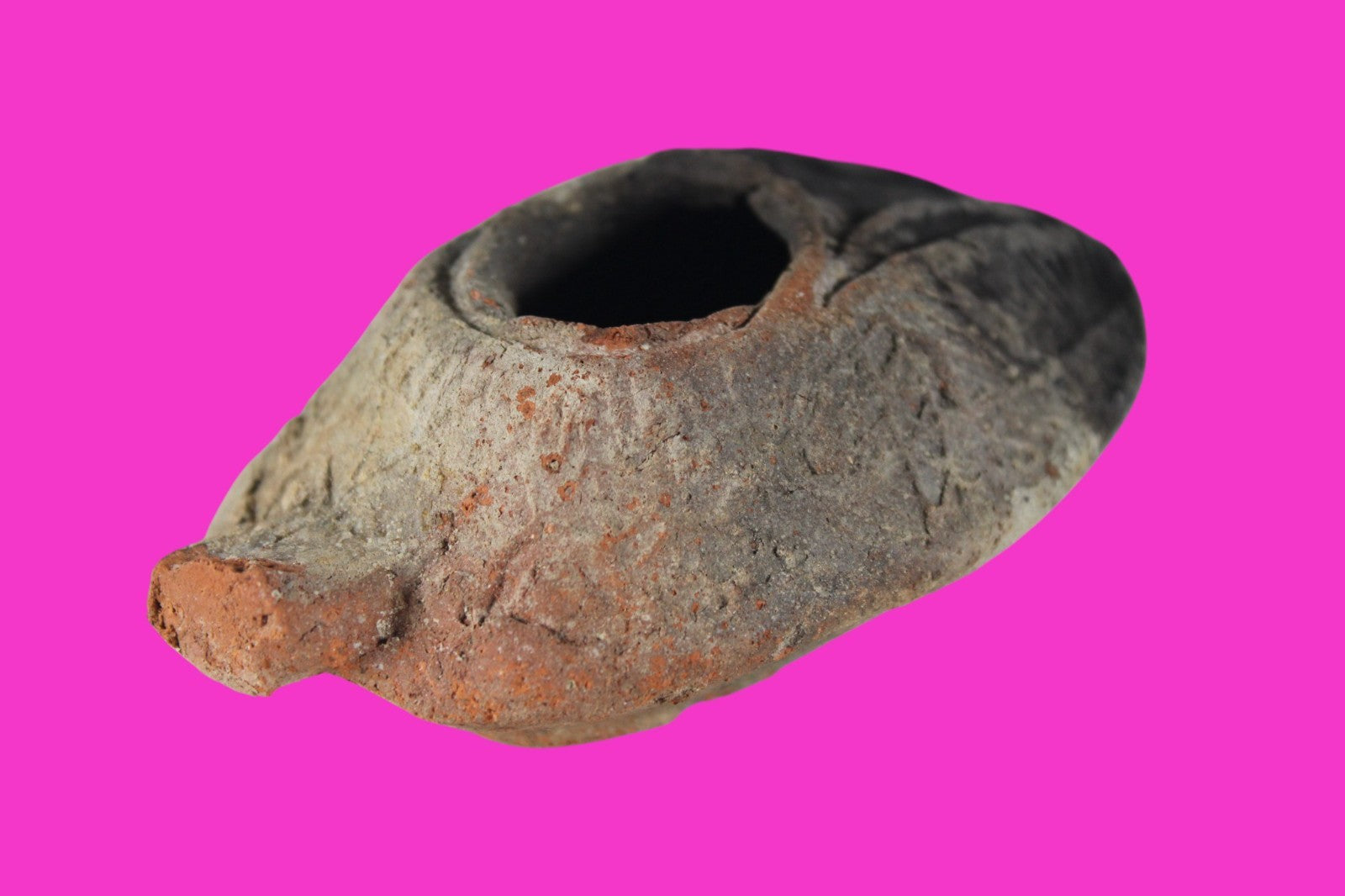 Dimensions: 3 ¾ inches long, 2 ¼ inches wide, 1 ½ inches tall, weighs 88 grams. Provenance: Excavated in Judea in the late 1990’s. Ex Private Tel Aviv Collection. Acquired by the Hamadian Antiquities Gallery in The Old City of Jerusalem. Export to the United States approved by the Israeli Antiquities Authority in 2025. Acquired by The Artifact City Collection in September 2025. Description: Terracotta oil lamp made from a two-part mold. Oil from animal fat or olives was used with a wick to provide lighting. Oil lamps were mass produced in large quantities throughout the Holy Land and surrounding areas. Their use was significant in both Jewish and early Christian religious ceremonies. They were the equivalent of today’s “light bulbs”.