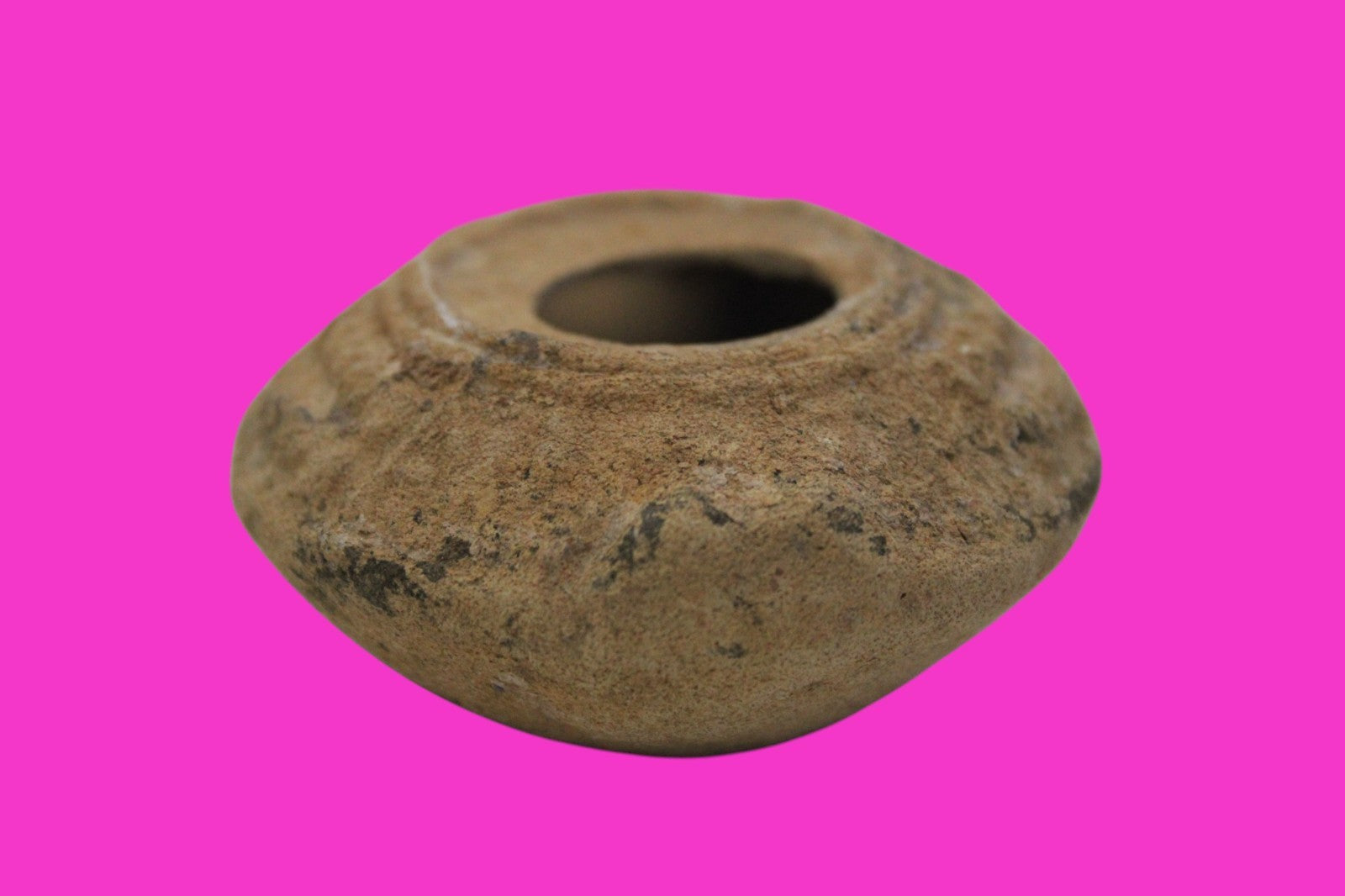 Dimensions: 3 inches long, 2 ¼ inches wide, 1 inch tall, weighs 47 grams. Provenance: Excavated in Judea in the late 1990’s. Ex Private Tel Aviv Collection. Acquired by the Hamadian Antiquities Gallery in The Old City of Jerusalem. Export to the United States approved by the Israeli Antiquities Authority in 2025. Acquired by The Artifact City Collection in September 2025. Description: Terracotta oil lamp made from a two-part mold. Oil from animal fat or olives were used with a wick to provide lighting. Oil lamps were mass produced in large quantities throughout the Holy Land and surrounding areas. Their use was significant in both Jewish and early Christian religious ceremonies. They were the equivalent of today’s “light bulbs”.