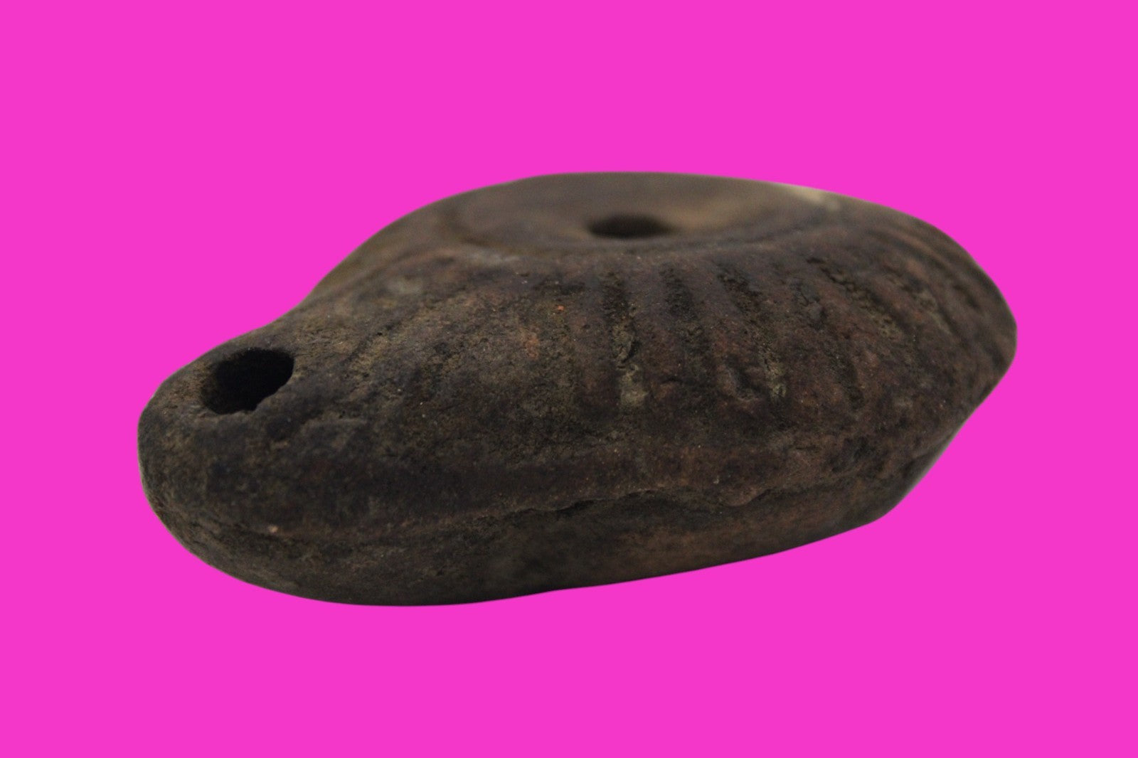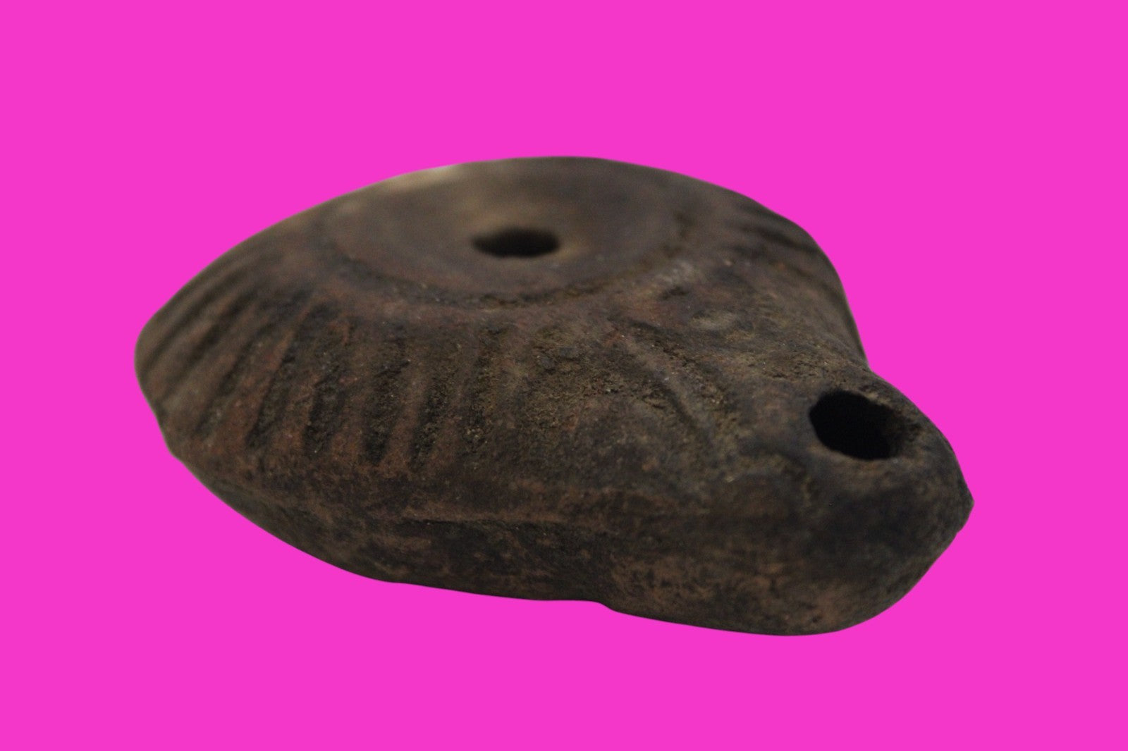 Dimensions: 3 inches long, 2 ¼ inches wide, 1 inch tall, weighs 73 grams. Provenance: Excavated in Judea in the late 1990’s. Ex Private Tel Aviv Collection. Acquired by the Hamadian Antiquities Gallery in The Old City of Jerusalem. Export to the United States approved by the Israeli Antiquities Authority in 2025. Acquired by The Artifact City Collection in September 2025. Description: Terracotta oil lamp made from a two-part mold. Oil from animal fat or olives were used with a wick to provide lighting. Oil lamps were mass produced in large quantities throughout the Holy Land and surrounding areas. Their use was significant in both Jewish and early Christian religious ceremonies. They were the equivalent of today’s “light bulbs”.