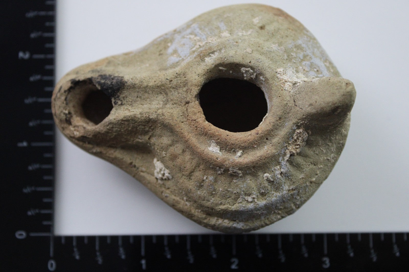 Dimensions: 3 inches long, 2 ½ inches wide, 1 ½ inches tall, weighs 64 grams. Provenance: Ex. Private NYC Collection, acquired in the USA Market. Ex. Palmyra Heritage Fine Art Gallery, Downtown Manhattan, New York City, 2025. Acquired by The Artifact City Collection in 2025. Description: Terracotta oil lamp made from a two-part mold. Oil from animal fat or olives was used with a wick to provide lighting. Oil lamps were mass produced in large quantities throughout the Holy Land and surrounding areas. Their use was significant in both Jewish and early Christian religious ceremonies. They were the equivalent of today’s “light bulbs”.