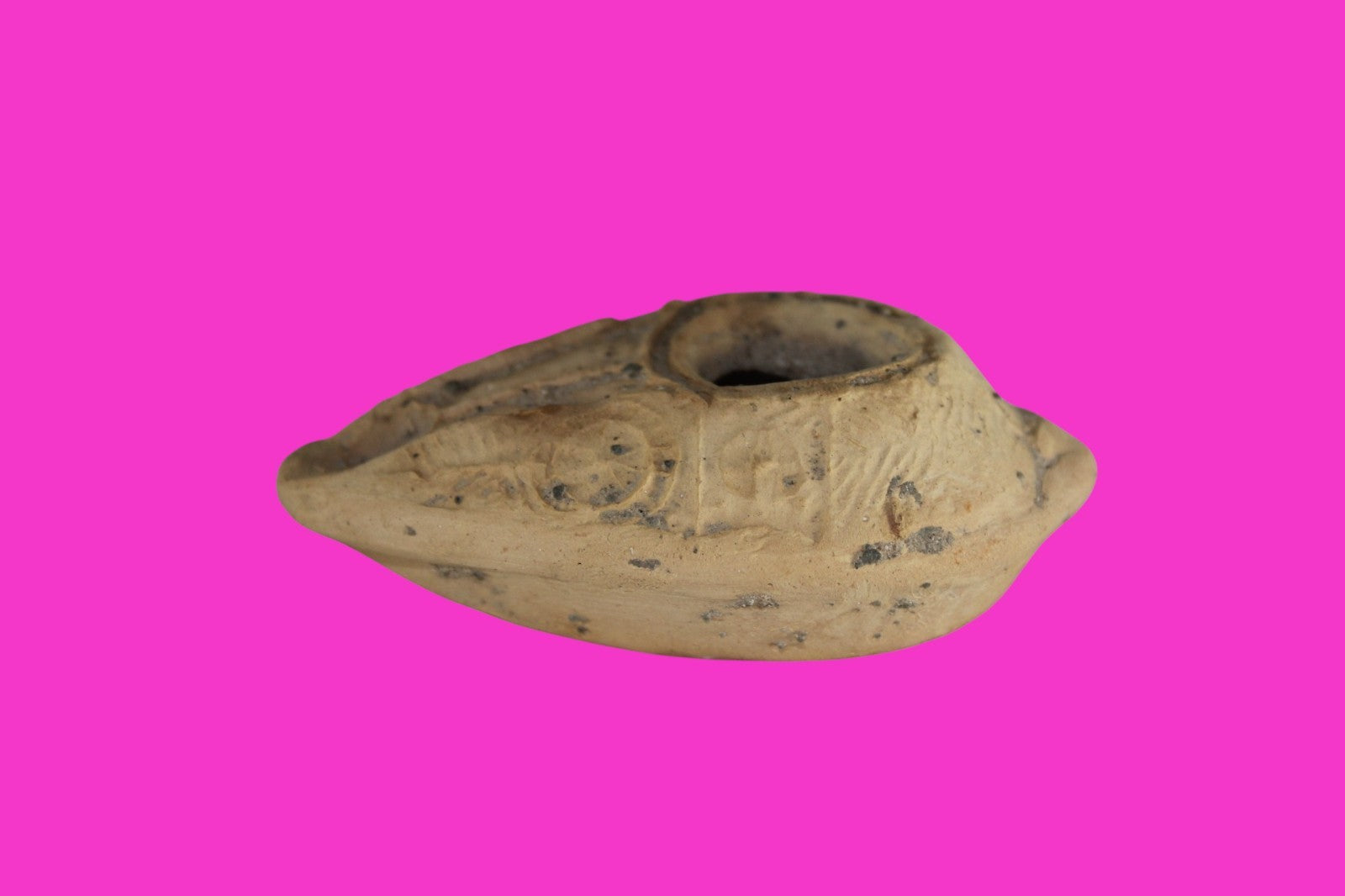 Dimensions: 3 ¼ inches long, 2 inches wide, 1 inch tall, weighs 65 grams. Provenance: Ex. Private collection, bought via London art market, formerly in a 1970s/80s Swiss collection. Ex. Palmyra Heritage Fine Arts Gallery, Downtown Manhattan, New York City, 2025. Acquired by The Artifact City Collection in September 2025. Description: Terracotta oil lamp made from a two-part mold. Oil from animal fat or olives were used with a wick to provide lighting. Oil lamps were mass produced in large quantities throughout the Holy Land and surrounding areas. Their use was significant in both Jewish and early Christian religious ceremonies. They were the equivalent of today’s “light bulbs”.