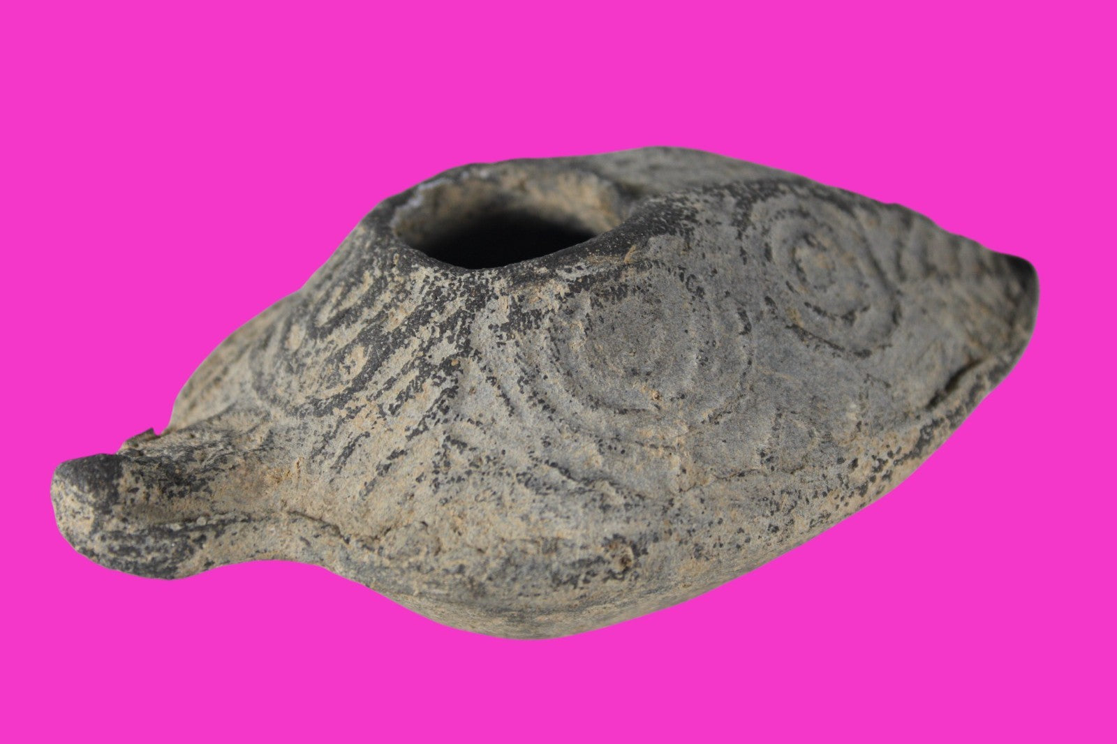 Dimensions: 4 ¼ inches long, 2 ¼ inches wide, 1 ½ inches tall, weighs 99 grams. Provenance: Excavated in Judea in the late 1990’s. Ex Private Tel Aviv Collection. Acquired by the Hamadian Antiquities Gallery in The Old City of Jerusalem. Export to the United States approved by the Israeli Antiquities Authority in 2025. Acquired by The Artifact City Collection in September 2025. Description: Terracotta oil lamp made from a two-part mold. Oil from animal fat or olives was used with a wick to provide lighting. Oil lamps were mass produced in large quantities throughout the Holy Land and surrounding areas. Their use was significant in both Jewish and early Christian religious ceremonies. They were the equivalent of today’s “light bulbs”.
