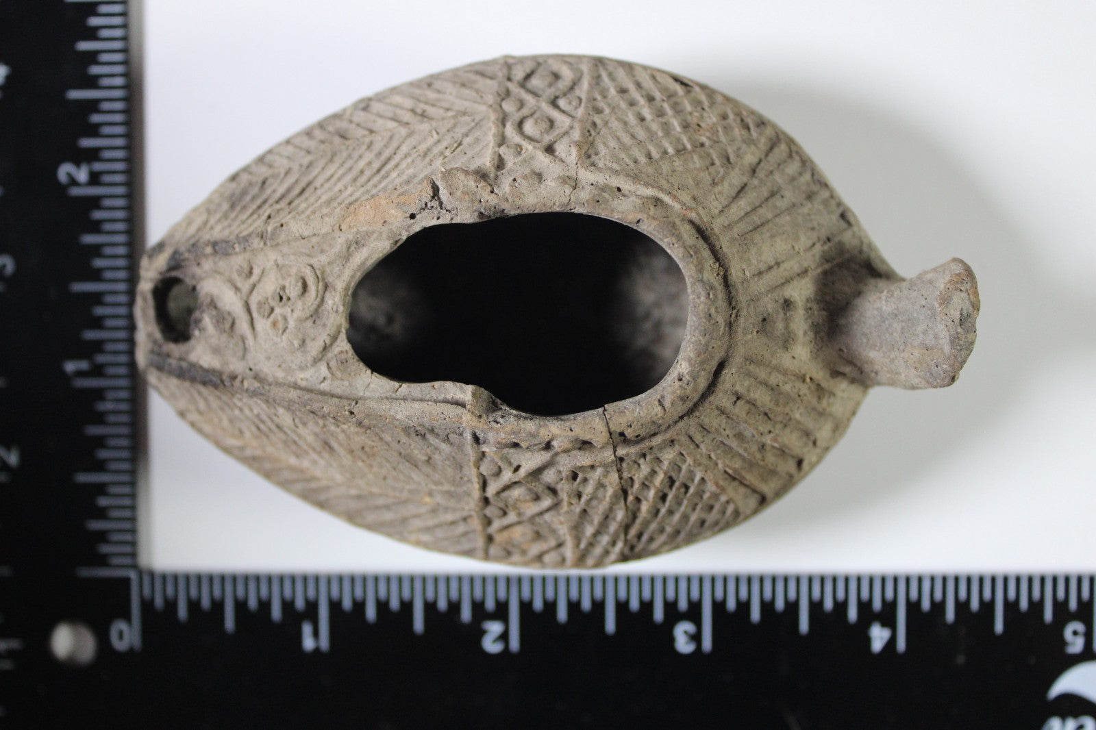Dimensions: 3 ¾ inches long, 2 ½ inches wide, 1 ½ inches tall, weighs 76 grams. Provenance: Excavated in Judea in the late 1990’s. Ex Private Tel Aviv Collection. Acquired by the Hamadian Antiquities Gallery in The Old City of Jerusalem. Export to the United States approved by the Israeli Antiquities Authority in 2025. Acquired by The Artifact City Collection in September 2025. Description: Terracotta oil lamp made from a two-part mold. Oil from animal fat or olives was used with a wick to provide lighting. Oil lamps were mass produced in large quantities throughout the Holy Land and surrounding areas. Their use was significant in both Jewish and early Christian religious ceremonies. They were the equivalent of today’s “light bulbs”.