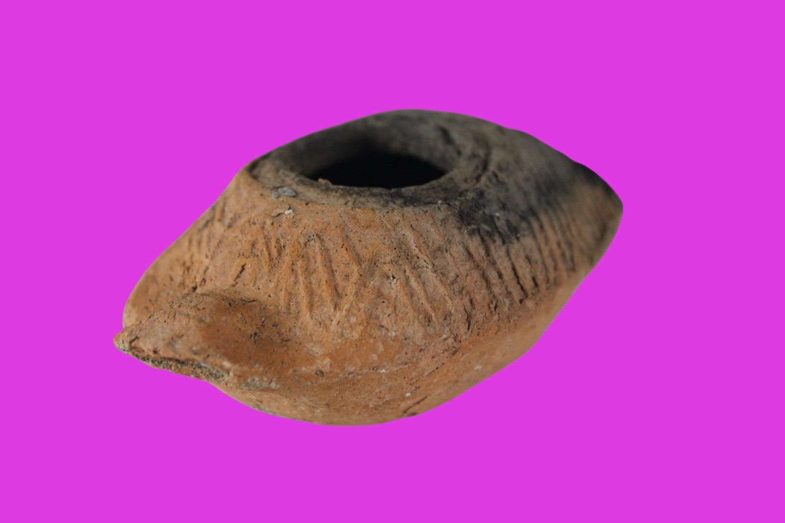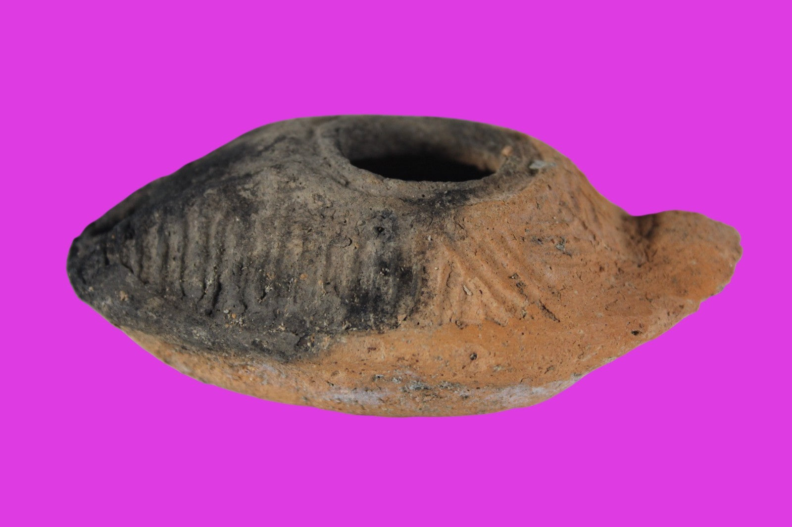 Dimensions: 3 ½ inches long, 2 ¼ inches wide, 1 ¼ inches tall, weighs 59 grams. Provenance: Excavated in Judea in the late 1990’s. Ex Private Tel Aviv Collection. Acquired by the Hamadian Antiquities Gallery in The Old City of Jerusalem. Export to the United States approved by the Israeli Antiquities Authority in 2025. Acquired by The Artifact City Collection in September 2025. Description: Terracotta oil lamp made from a two-part mold. Oil from animal fat or olives was used with a wick to provide lighting. Oil lamps were mass produced in large quantities throughout the Holy Land and surrounding areas. Their use was significant in both Jewish and early Christian religious ceremonies. They were the equivalent of today’s “light bulbs”.