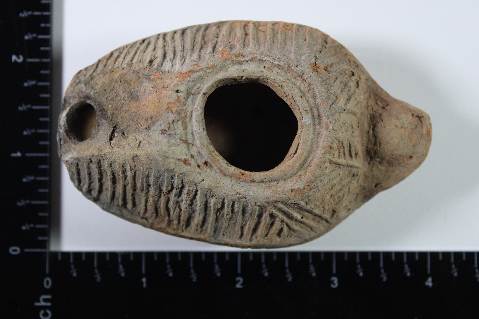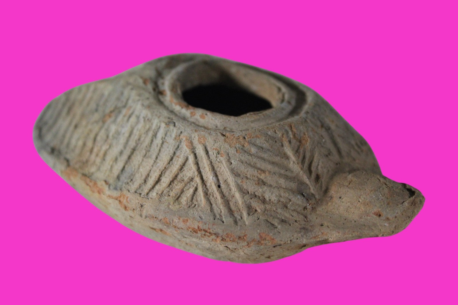 Dimensions: 3 ½ inches long, 2 ¼ inches wide, 1 ¼ inches tall, weighs 62 grams. Provenance: Excavated in Judea in the late 1990’s. Ex Private Tel Aviv Collection. Acquired by the Hamadian Antiquities Gallery in The Old City of Jerusalem. Export to the United States approved by the Israeli Antiquities Authority in 2025. Acquired by The Artifact City Collection in September 2025. Description: Terracotta oil lamp made from a two-part mold. Oil from animal fat or olives were used with a wick to provide lighting. Oil lamps were mass produced in large quantities throughout the Holy Land and surrounding areas. Their use was significant in both Jewish and early Christian religious ceremonies. They were the equivalent of today’s “light bulbs”.