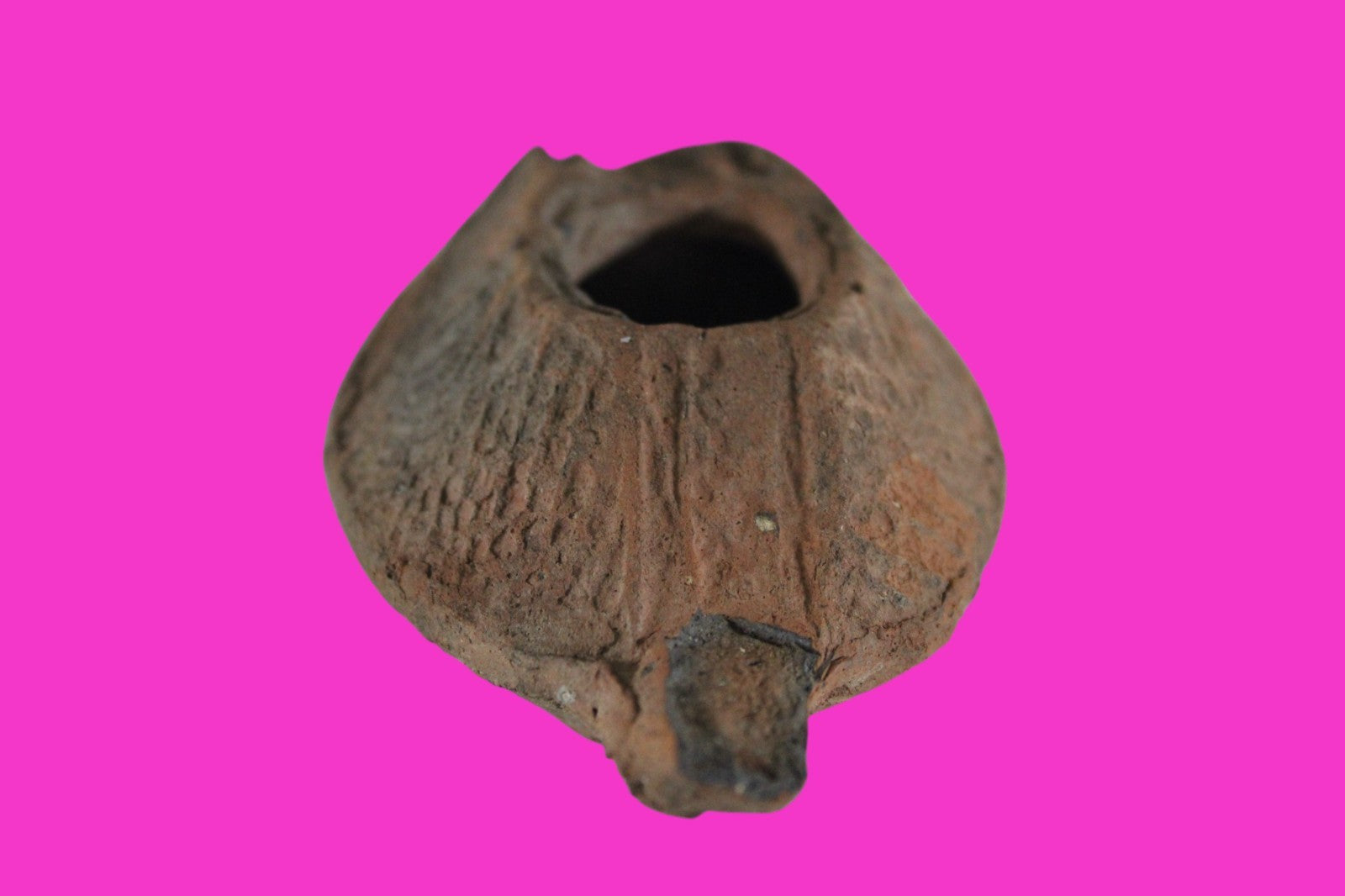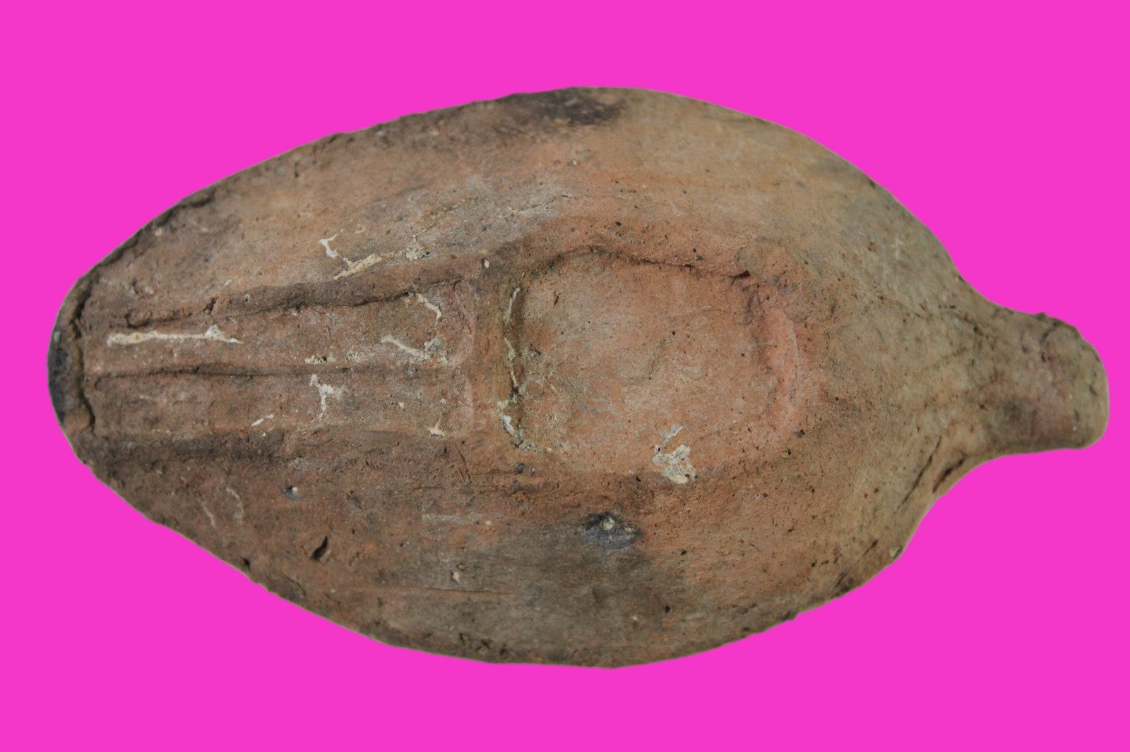 Dimensions: 4 ½ inches long, 2 ¼ inches wide, 1 ½ inches tall, weighs 80 grams. Provenance: Excavated in Judea in the late 1990’s. Ex Private Tel Aviv Collection. Acquired by the Hamadian Antiquities Gallery in The Old City of Jerusalem. Export to the United States approved by the Israeli Antiquities Authority in 2025. Acquired by The Artifact City Collection in September 2025. Description: Terracotta oil lamp made from a two-part mold. Oil from animal fat or olives were used with a wick to provide lighting. Oil lamps were mass produced in large quantities throughout the Holy Land and surrounding areas. Their use was significant in both Jewish and early Christian religious ceremonies. They were the equivalent of today’s “light bulbs”.