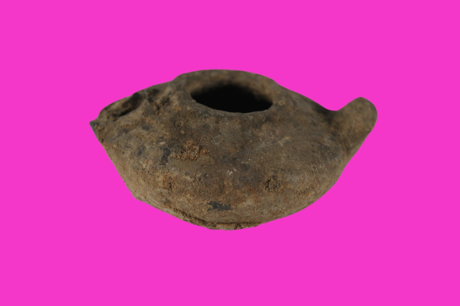 Dimensions: 2 ¾ inches long, 2 ½ inches wide, 1 inch tall, weighs 60 grams. Provenance: Ex. Private Tel Aviv collection. Collected in the 1990’s. Acquired by John McIntosh, MSE, MBA, Ancient Artifacts & Treasures, Winter Park, Florida in 2022. Acquired by The Artifact City collection in 2025. Description: Redware oil lamp made from a two-part mold. Oil from animal fat or olives were used with a wick to provide lighting. Oil lamps were mass produced in large quantities throughout the Holy Land and surrounding areas. Their use was significant in both Jewish and early Christian religious ceremonies. They were the equivalent of today’s “light bulbs”.
