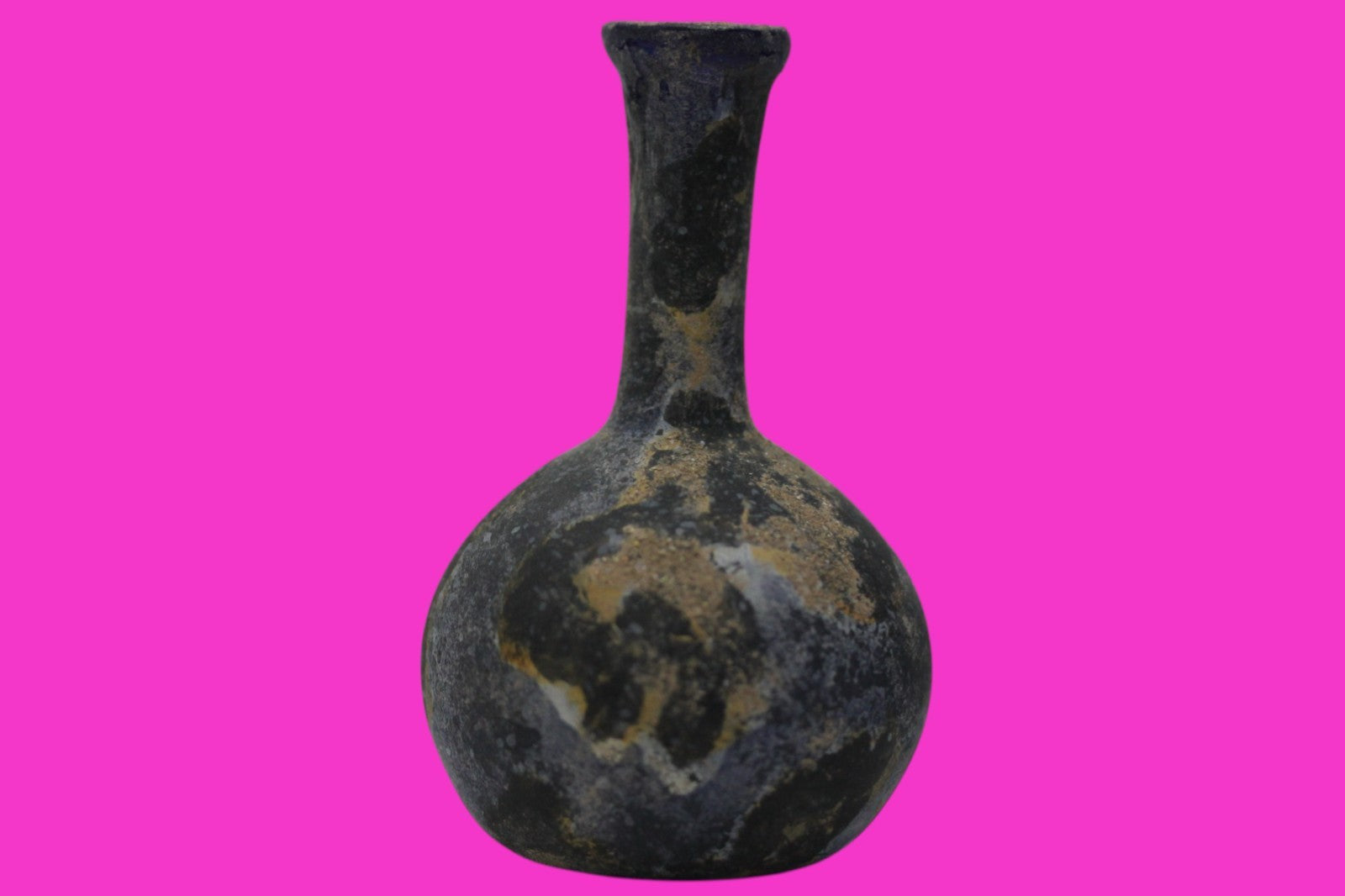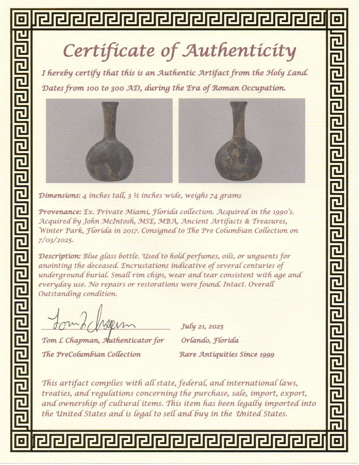 Dimensions: 4 inches tall, 3 ½ inches wide, weighs 74 gramsProvenance: Ex. Private Miami, Florida collection. Acquired in the 1990’s. Acquired by John McIntosh, MSE, MBA, Ancient Artifacts & Treasures, Winter Park, Florida in 2017. Consigned to The Pre Columbian Collection on 7/03/2025.Description: Blue glass bottle. Used to hold perfumes, oils, or unguents for anointing the deceased. Encrustations indicative of several centuries of underground burial. Small rim chips, wear and tear consistent with age and everyday use. No repairs or restorations were found. Intact. Overall Outstanding condition.