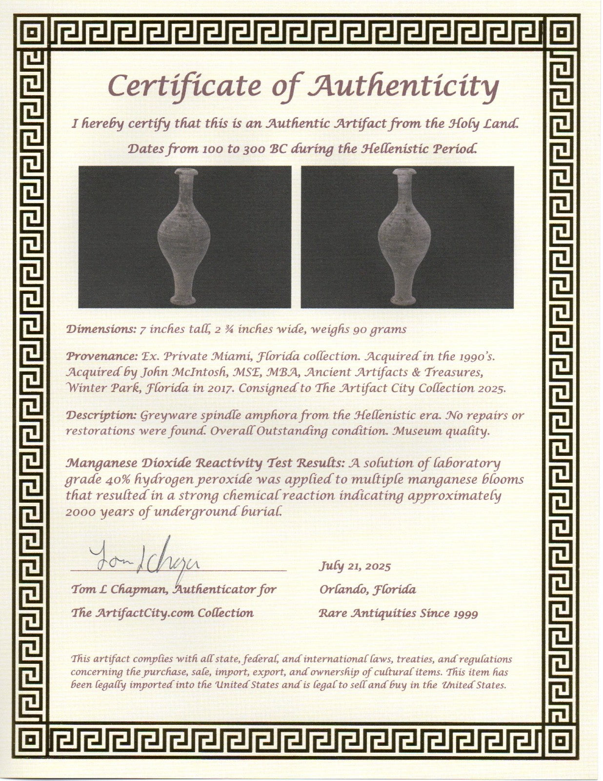 Dimensions: 7 inches tall, 2 ¾ inches wide, weighs 90 grams Provenance: Ex. Private Miami, Florida collection. Acquired in the 1990’s. Acquired by John McIntosh, MSE, MBA, Ancient Artifacts & Treasures, Winter Park, Florida in 2017. Consigned to The Artifact City Collection 2025. Description: Greyware spindle amphora from the Hellenistic era. No repairs or restorations were found. Overall Outstanding condition. Museum quality. Manganese Dioxide Reactivity Test Results: A solution of laboratory grade 40% hydrogen peroxide was applied to multiple manganese blooms that resulted in a strong chemical reaction indicating approximately 2000 years of underground burial.