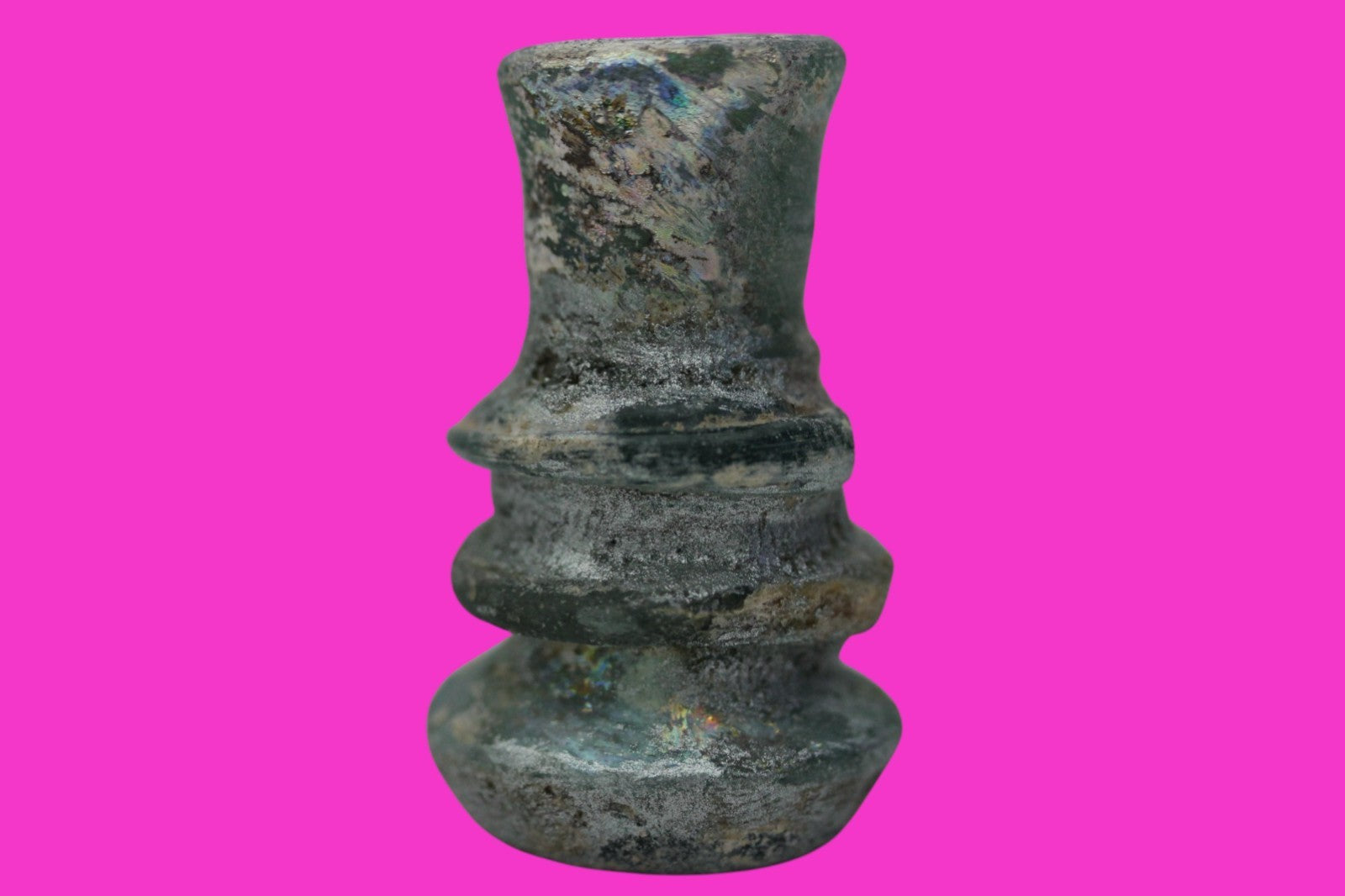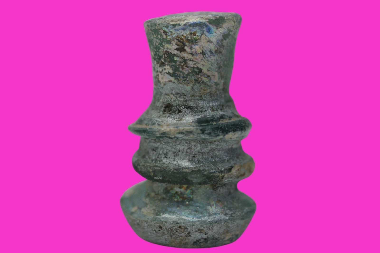 Dimensions: 2 ¼ inches tall, 1 inch wide, weighs 45 gramsProvenance: Ex. Private Miami, Florida collection. Acquired in the 1990’s. Acquired by John McIntosh, MSE, MBA, Ancient Artifacts & Treasures, Winter Park, Florida in 2017. Consigned to The Pre Columbian Collection on 7/03/2025.Description: Thick walled blue/green glass bottle. Used to hold perfumes, oils, or unguents for anointing the deceased. Encrustations indicative of several centuries of underground burial. Small rim chips, wear and tear consistent with age and everyday use. No repairs or restorations were found. Intact. Overall Excellent condition.