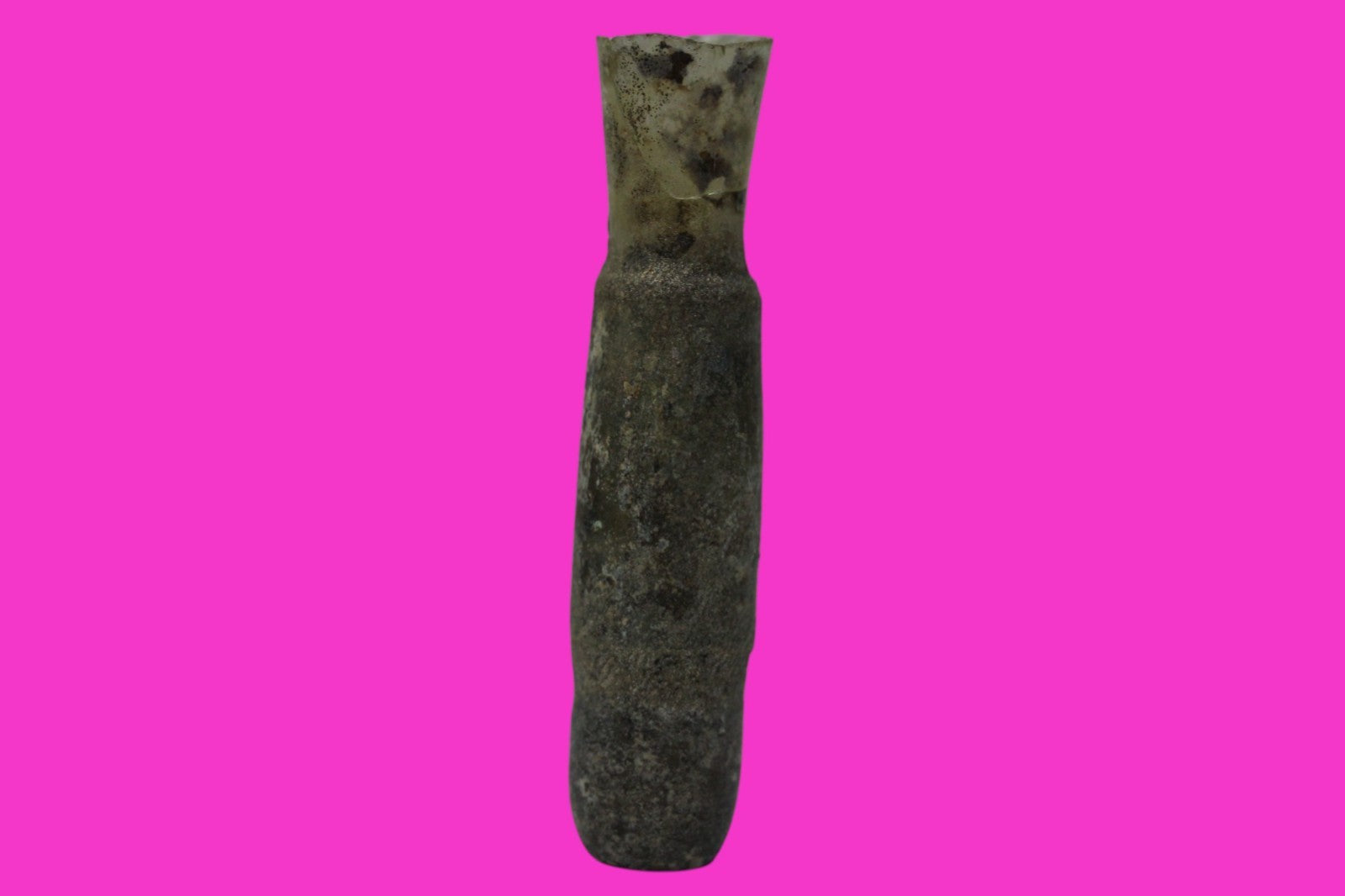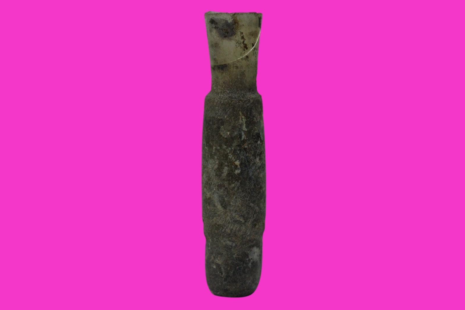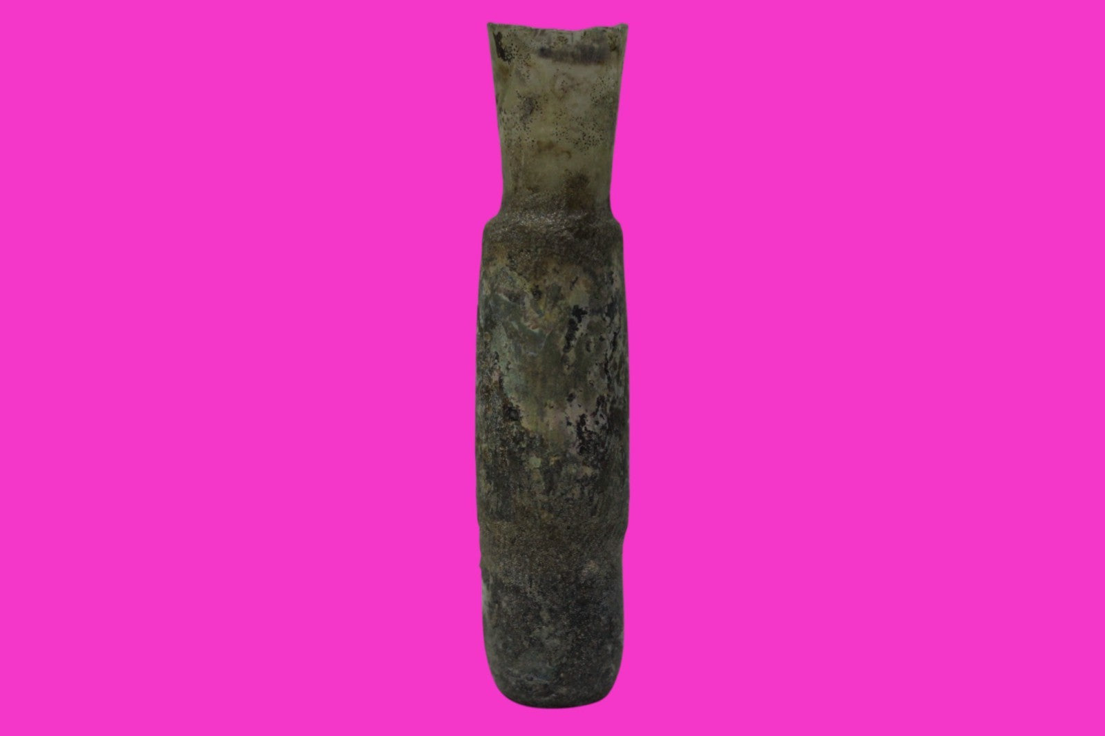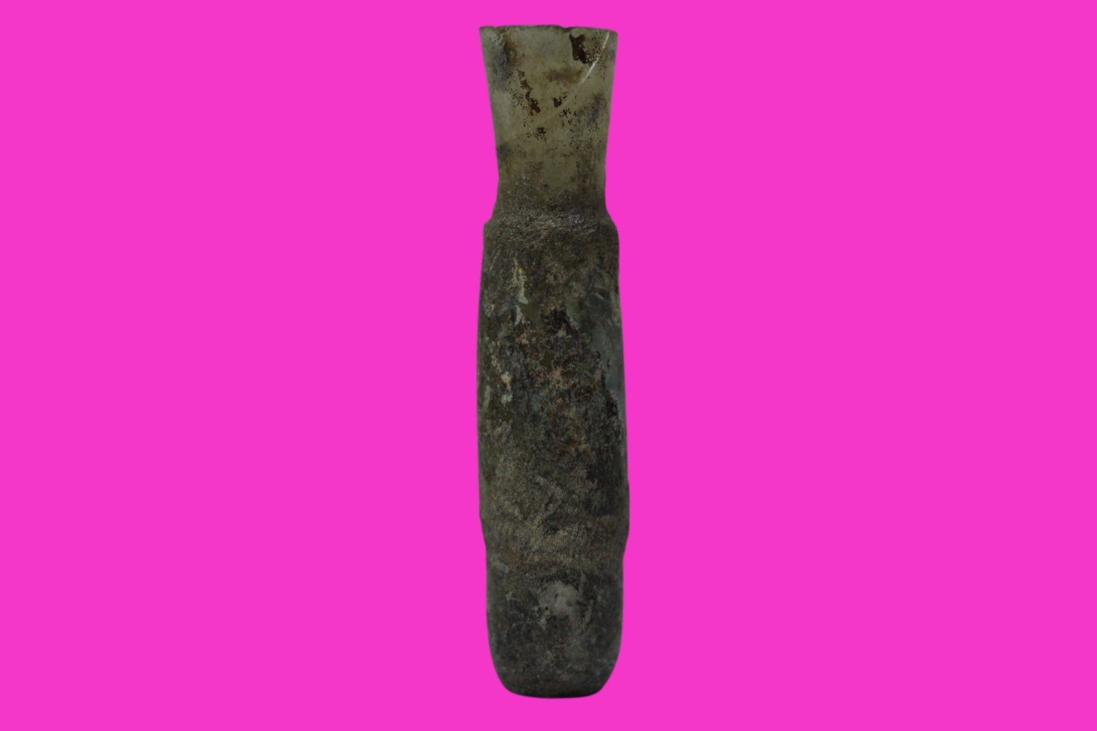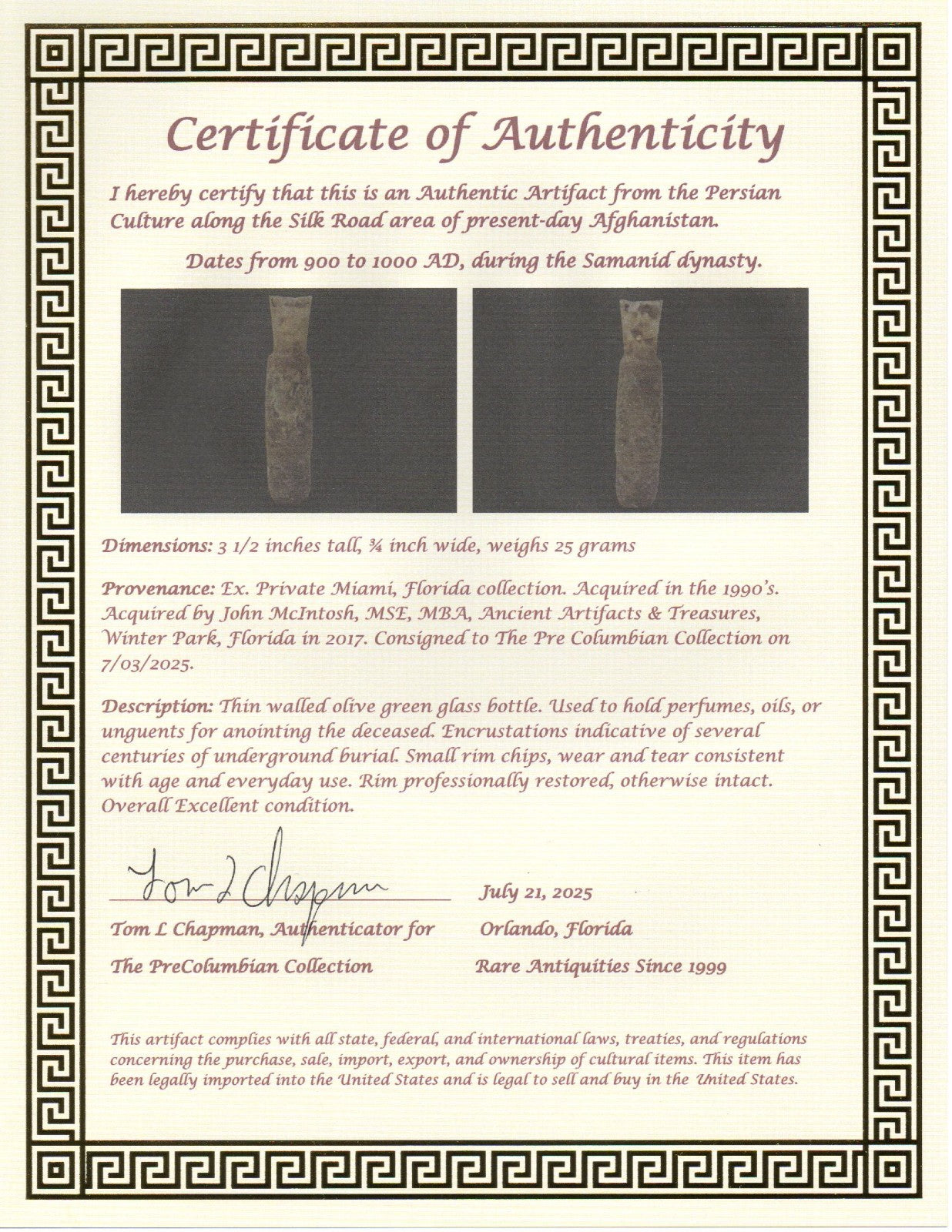 Dimensions: 3 1/2 inches tall, ¾ inch wide, weighs 25 gramsProvenance: Ex. Private Miami, Florida collection. Acquired in the 1990’s. Acquired by John McIntosh, MSE, MBA, Ancient Artifacts & Treasures, Winter Park, Florida in 2017. Consigned to The Pre Columbian Collection on 7/03/2025.Description: Thin walled olive green glass bottle. Used to hold perfumes, oils, or unguents for anointing the deceased. Encrustations indicative of several centuries of underground burial. Small rim chips, wear and tear consistent with age and everyday use. Rim professionally restored, otherwise intact. Overall Excellent condition.