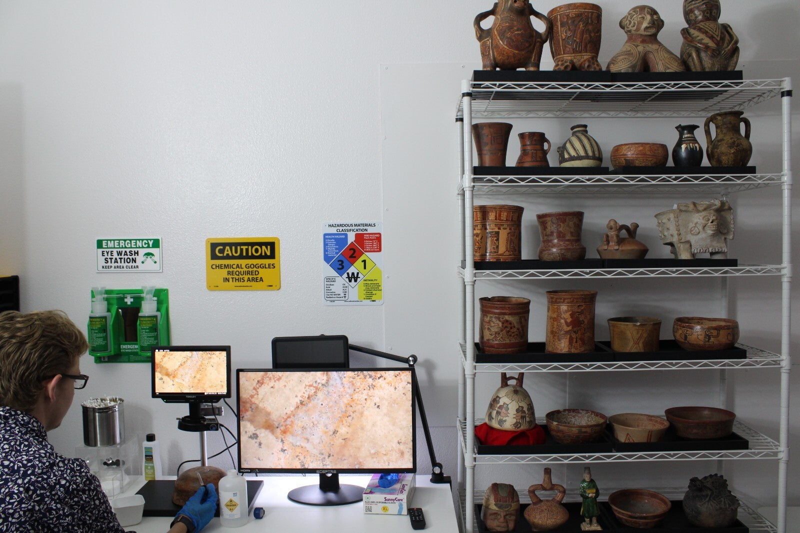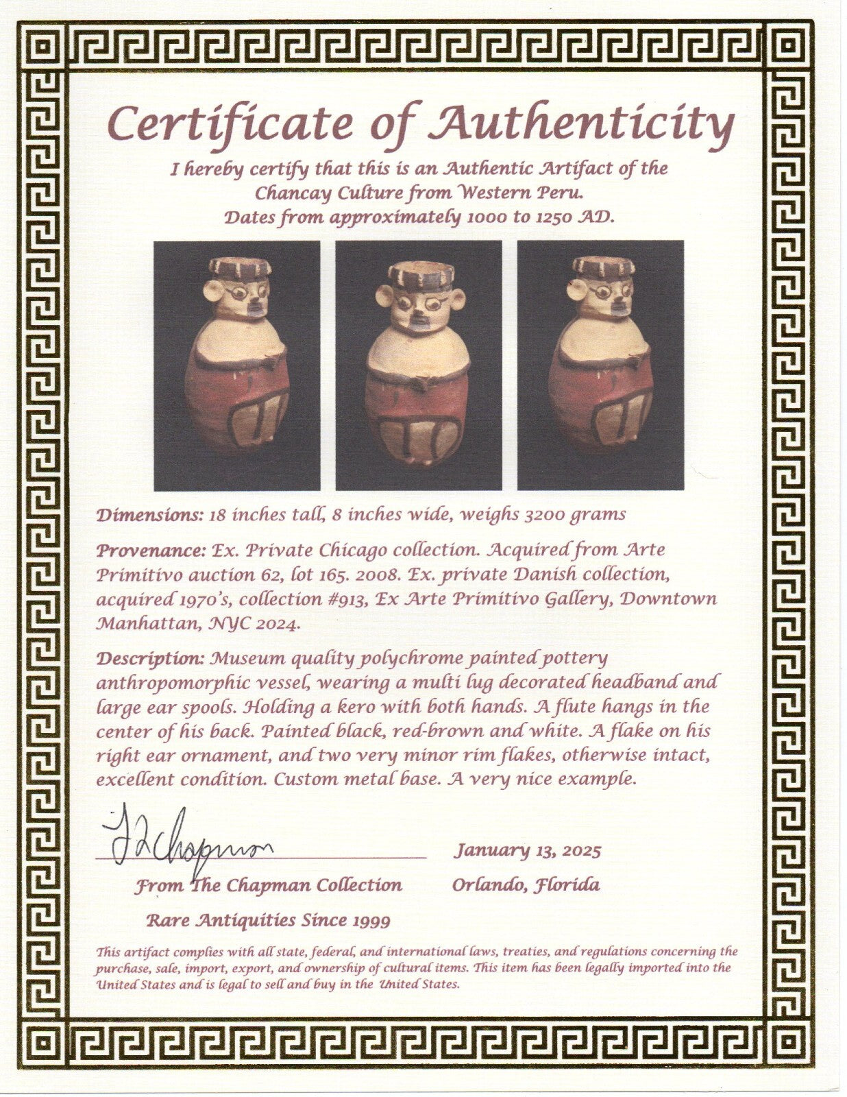Museum quality polychrome painted pottery anthropomorphic vessel, wearing a multi lug decorated headband and large ear spools. Holding a kero with both hands. A flute hangs in the center of his back. Painted black, red-brown and white. A flake on his right ear ornament, and two very minor rim flakes, otherwise intact, excellent condition. Custom metal base. A very nice example.