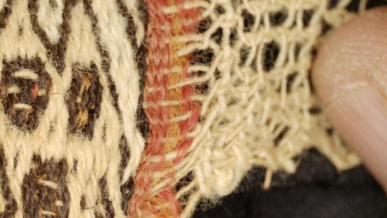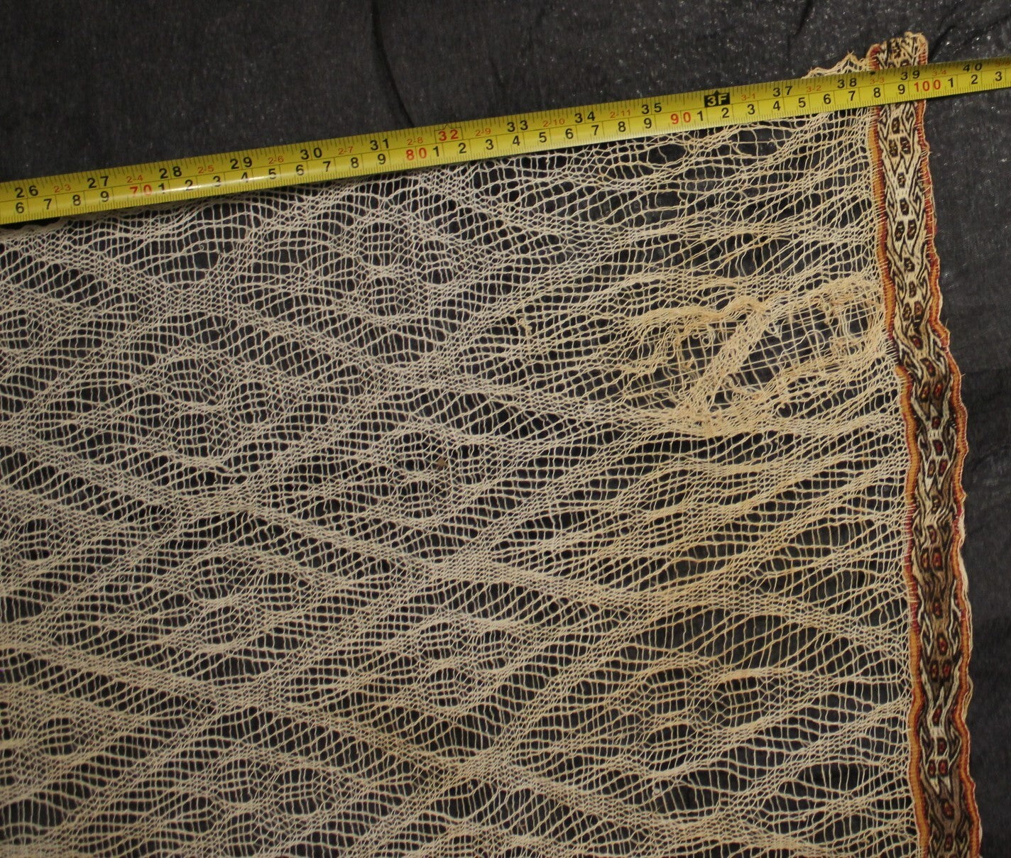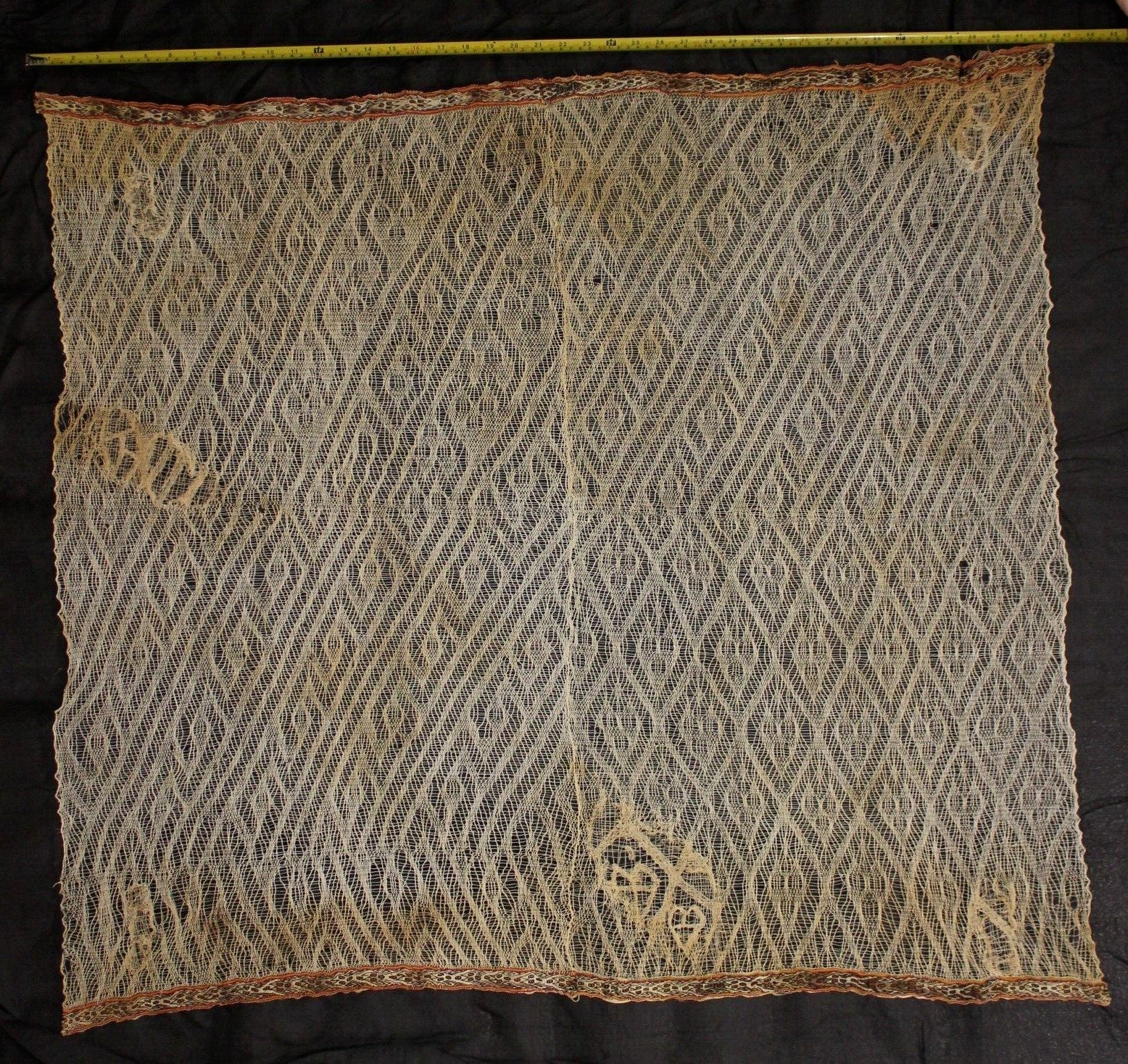 This stunning lace piece has an extremely rare feature that makes it stand out from other similar pieces. On two sides there is a colorful banded edge that appears to have images of feline spirits carefully weaved into it. The lace has been woven into the band meaning that the band was not added to the lace after it was woven. The lace and band were weaved together at the same time. This make this piece very rare and possibly unique. I have been unable to find comparable examples. See detailed pics. This has not been cleaned. It is loosely sewed to a black fabric and can easily be removed without damaging any of the lace threads. I think the heart shapes are old repairs. I have not stretched it to make it perfectly square for pictures because I am weary about handling delicate items. However it can be stretched to make a perfect square and framed without tearing any of the threads if you are careful. The frame it is in for taking pictures is NOT included