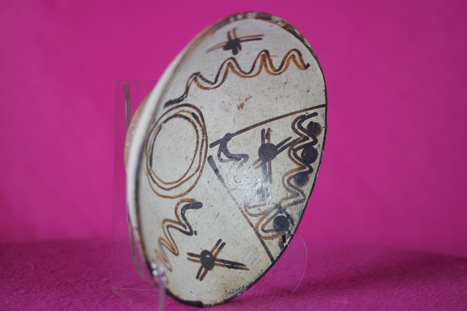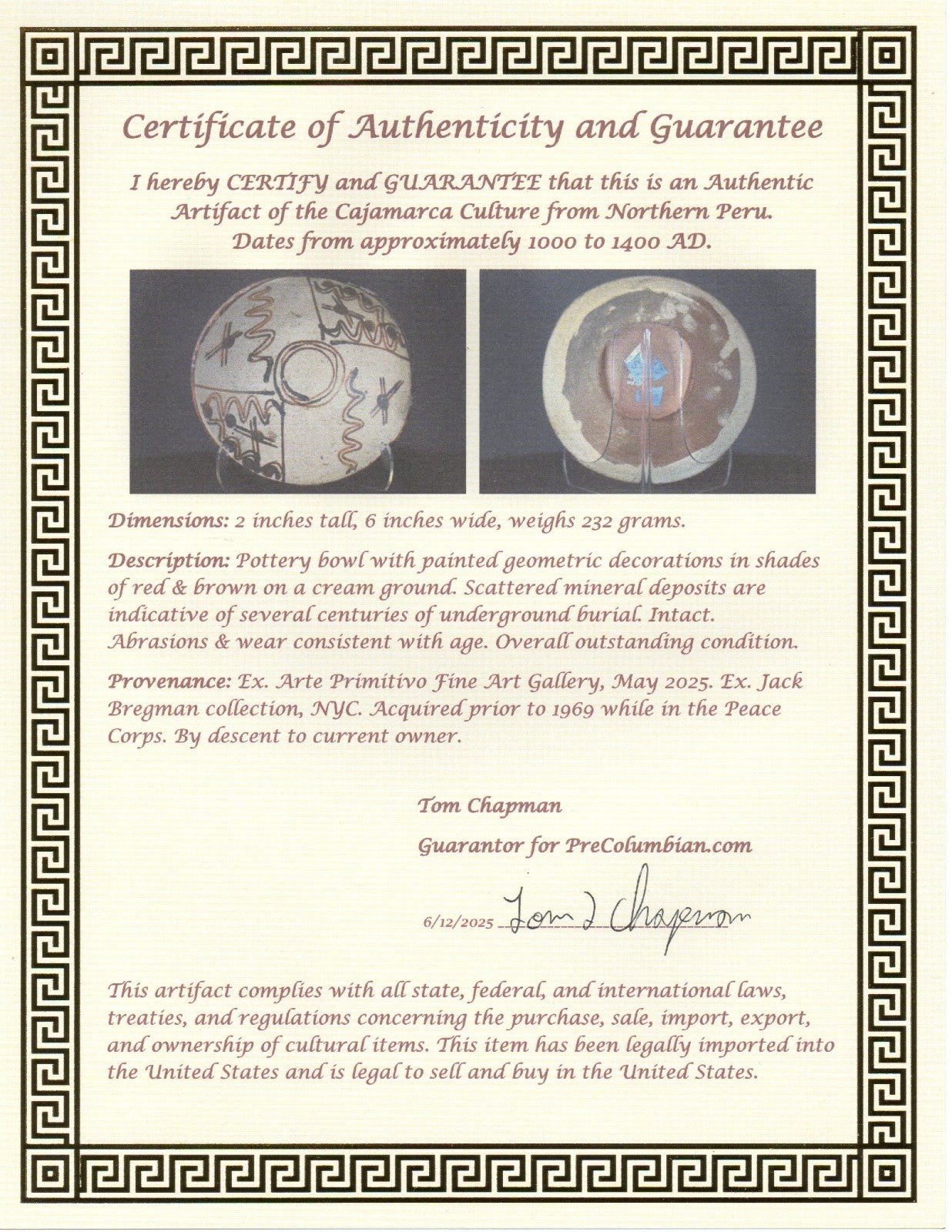 Dimensions: 2 inches tall, 6 inches wide, weighs 232 grams.Description: Pottery bowl with painted geometric decorations in shades of red & brown on a cream ground. Scattered mineral deposits are indicative of several centuries of underground burial. Intact. Abrasions & wear consistent with age. Overall outstanding condition.Provenance: Ex. Arte Primitivo Fine Art Gallery, May 2025. Ex. Jack Bregman collection, NYC. Acquired prior to 1969 while in the Peace Corps. By descent to current owner.