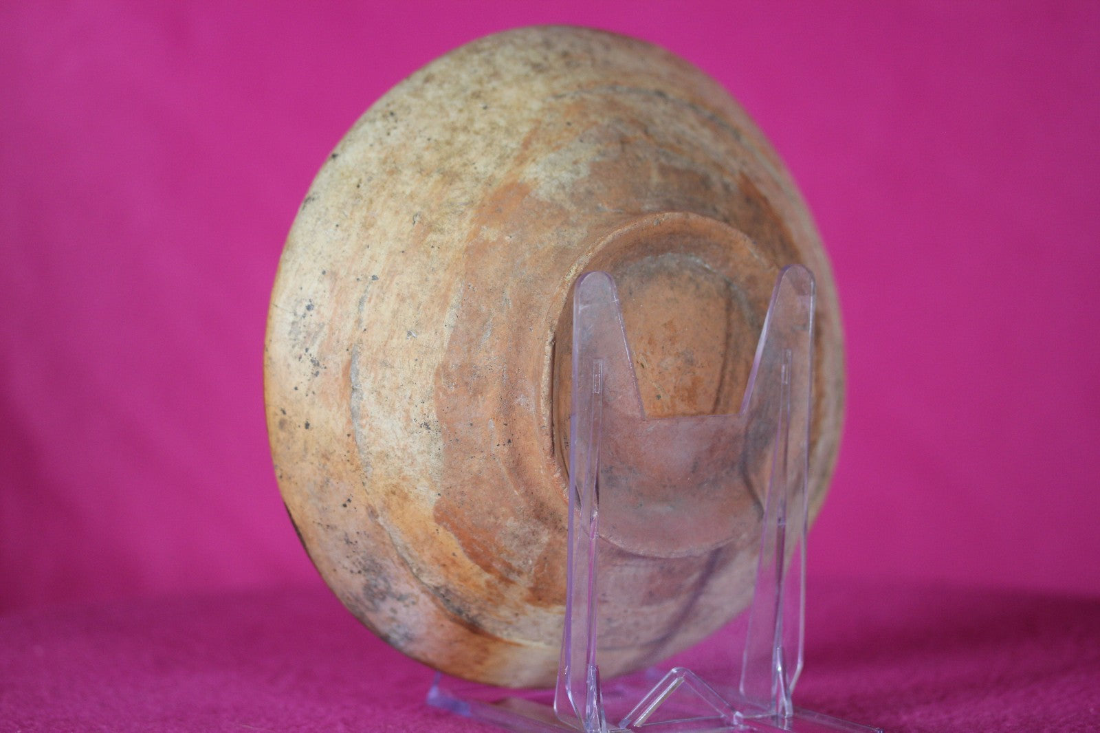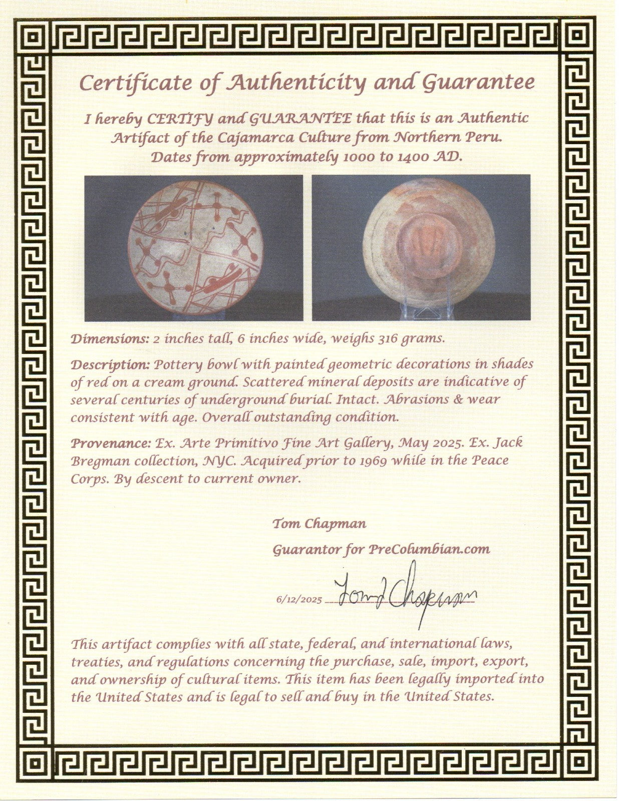 Dimensions: 2 inches tall, 6 inches wide, weighs 316 grams.Description: Pottery bowl with painted geometric decorations in shades of red on a cream ground. Scattered mineral deposits are indicative of several centuries of underground burial. Intact. Abrasions & wear consistent with age. Overall outstanding condition.Provenance: Ex. Arte Primitivo Fine Art Gallery, May 2025. Ex. Jack Bregman collection, NYC. Acquired prior to 1969 while in the Peace Corps. By descent to current owner.