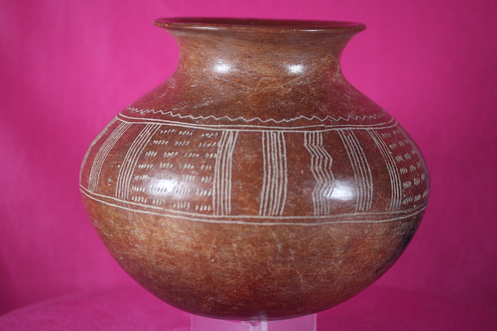 Museum quality red-orange color pottery storage jar having a bulbous body, wide mouth and flared rim. Decorated with a wide body band of incised linear and stippled geometric decoration. Repaired from approximately six large original pieces with restoration over the break lines.