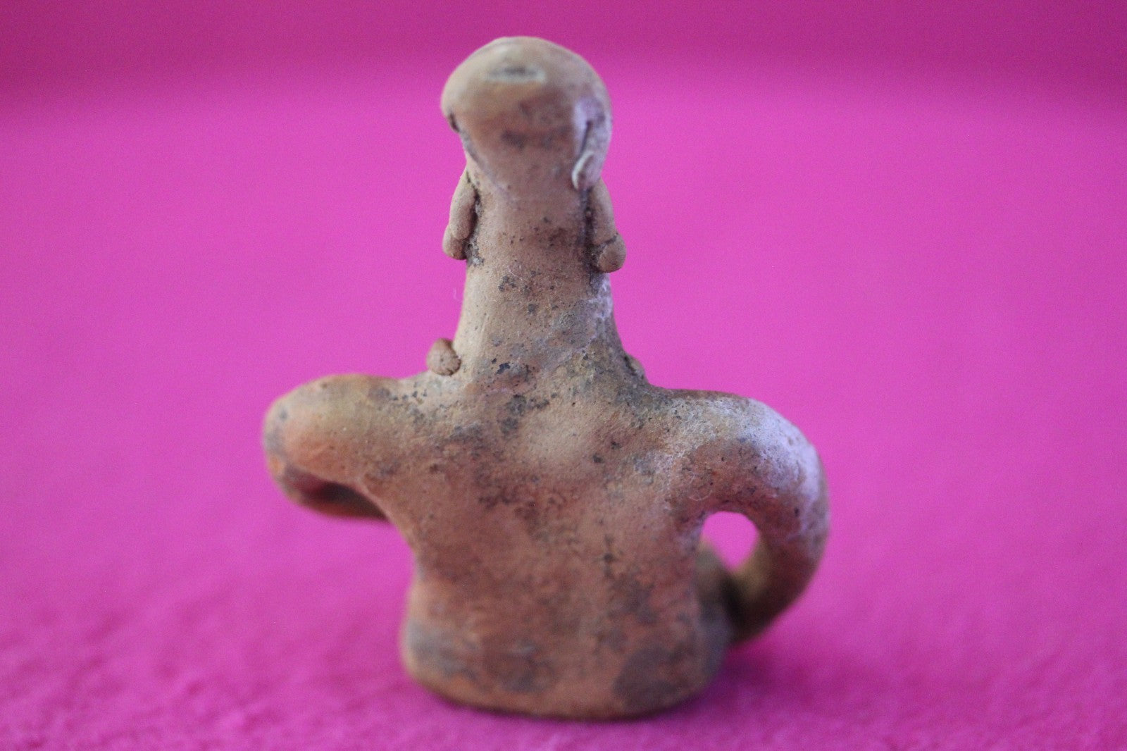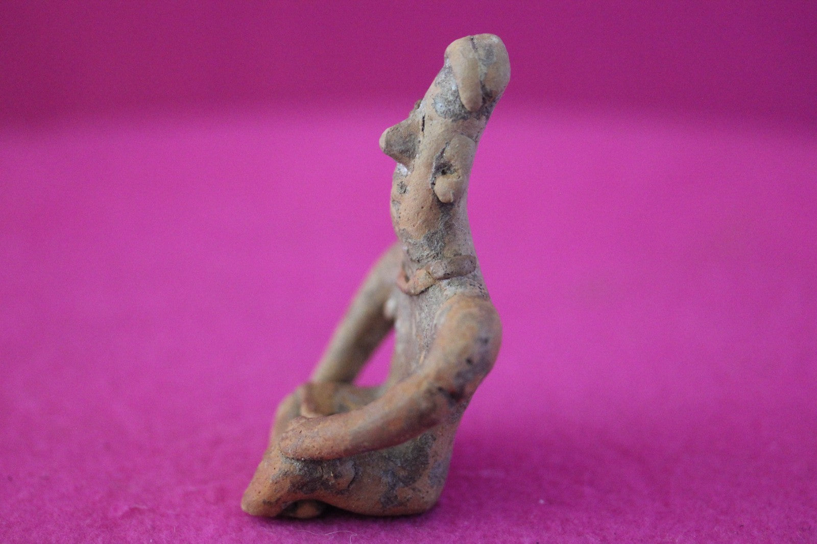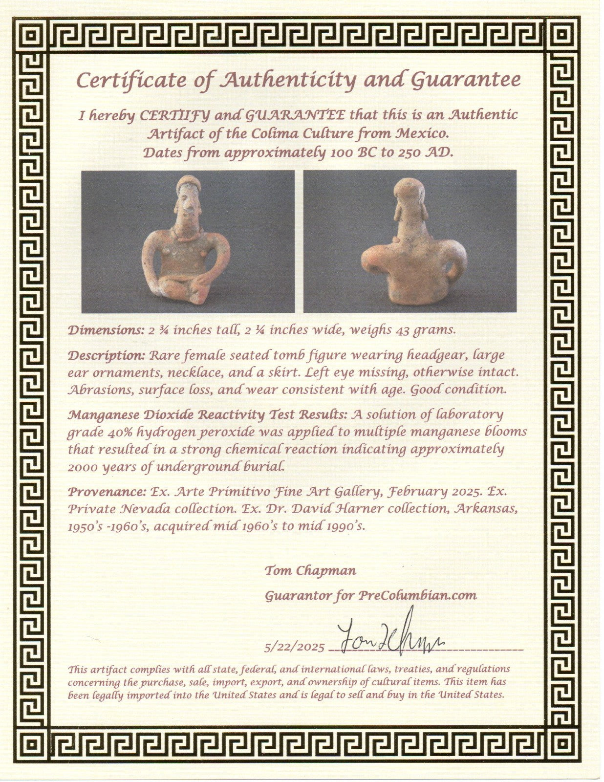 Dimensions: 2 ¾ inches tall, 2 ¼ inches wide, weighs 43 grams.Description: Rare female seated tomb figure wearing headgear, large ear ornaments, necklace, and a skirt. Left eye missing, otherwise intact. Abrasions, surface loss, and wear consistent with age. Good condition.Manganese Dioxide Reactivity Test Results: A solution of laboratory grade 40% hydrogen peroxide was applied to multiple manganese blooms that resulted in a strong chemical reaction indicating approximately 2000 years of underground burial.Provenance: Ex. Arte Primitivo Fine Art Gallery, February 2025. Ex. Private Nevada collection. Ex. Dr. David Harner collection, Arkansas, 1950’s -1960’s, acquired mid 1960’s to mid 1990’s.