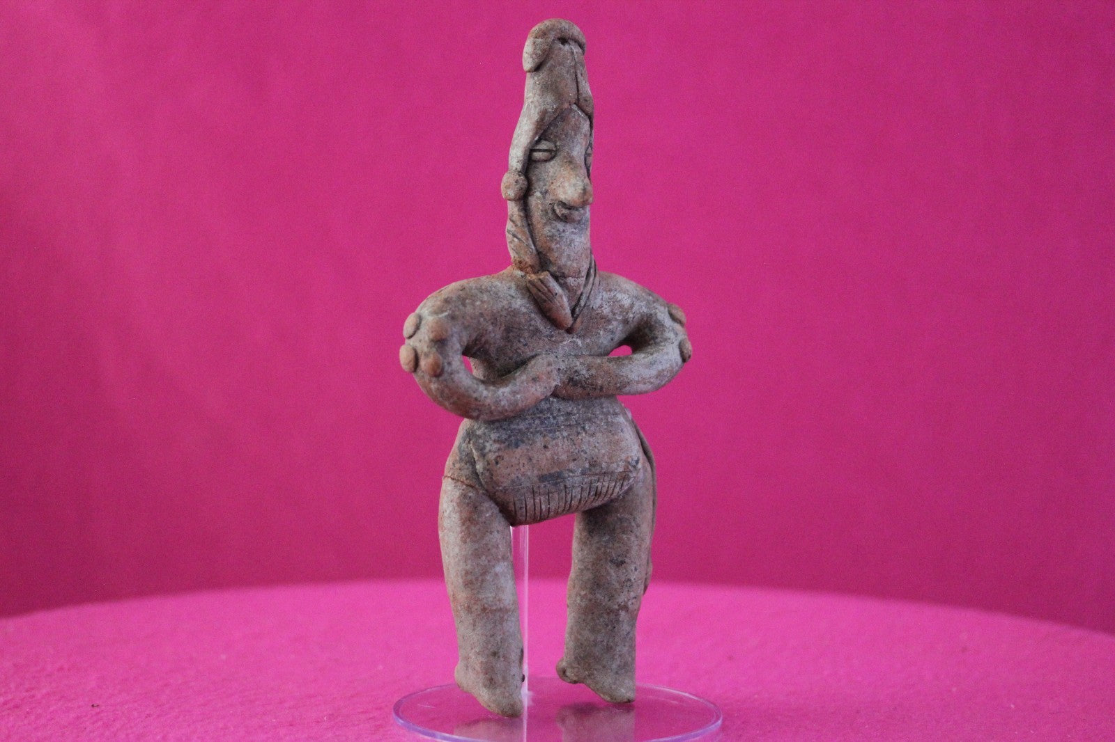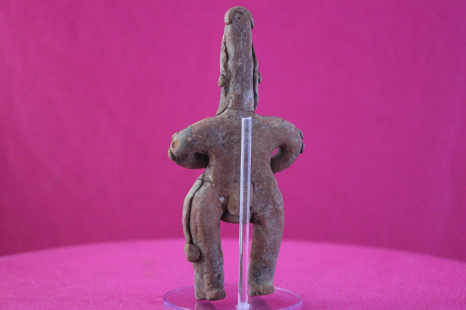 Dimensions: 7 ¼ inches tall, 3 ½ inches wide, weighs 218 grams.Description: Rare large female Shaman tomb figure wearing headgear, and a loin cloth with a tassel. Large nodes on both elbows. Arms folded over chest. Legs and head reattached, otherwise intact. Abrasions, wear consistent with age. Overall great condition.Manganese Dioxide Reactivity Test Results: A solution of laboratory grade 40% hydrogen peroxide was applied to multiple manganese blooms that resulted in a strong chemical reaction indicating approximately 2000 years of underground burial.Provenance: Ex. Arte Primitivo Fine Art Gallery, February 2025. Ex. Private Nevada collection. Ex. Dr. David Harner collection, Arkansas, 1950’s -1960’s, acquired mid 1960’s to mid 1990’s.