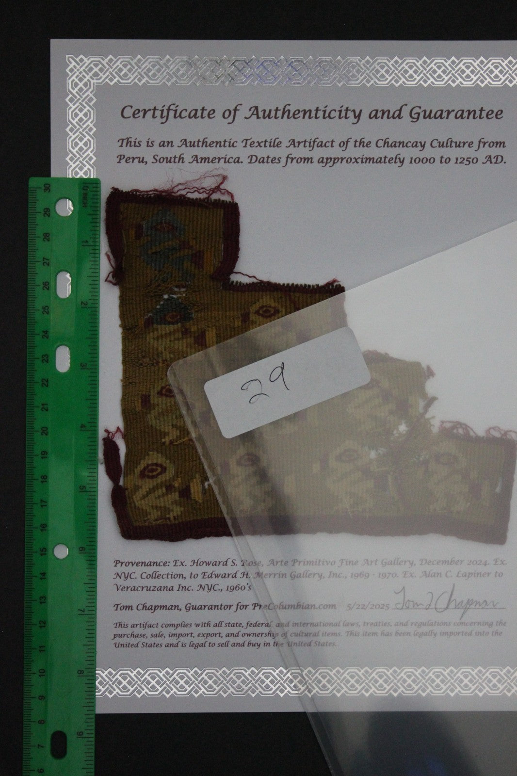 This is an Authentic Textile Artifact of the Chancay Culture from Peru, South America. Dates from approximately 1000 to 1250 AD.Provenance: Ex. Howard S. Rose, Arte Primitivo Fine Art Gallery, December 2024. Ex. NYC. Collection, to Edward H. Merrin Gallery, Inc., 1969 - 1970. Ex. Alan C. Lapiner to Veracruzana Inc. NYC., 1960’s