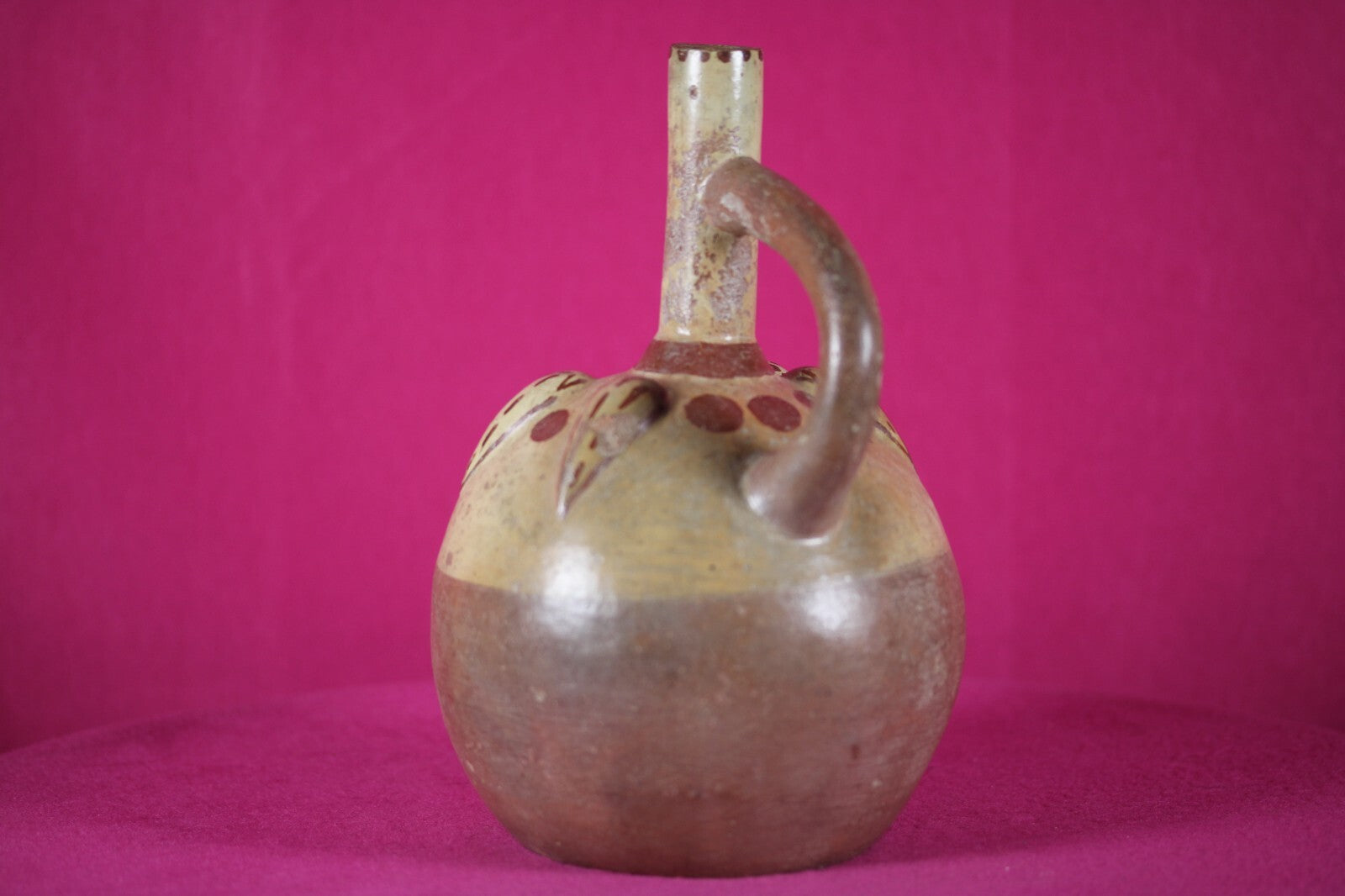 Museum Quality. Pottery bottle having a stirrup type spout, bulbous body painted cream ground with red-brown painted large bulbous fruit, hanging by stems at the top of the faux bottle neck. Some scattered wear to the painted surface, spout repaired; repainted and reattached. Some repairs and repainting to the fruit and body. A rare type.Provenance: Ex. Ben and Christine Johnson collection, CA. Acquired 1960’s. To family by descent.