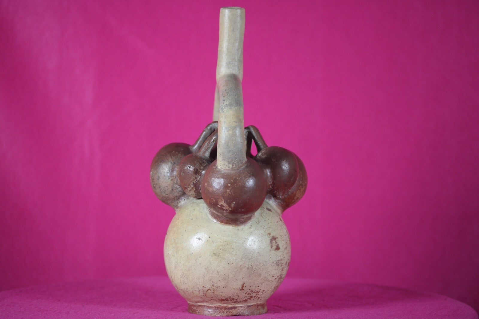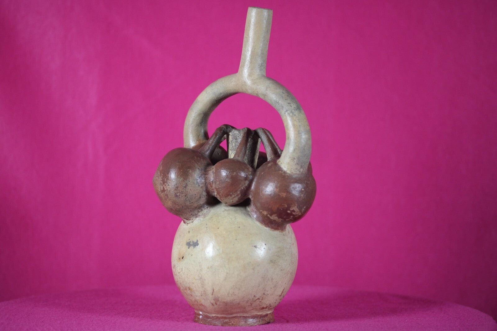 Museum Quality. Pottery bottle having a stirrup type spout, bulbous body painted cream ground with red-brown painted large bulbous fruit, hanging by stems at the top of the faux bottle neck. Some scattered wear to the painted surface, spout repaired; repainted and reattached. Some repairs and repainting to the fruit and body. A rare type.Provenance: Ex. Ben and Christine Johnson collection, CA. Acquired 1960’s. To family by descent.