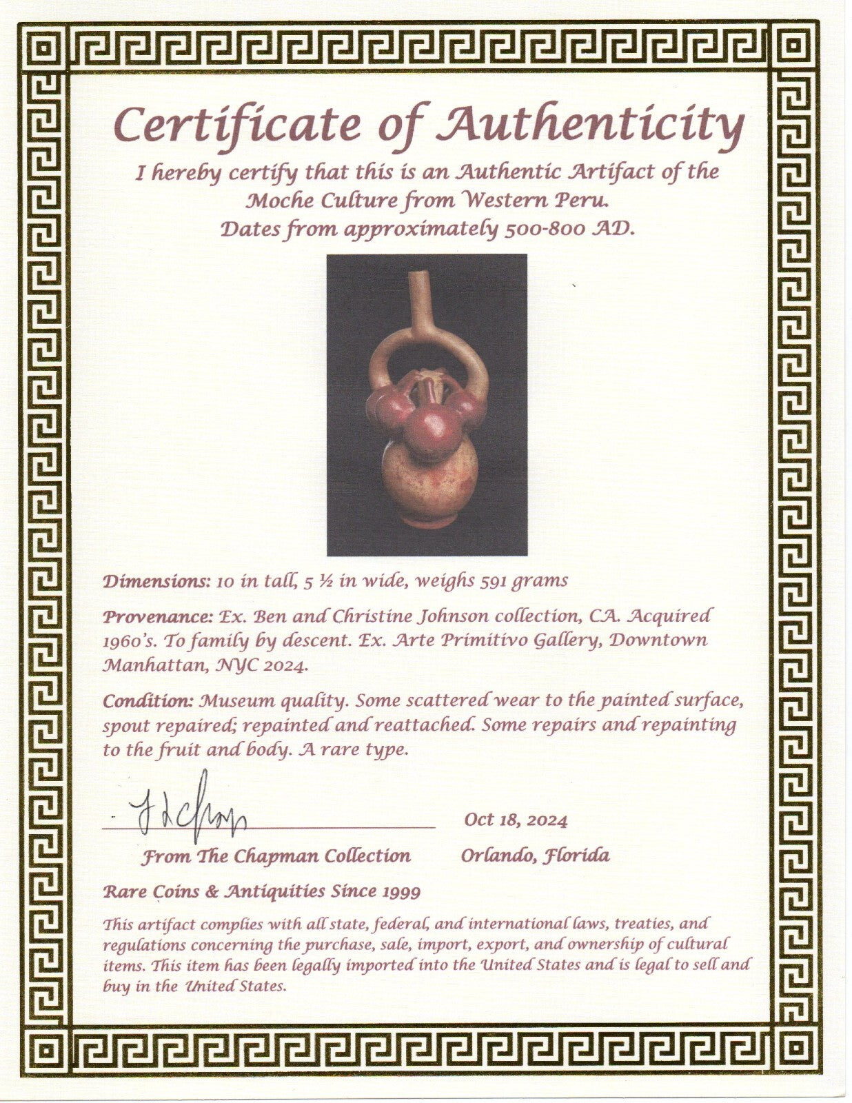 PROVENANCE 1: Ex. Ben and Christine Johnson collection, CA. Acquired 1960’s.