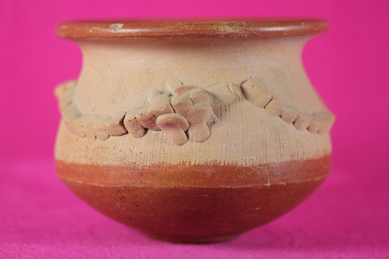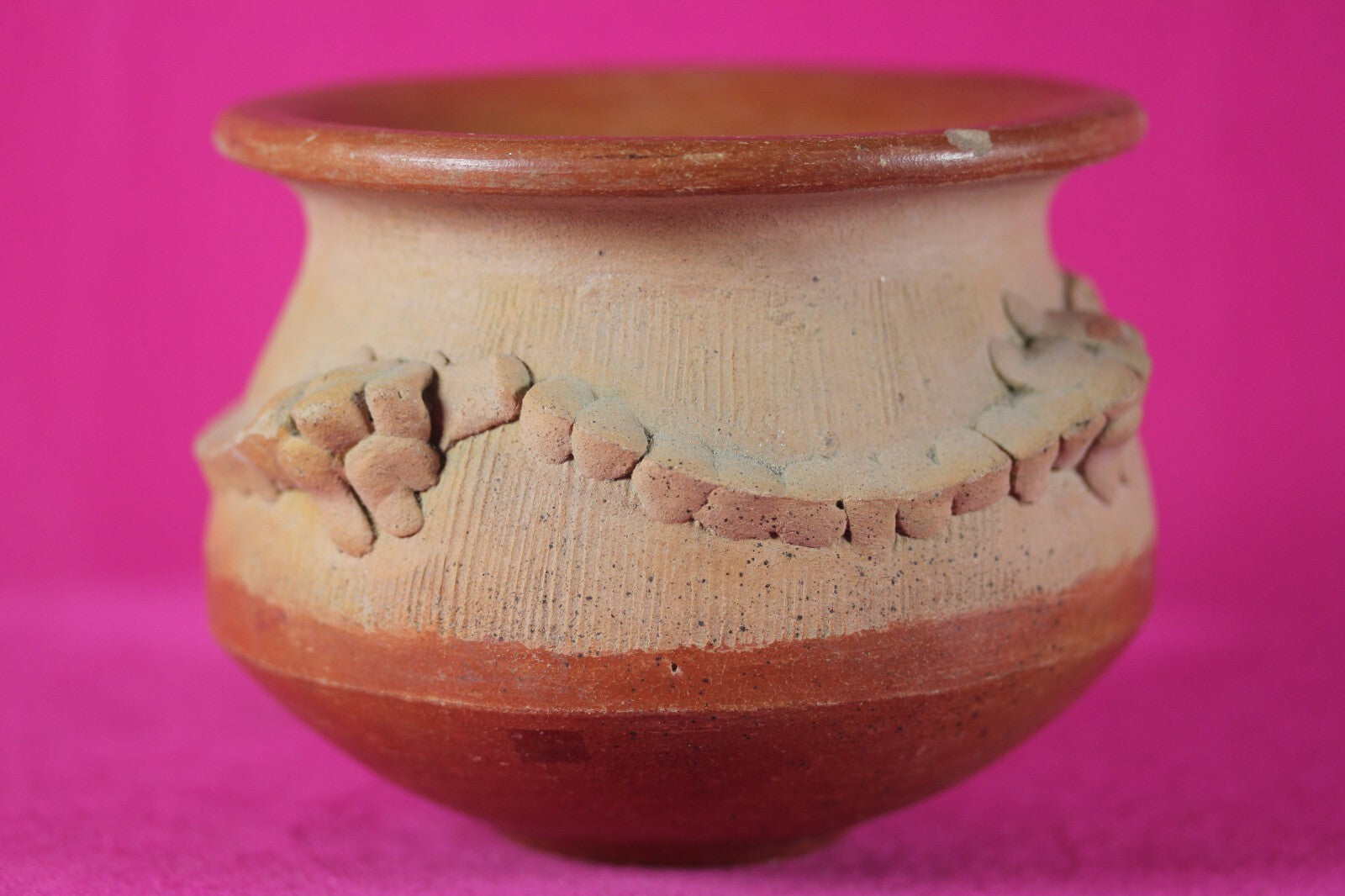 Rare Museum Quality orange and tan vessel decorated in relief with three long tailed lizards. Minor rim flake, otherwise intact.