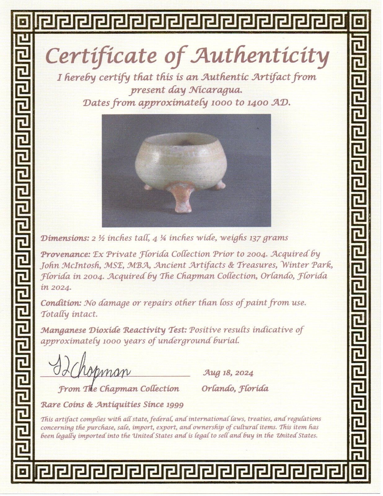 Provenance: Ex Private Florida Collection Prior to 2004. Acquired by John McIntosh, MSE, MBA, Ancient Artifacts & Treasures, Winter Park, Florida in 2024. Acquired by The Chapman Collection, Orlando, Florida in 2024. Condition: No damage or repairs other than loss of paint from use. Totally intact.Manganese Dioxide Reactivity Test: Positive results indicative of approximately 1000 years of underground burial.