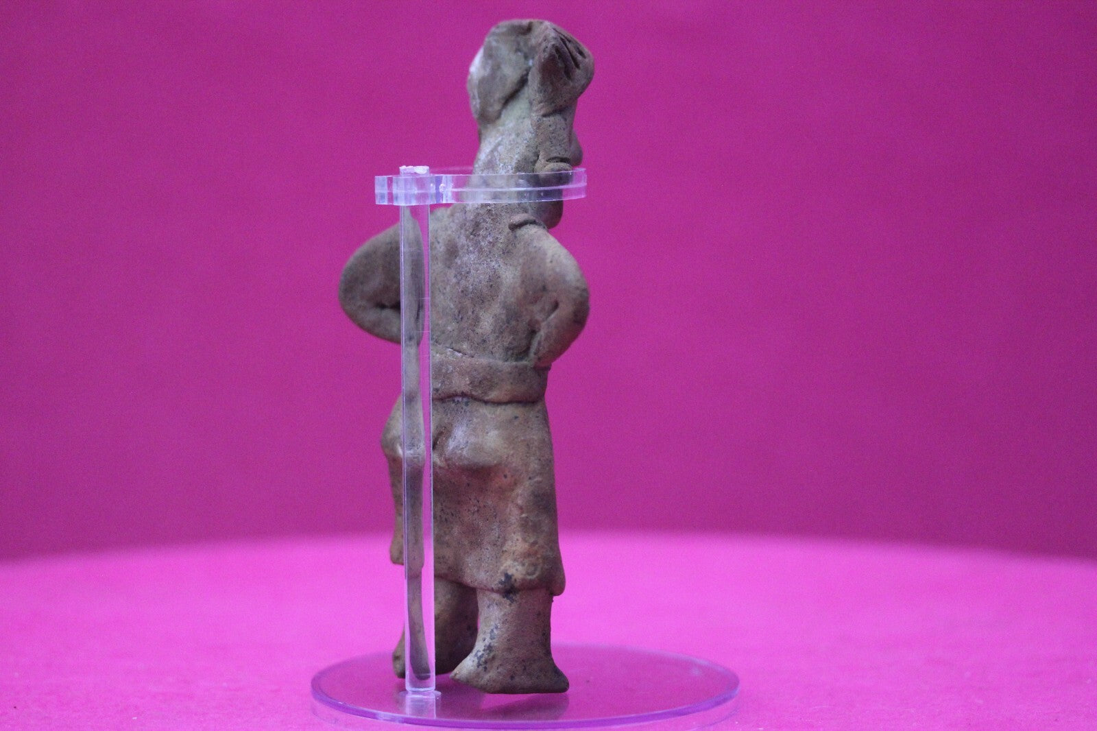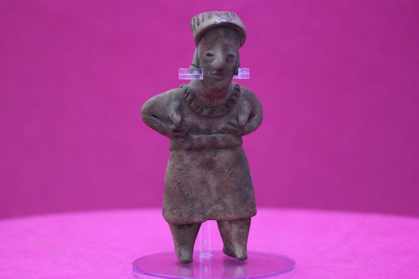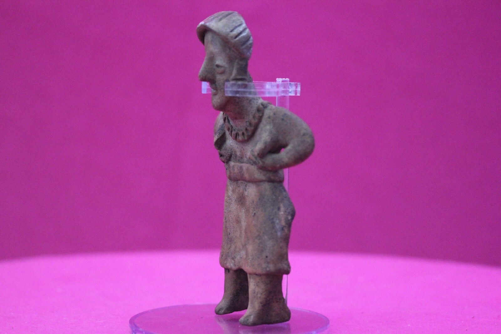 Dimensions: 5 ¼ inches tall, 2 ¾ inches wide, weighs 126 grams.Description: Rare elderly lady tomb figure with ear spools, wearing a skirt, elaborate necklace, and a headwrap. Leaning forward as if suffering from back pain. Minor abrasions, otherwise intact. Overall excellent condition.Provenance: Ex. Arte Primitivo Fine Art Gallery, February 2025. Ex. Private Nevada collection. Ex. Dr. David Harner collection, Arkansas, 1950’s -1960’s, acquired mid 1960’s to mid 1990’s.