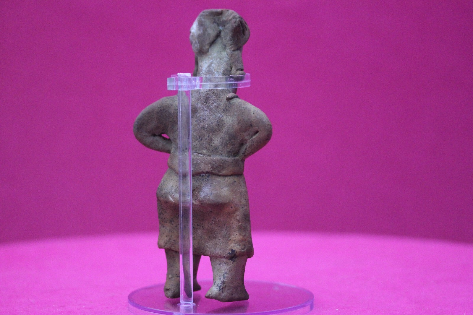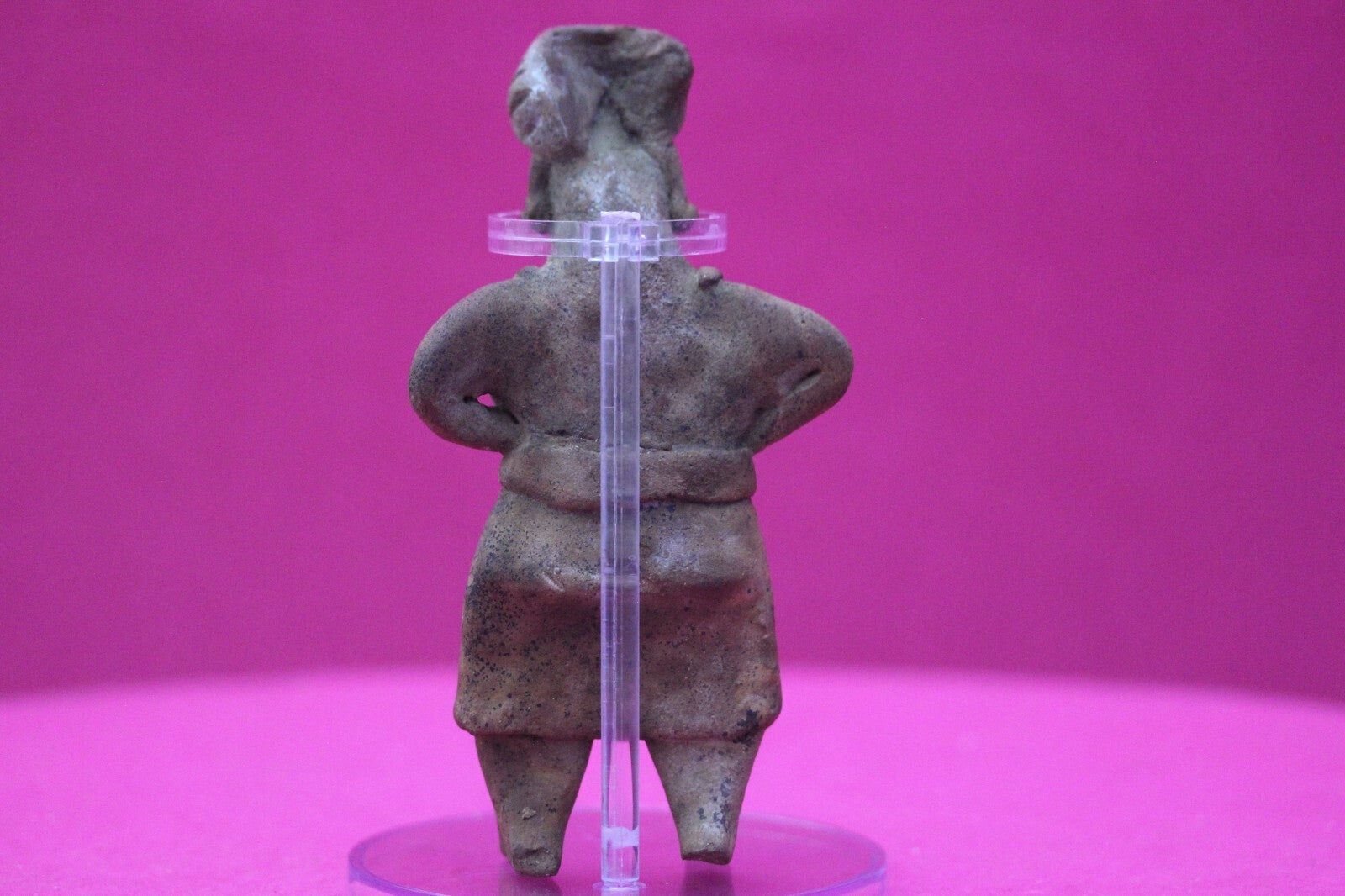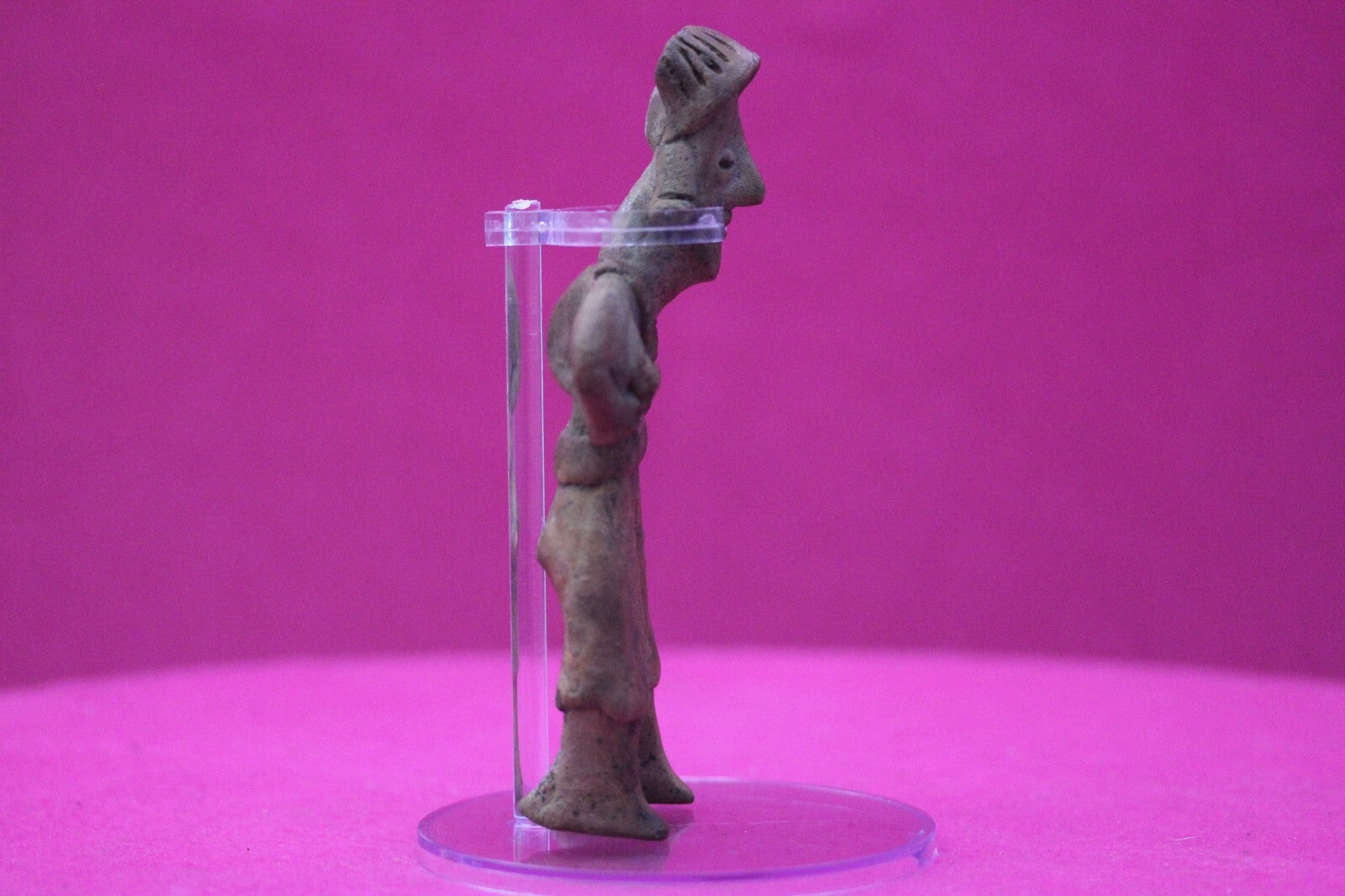 Dimensions: 5 ¼ inches tall, 2 ¾ inches wide, weighs 126 grams.Description: Rare elderly lady tomb figure with ear spools, wearing a skirt, elaborate necklace, and a headwrap. Leaning forward as if suffering from back pain. Minor abrasions, otherwise intact. Overall excellent condition.Provenance: Ex. Arte Primitivo Fine Art Gallery, February 2025. Ex. Private Nevada collection. Ex. Dr. David Harner collection, Arkansas, 1950’s -1960’s, acquired mid 1960’s to mid 1990’s.