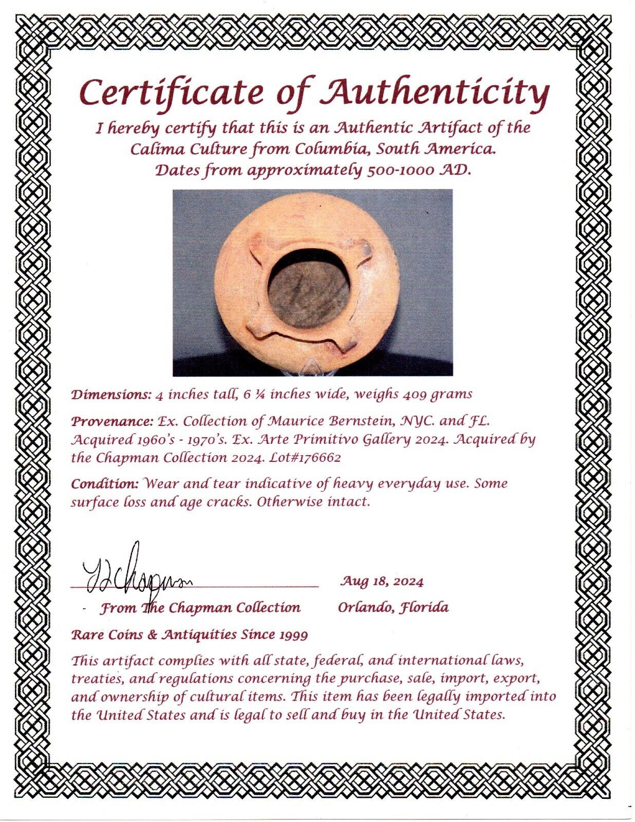 Authentic Pre Columbian Artifact Olla Jar Calima Ex Arte Primitivo COA T89
