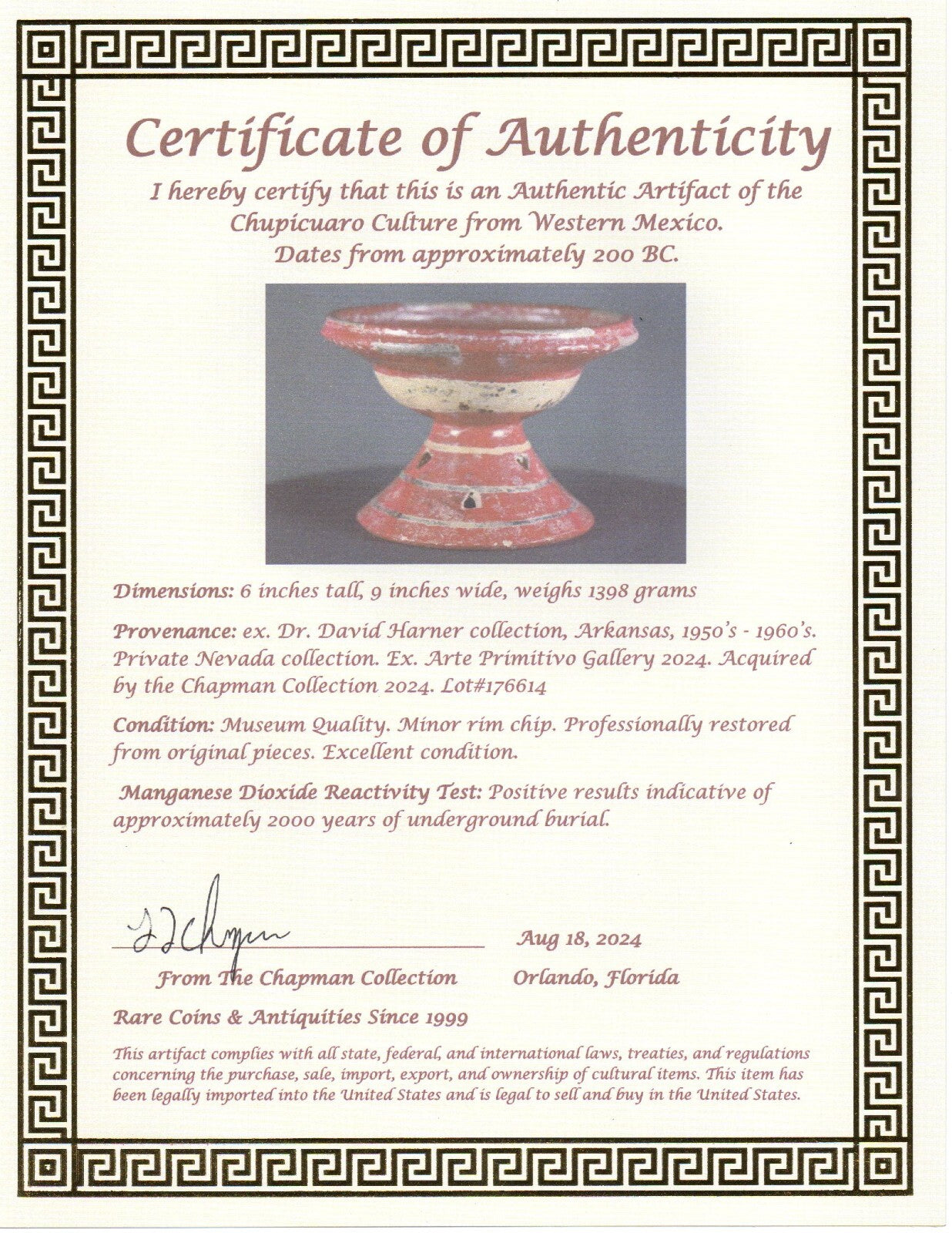 Museum Quality. Acquired from the world renowned Arte Primitivo Gallery in Downtown Manhattan, New York City. This is the most prestigious gallery of ancient artifacts in the United States. Artifacts from Arte Primitivo are the most sought after in the world. They are instantly recognized and respected by antiquities dealers and collectors alike as being the best of the best. Artifacts that are authenticated by Arte Primitivo instantly increase in value due to their expertise and decades of experience. They are the go to experts when it comes to ancient art. Provenance: ex. Dr. David Harner collection, Arkansas, 1950’s - 1960’s. Private Nevada collection. Ex. Arte Primitivo Gallery 2024. Acquired by the Chapman Collection 2024. Lot#176614Condition: Museum Quality. Minor rim chip. Professionally restored from original pieces. Excellent condition. Manganese Dioxide Reactivity Test: Positive results indicative of approximately 2000 years of underground burial.