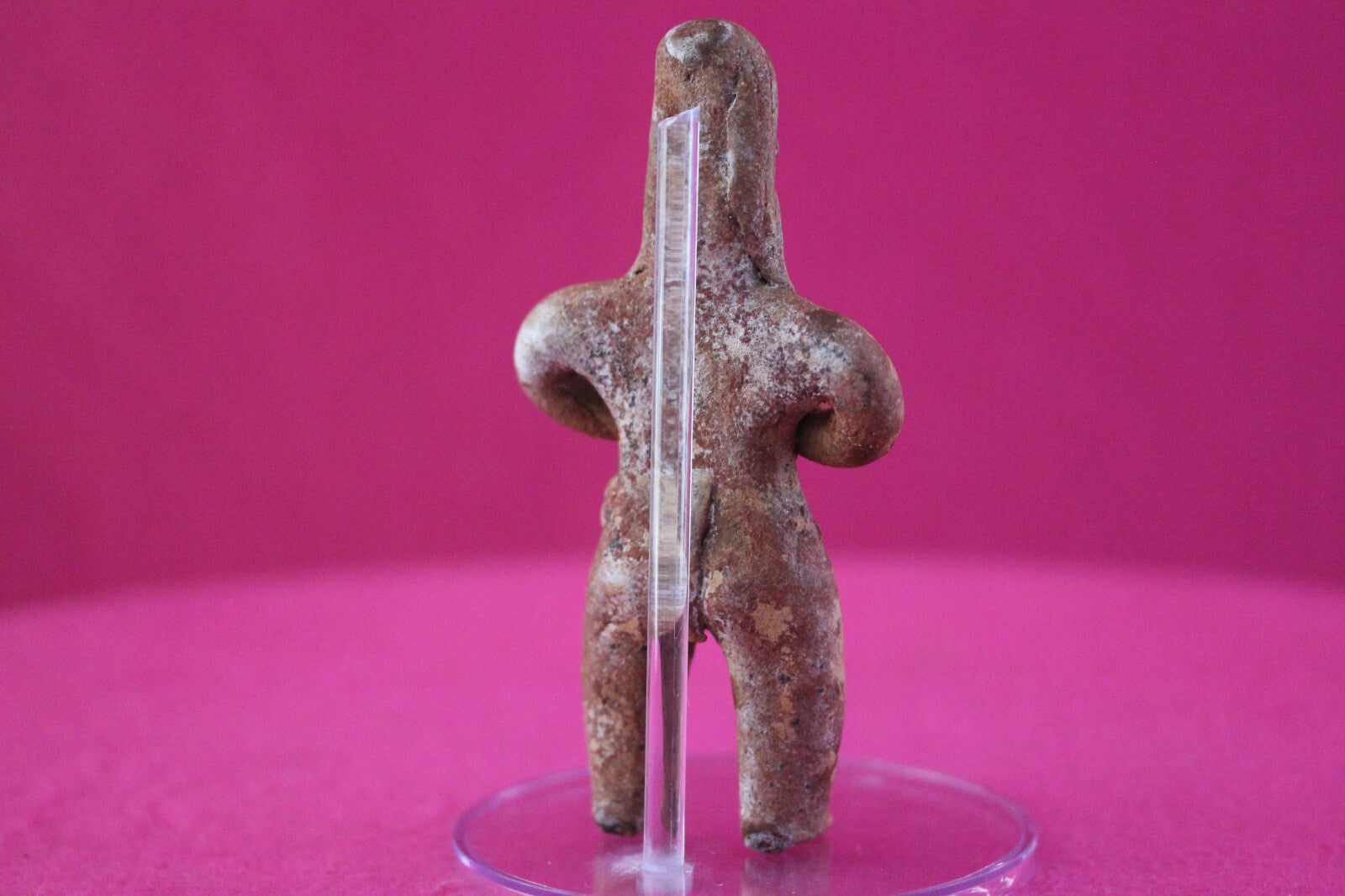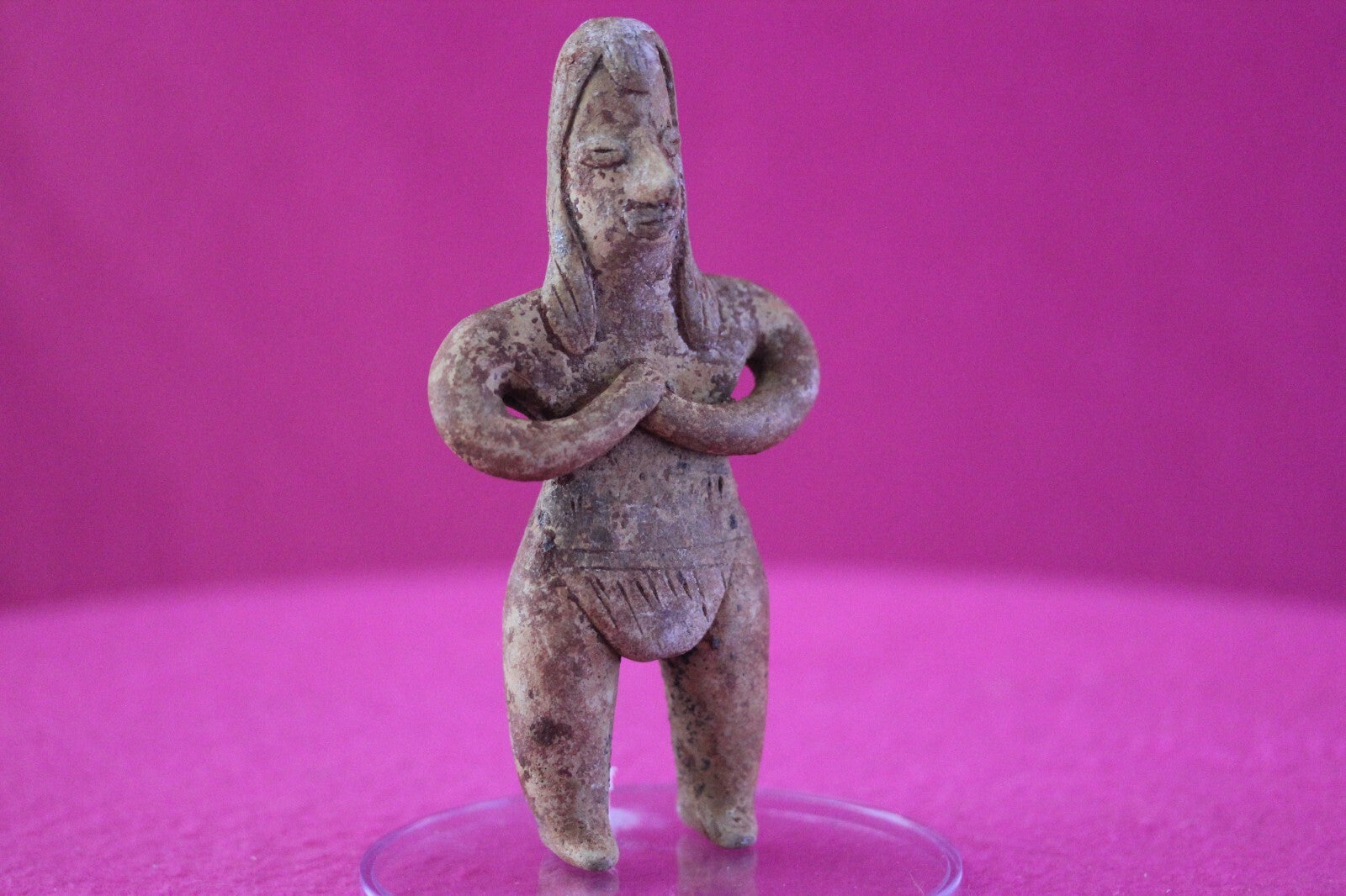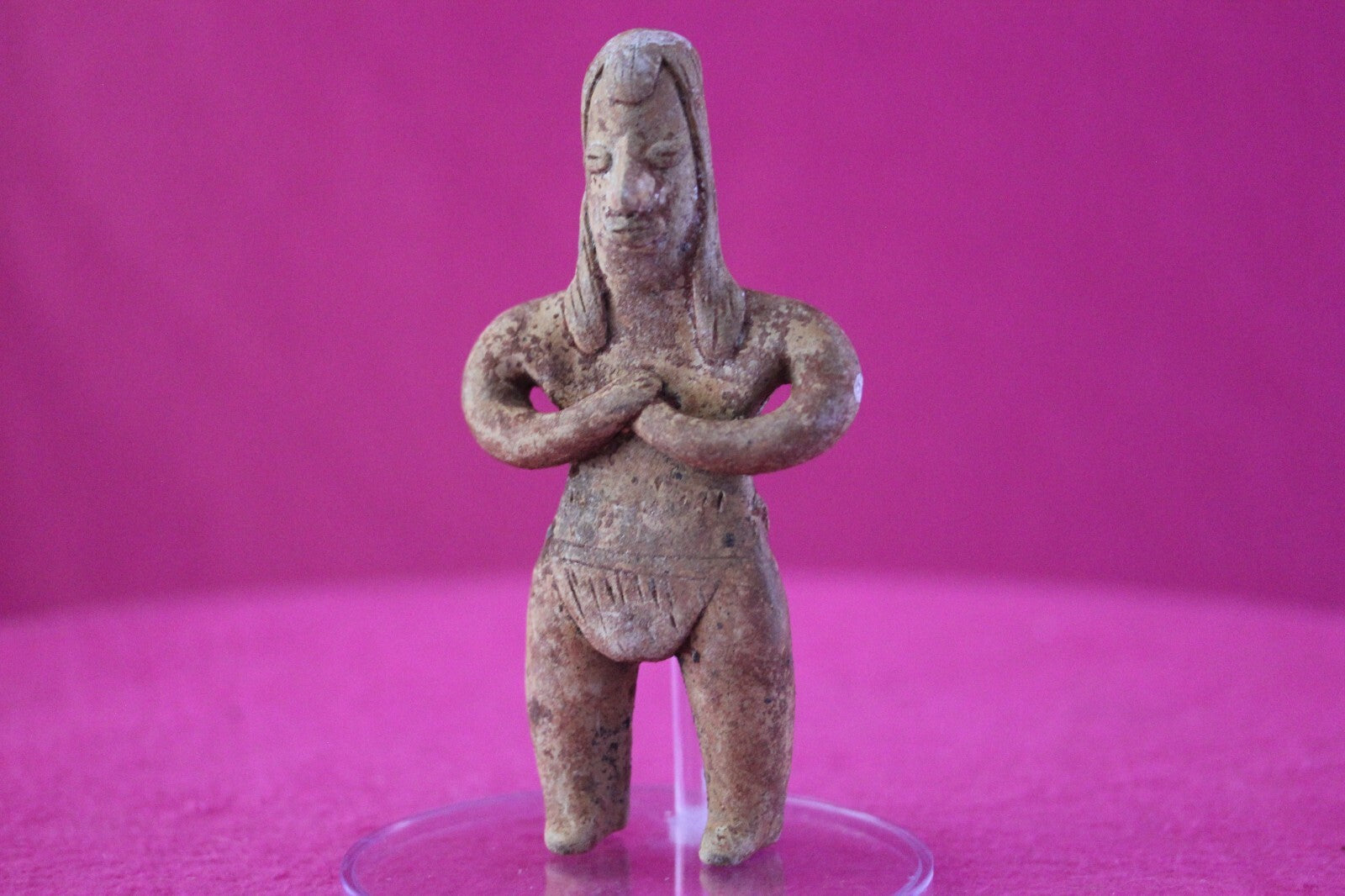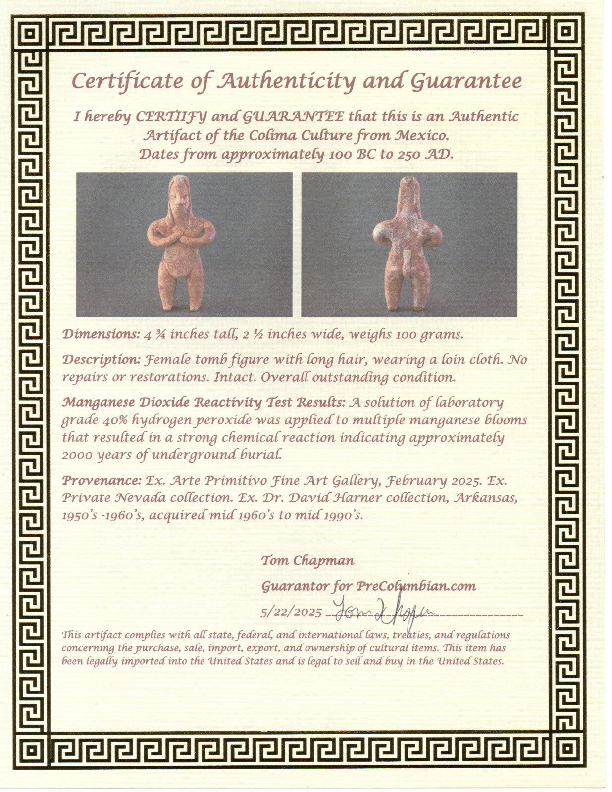 Dimensions: 4 ¾ inches tall, 2 ½ inches wide, weighs 100 grams.Description: Female tomb figure with long hair, wearing a loin cloth. No repairs or restorations. Intact. Overall outstanding condition.Manganese Dioxide Reactivity Test Results: A solution of laboratory grade 40% hydrogen peroxide was applied to multiple manganese blooms that resulted in a strong chemical reaction indicating approximately 2000 years of underground burial.Provenance: Ex. Arte Primitivo Fine Art Gallery, February 2025. Ex. Private Nevada collection. Ex. Dr. David Harner collection, Arkansas, 1950’s -1960’s, acquired mid 1960’s to mid 1990’s.