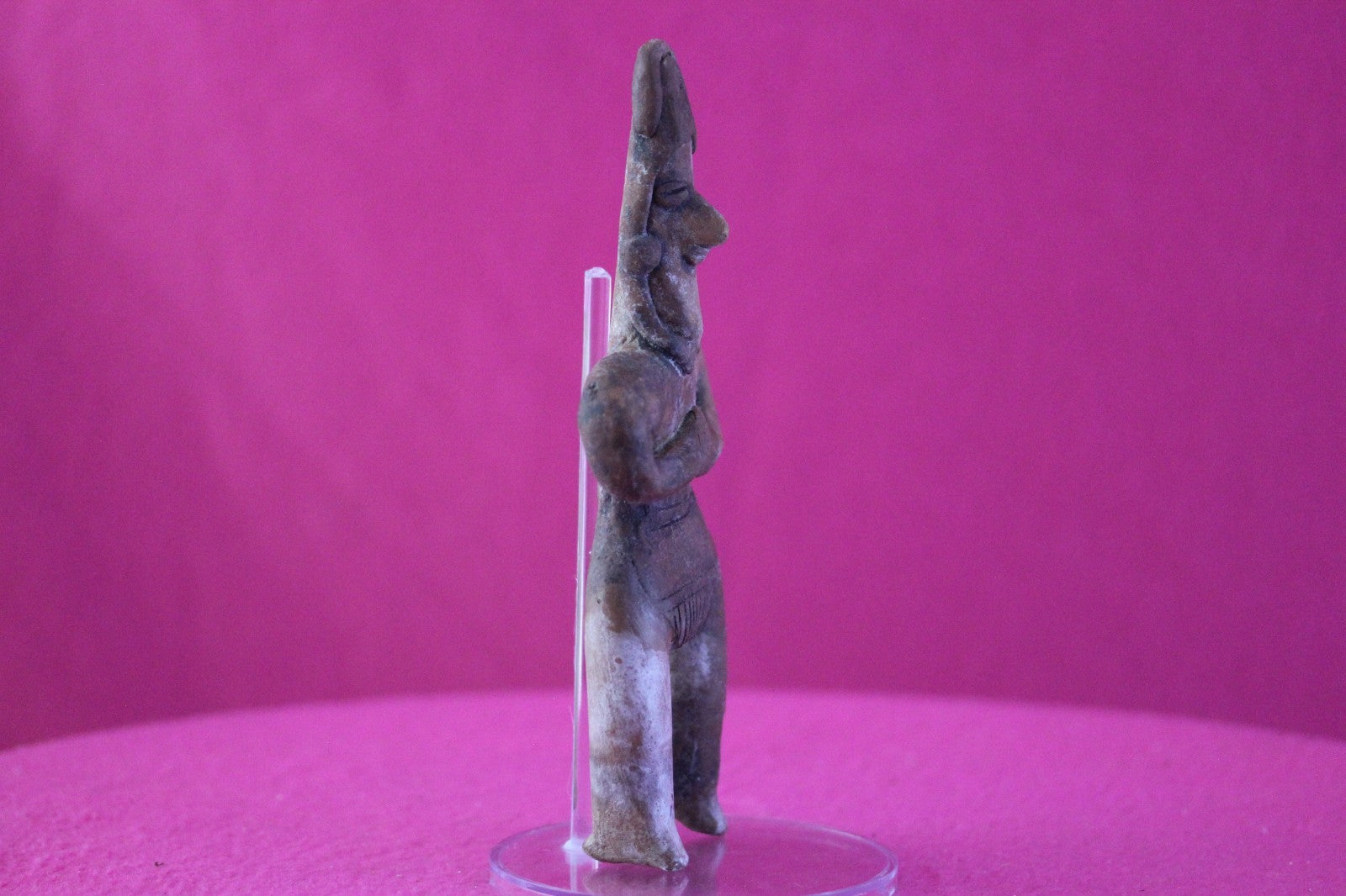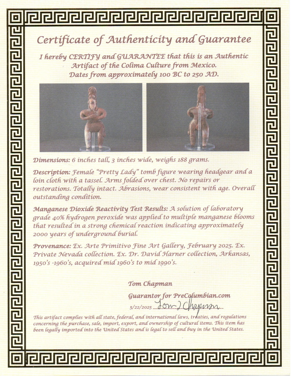 Dimensions: 6 inches tall, 3 inches wide, weighs 188 grams.Description: Female “Pretty Lady” tomb figure wearing headgear and a loin cloth with a tassel. Arms folded over chest. No repairs or restorations. Totally intact. Abrasions, wear consistent with age. Overall outstanding condition.Manganese Dioxide Reactivity Test Results: A solution of laboratory grade 40% hydrogen peroxide was applied to multiple manganese blooms that resulted in a strong chemical reaction indicating approximately 2000 years of underground burial.Provenance: Ex. Arte Primitivo Fine Art Gallery, February 2025. Ex. Private Nevada collection. Ex. Dr. David Harner collection, Arkansas, 1950’s -1960’s, acquired mid 1960’s to mid 1990’s.
