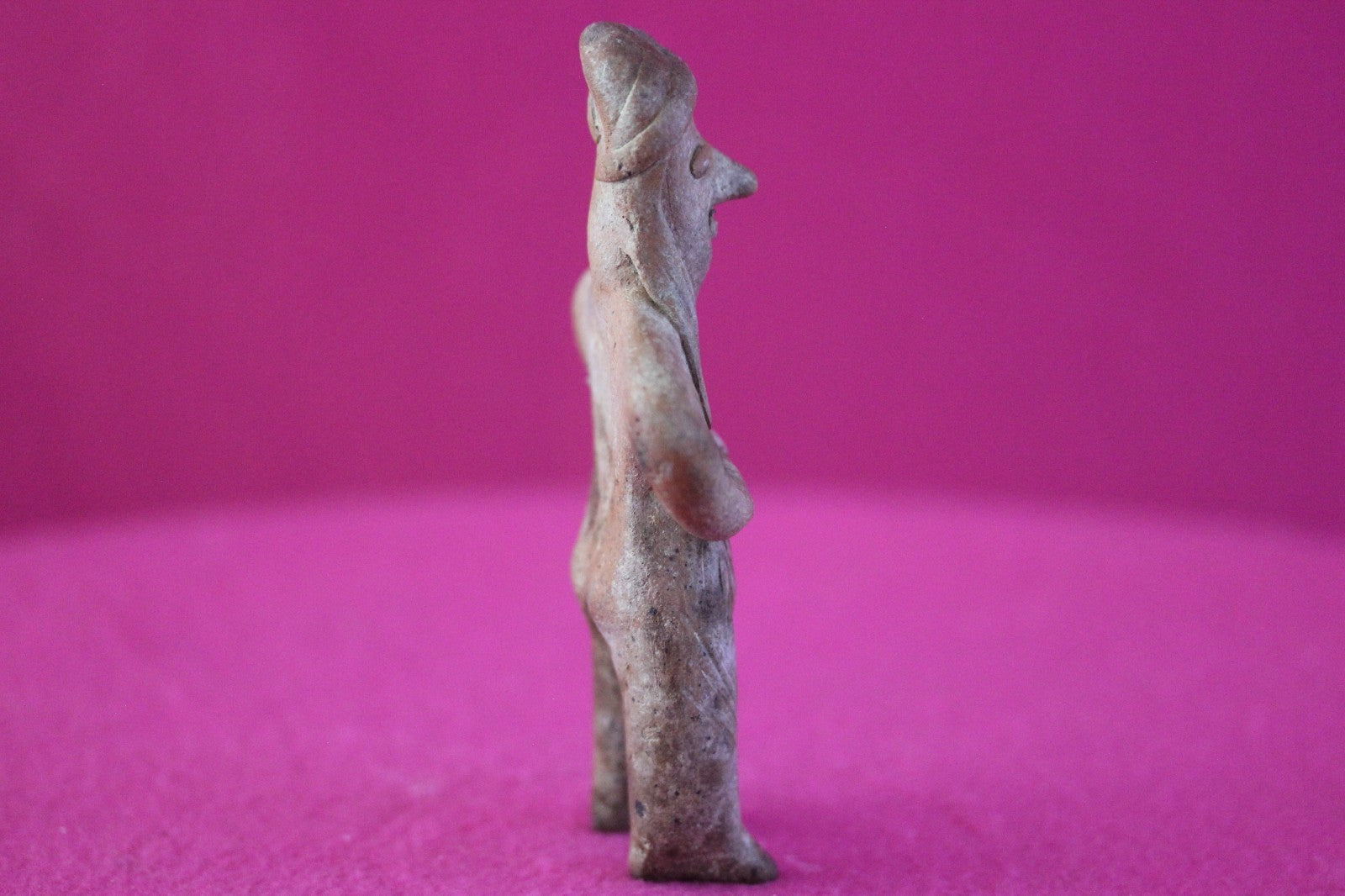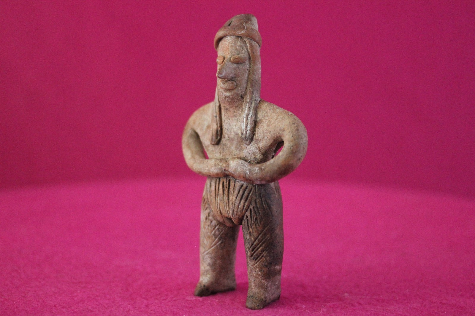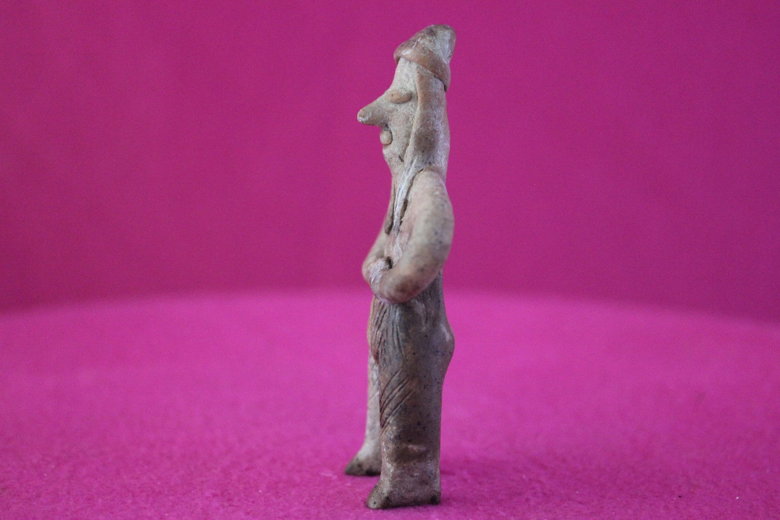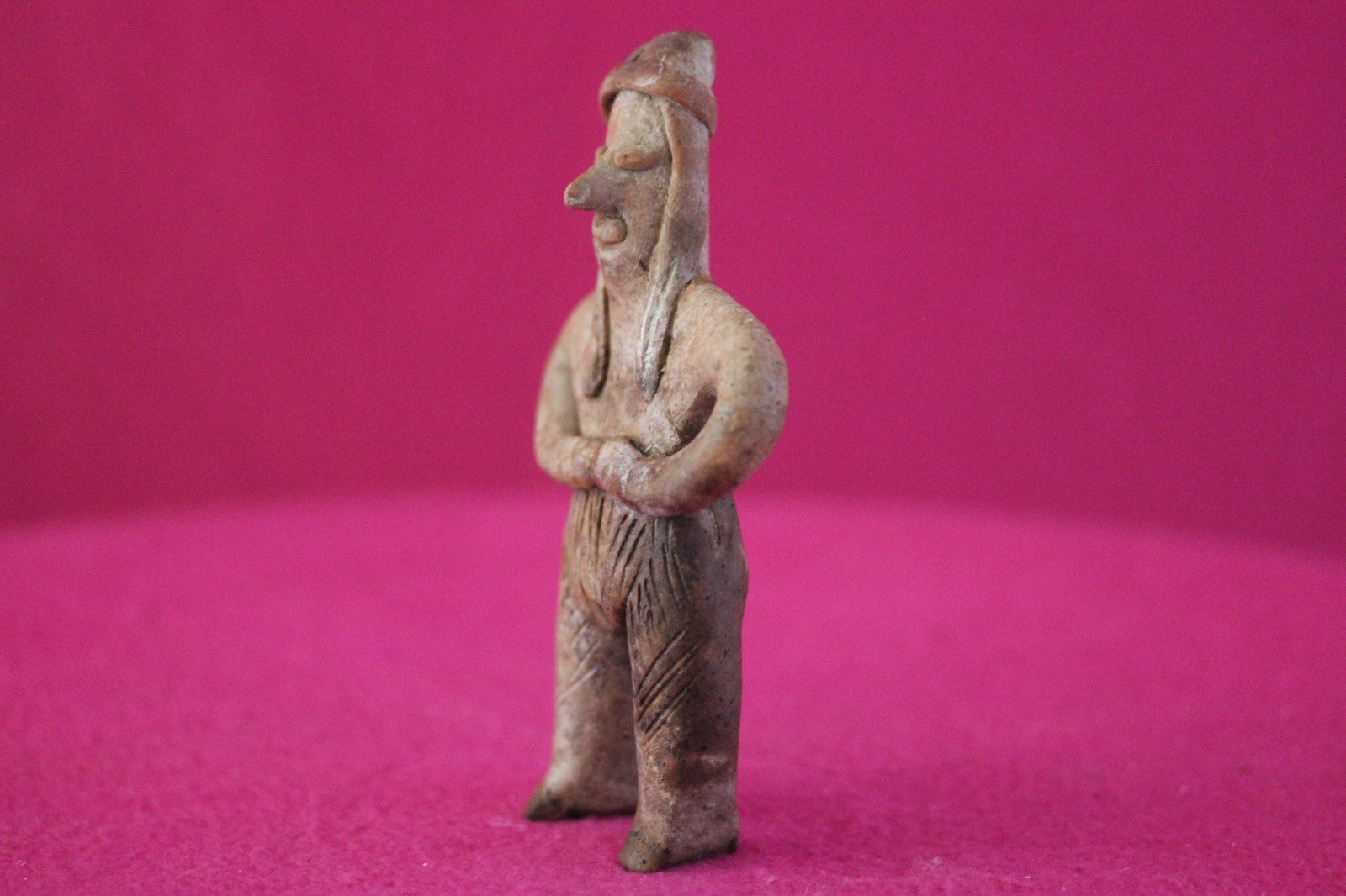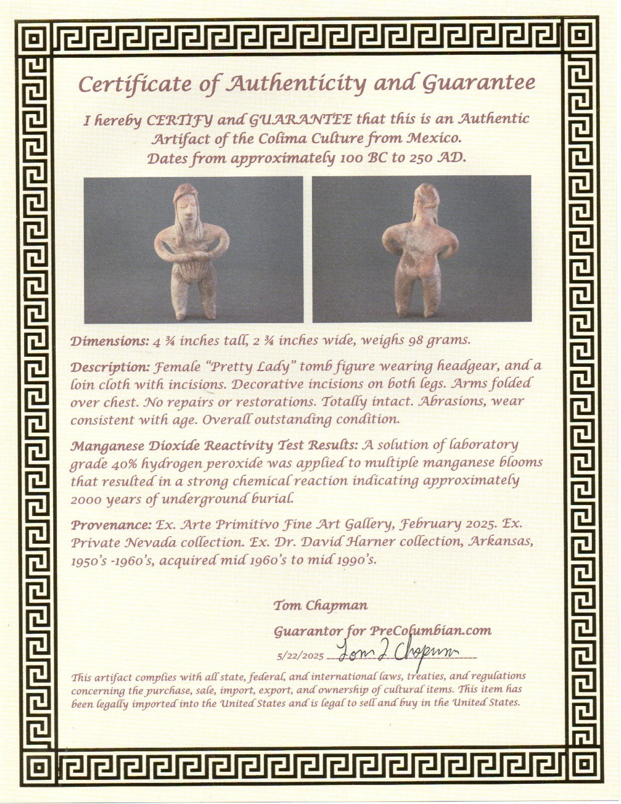 Dimensions: 4 ¾ inches tall, 2 ¾ inches wide, weighs 98 grams.Description: Female “Pretty Lady” tomb figure wearing headgear, and a loin cloth with incisions. Decorative incisions on both legs. Arms folded over chest. No repairs or restorations. Totally intact. Abrasions, wear consistent with age. Overall outstanding condition.Manganese Dioxide Reactivity Test Results: A solution of laboratory grade 40% hydrogen peroxide was applied to multiple manganese blooms that resulted in a strong chemical reaction indicating approximately 2000 years of underground burial.Provenance: Ex. Arte Primitivo Fine Art Gallery, February 2025. Ex. Private Nevada collection. Ex. Dr. David Harner collection, Arkansas, 1950’s -1960’s, acquired mid 1960’s to mid 1990’s.
