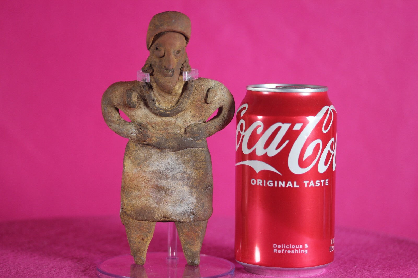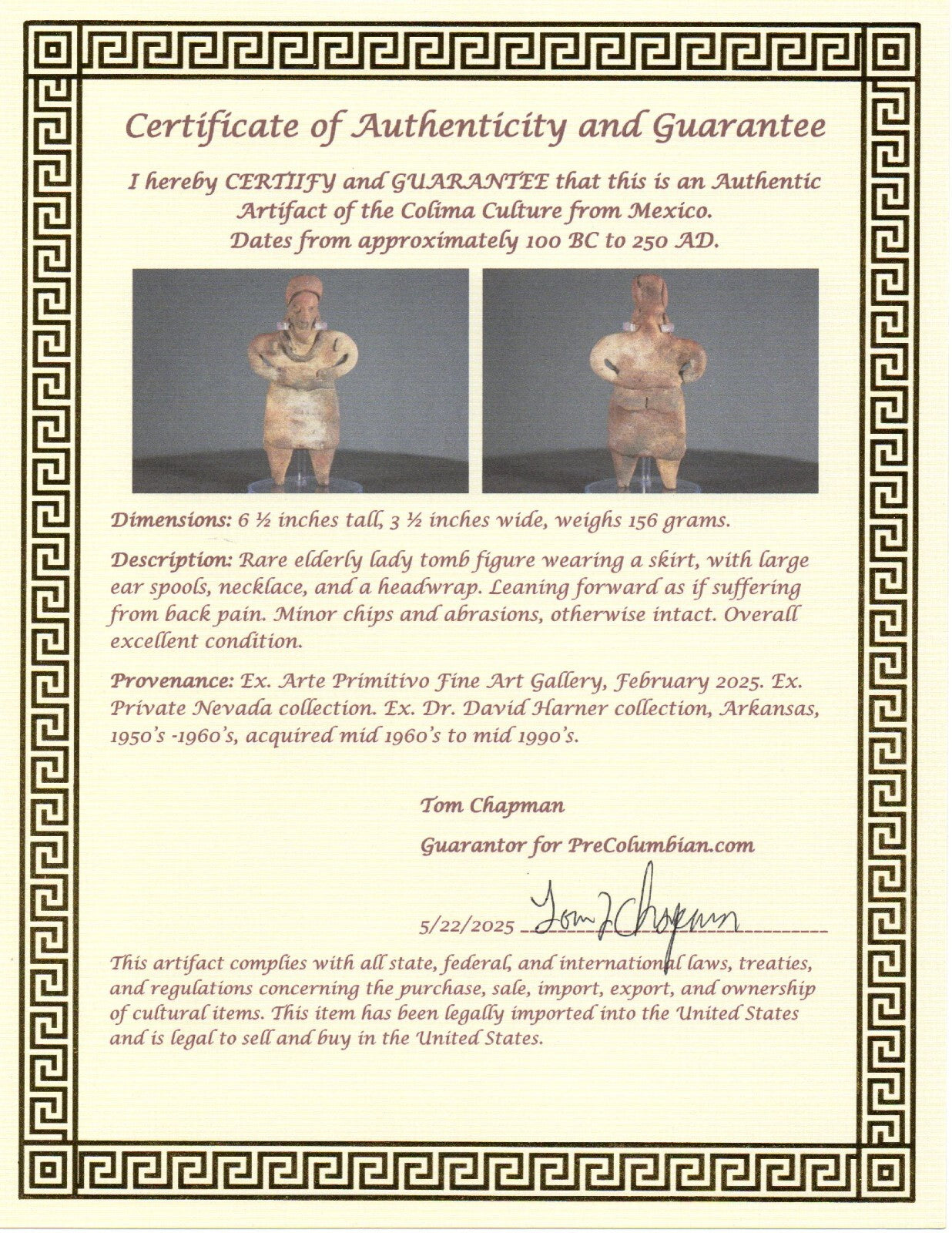 Dimensions: 6 ½ inches tall, 3 ½ inches wide, weighs 156 grams.Description: Rare elderly lady tomb figure wearing a skirt, with large ear spools, necklace, and a headwrap. Leaning forward as if suffering from back pain. Minor chips and abrasions, otherwise intact. Overall excellent condition.Provenance: Ex. Arte Primitivo Fine Art Gallery, February 2025. Ex. Private Nevada collection. Ex. Dr. David Harner collection, Arkansas, 1950’s -1960’s, acquired mid 1960’s to mid 1990’s.