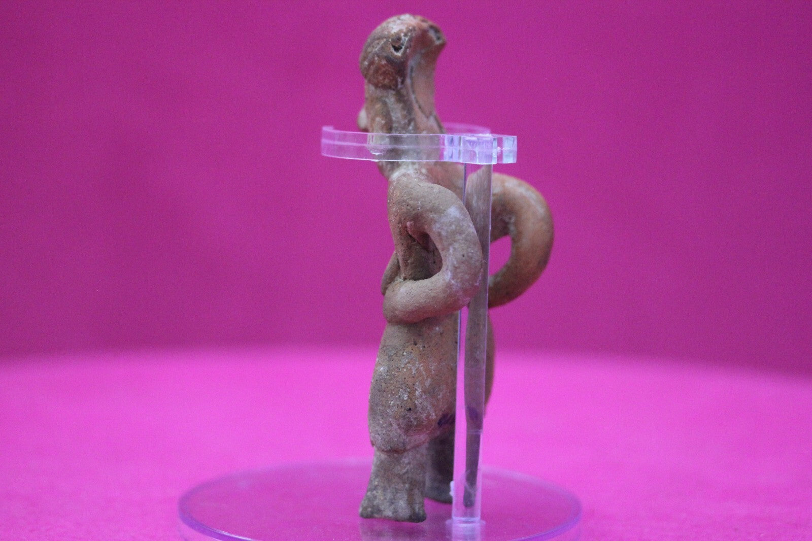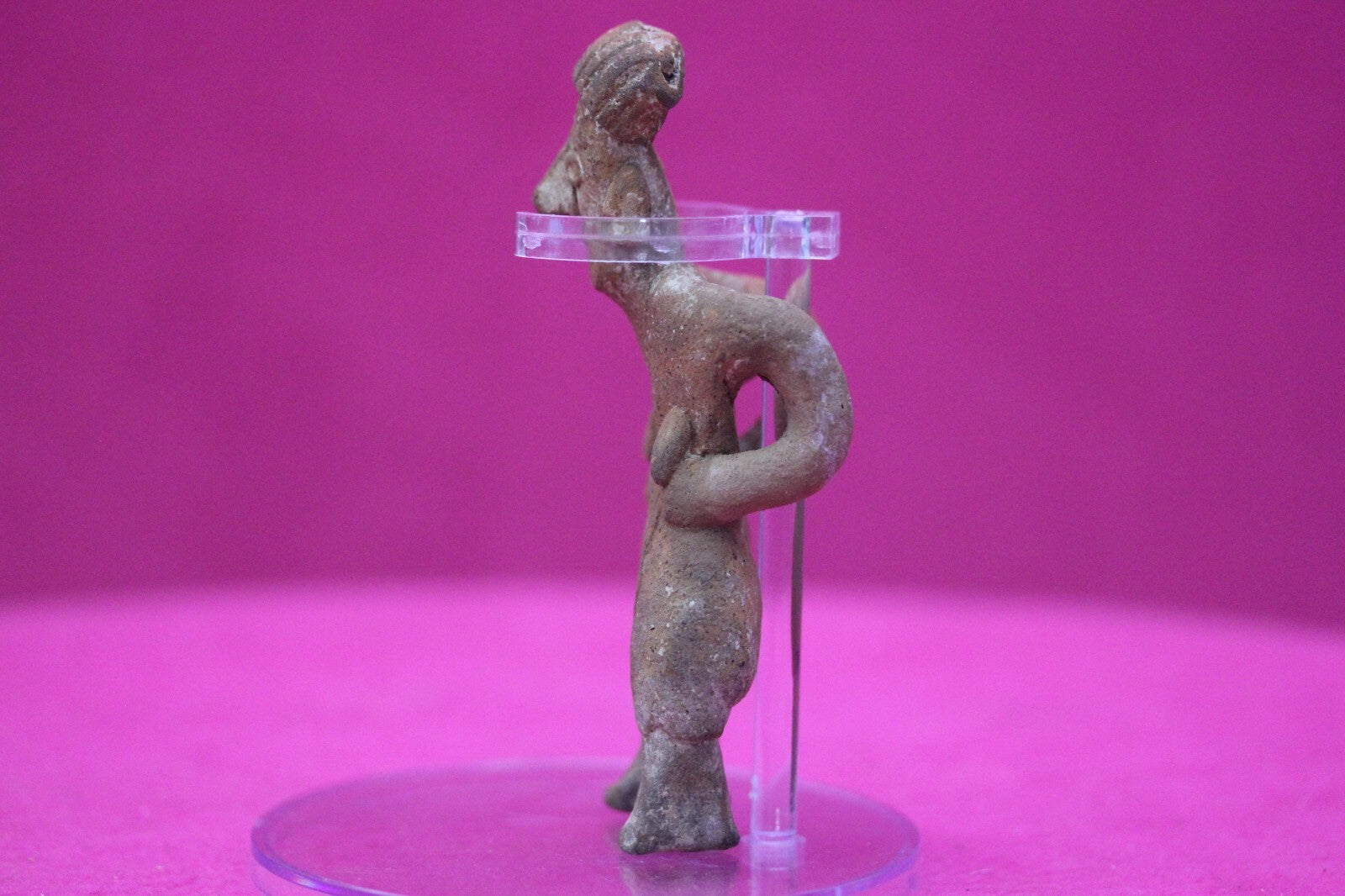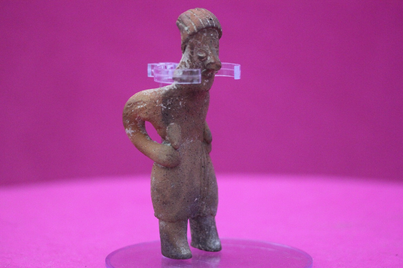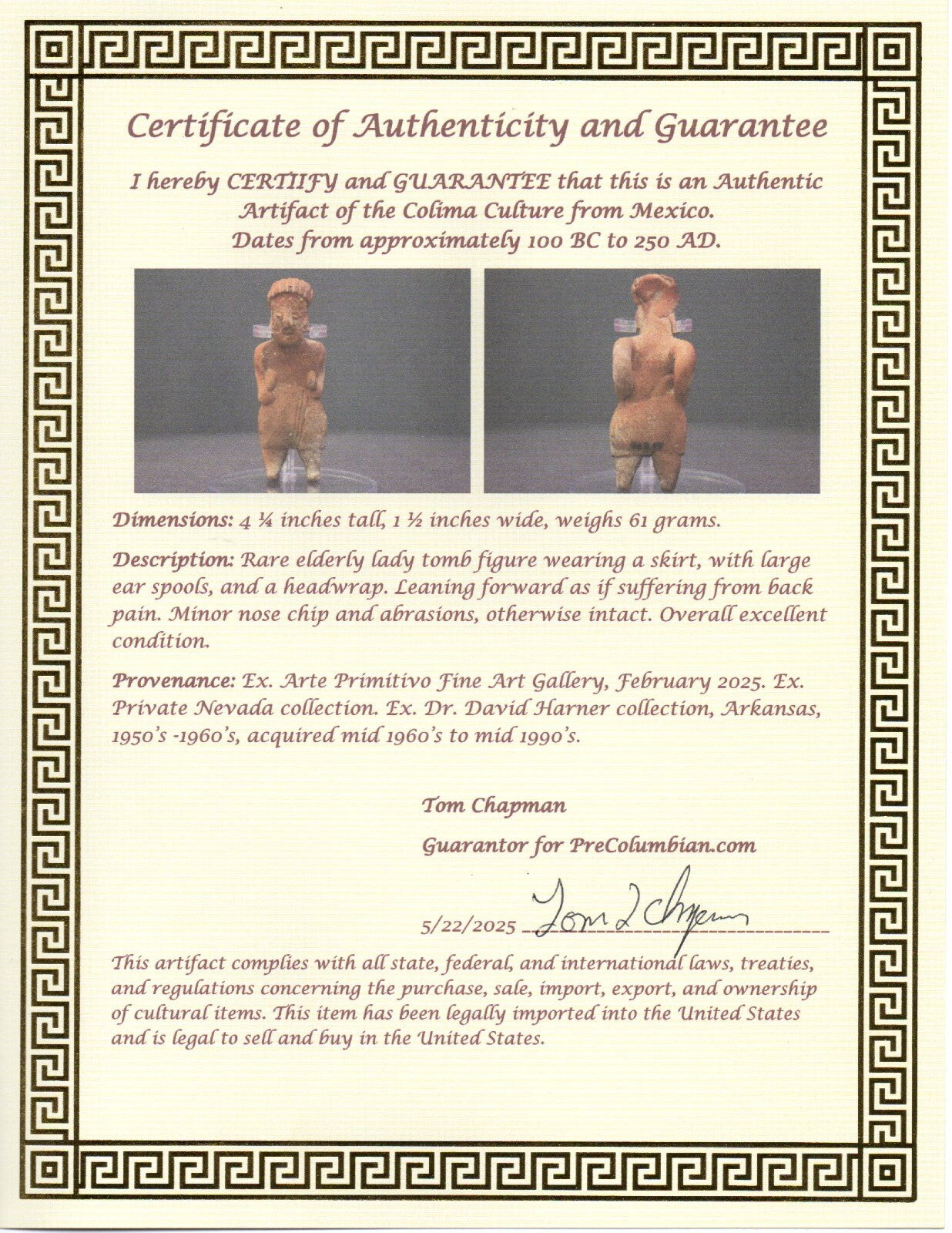 Dimensions: 4 ¼ inches tall, 1 ½ inches wide, weighs 61 grams.Description: Rare elderly lady tomb figure wearing a skirt, with large ear spools, and a headwrap. Leaning forward as if suffering from back pain. Minor nose chip and abrasions, otherwise intact. Overall excellent condition.Provenance: Ex. Arte Primitivo Fine Art Gallery, February 2025. Ex. Private Nevada collection. Ex. Dr. David Harner collection, Arkansas, 1950’s -1960’s, acquired mid 1960’s to mid 1990’s.
