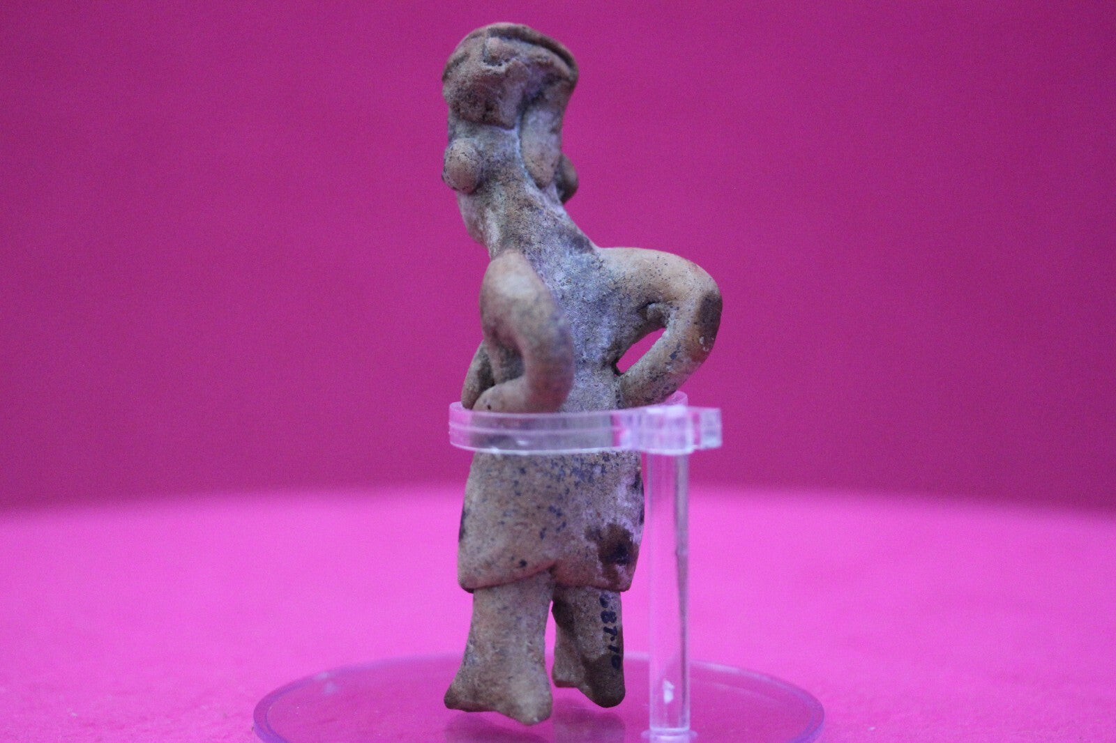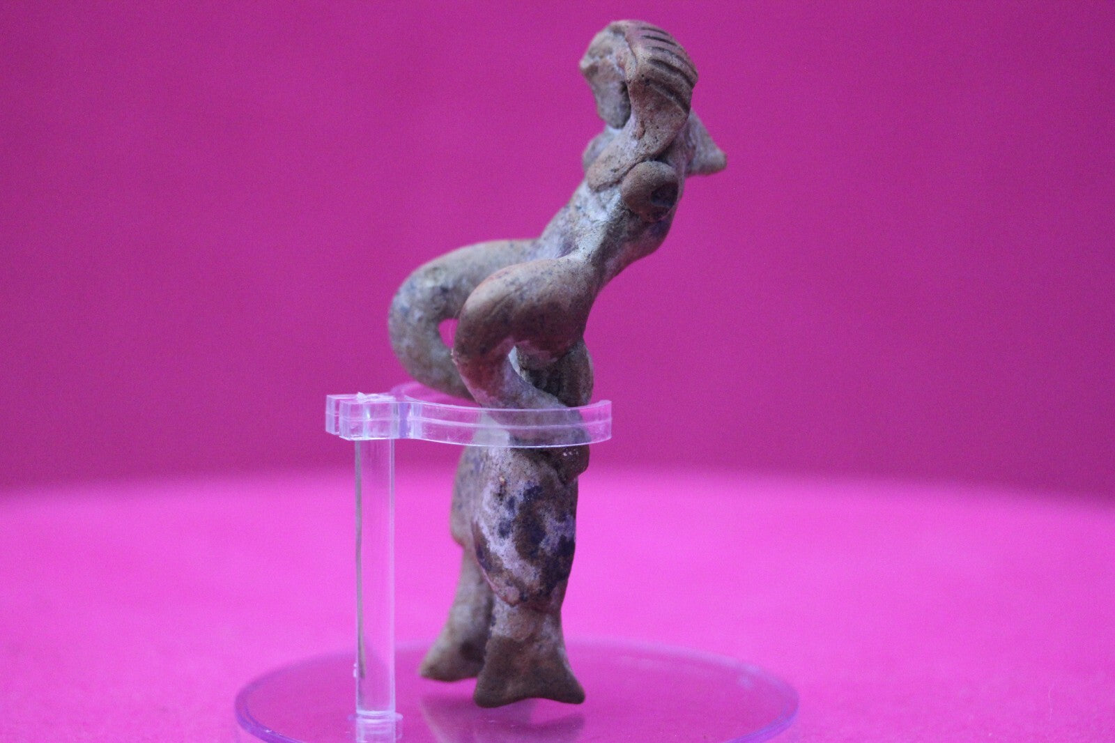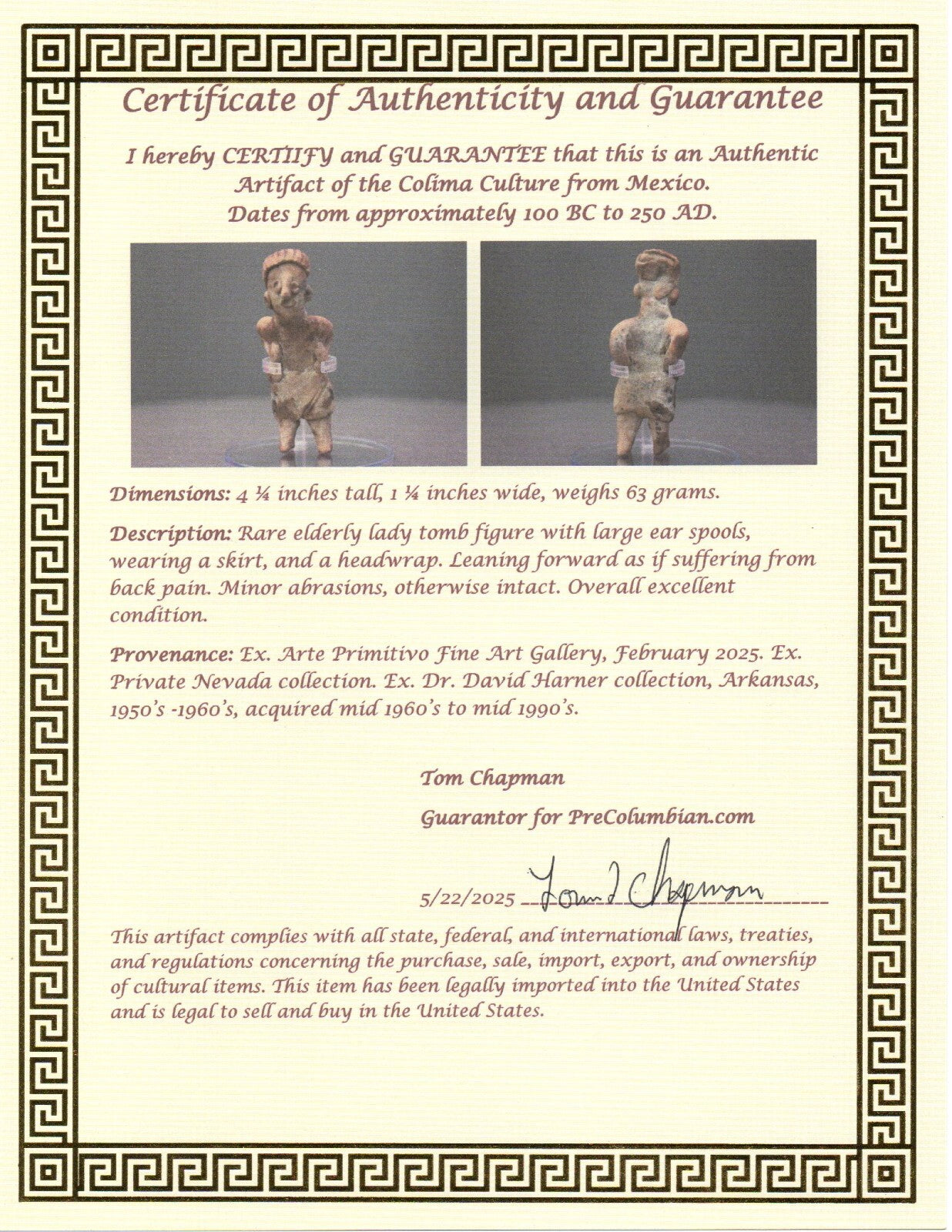 Dimensions: 4 ¼ inches tall, 1 ¼ inches wide, weighs 63 grams.Description: Rare elderly lady tomb figure with large ear spools, wearing a skirt, and a headwrap. Leaning forward as if suffering from back pain. Minor abrasions, otherwise intact. Overall excellent condition.Provenance: Ex. Arte Primitivo Fine Art Gallery, February 2025. Ex. Private Nevada collection. Ex. Dr. David Harner collection, Arkansas, 1950’s -1960’s, acquired mid 1960’s to mid 1990’s.