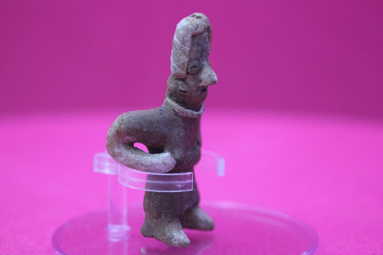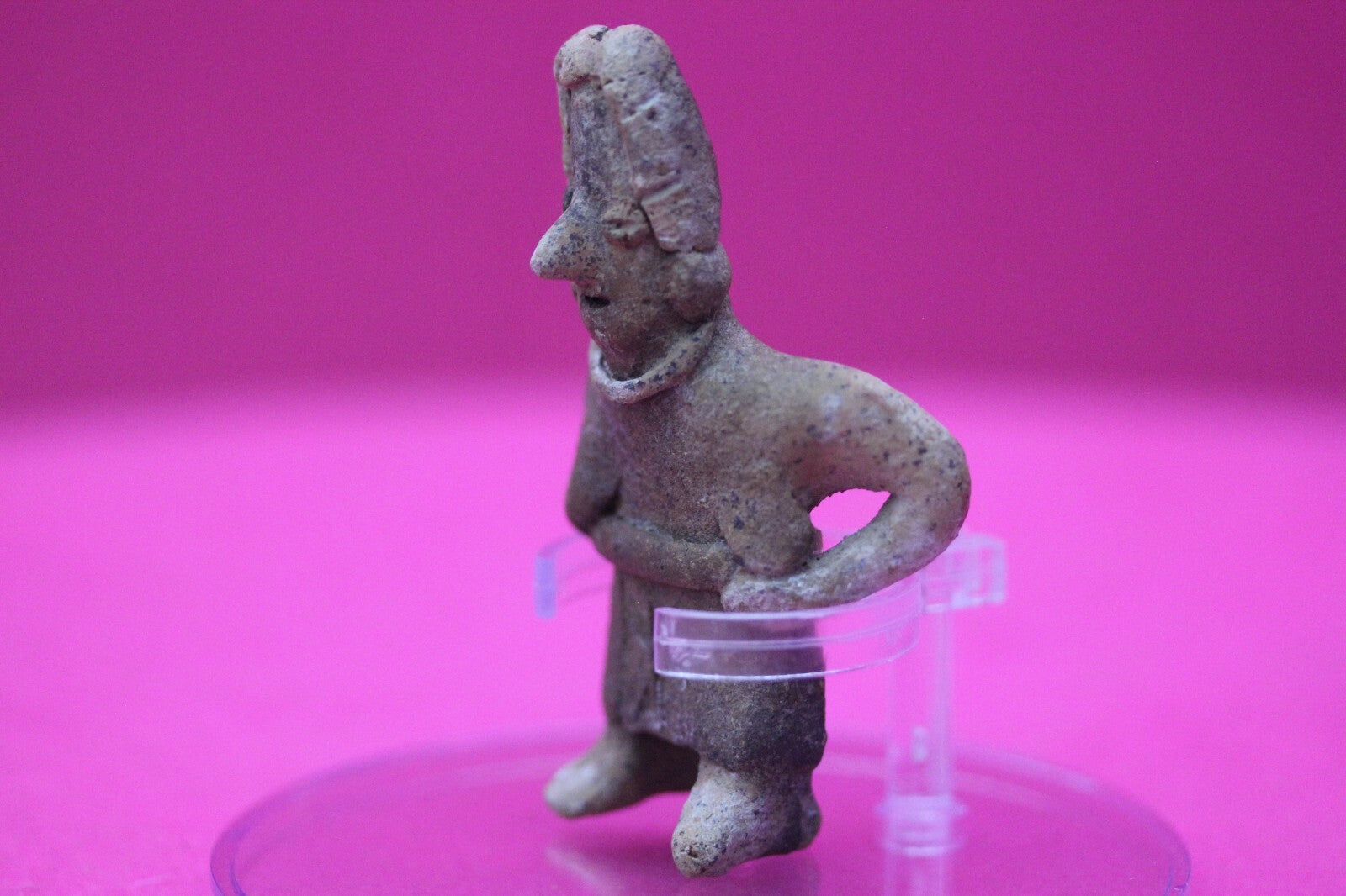 Dimensions: 3 inches tall, 1 ¾ inches wide, weighs 33 grams.Description: Rare elderly lady tomb figure wearing a skirt, elaborate necklace, and a wrap around the waist. Leaning forward as if suffering from back pain. Minor abrasions, otherwise intact. Overall excellent condition.Provenance: Ex. Arte Primitivo Fine Art Gallery, February 2025. Ex. Private Nevada collection. Ex. Dr. David Harner collection, Arkansas, 1950’s -1960’s, acquired mid 1960’s to mid 1990’s.