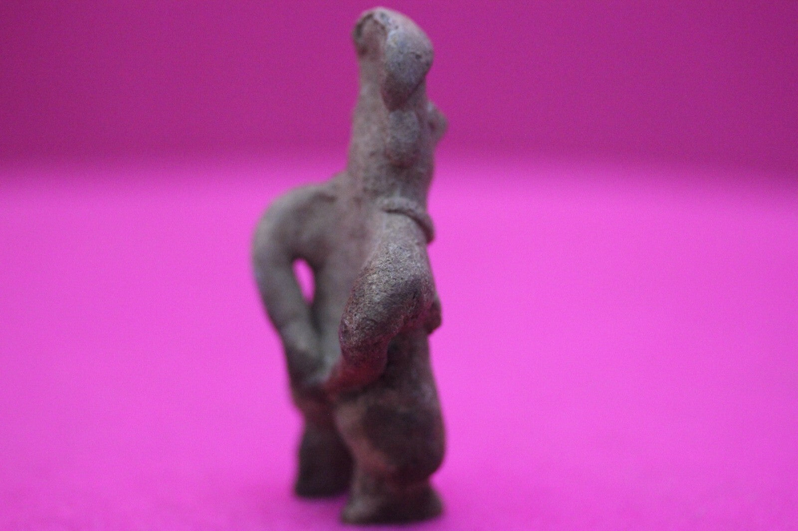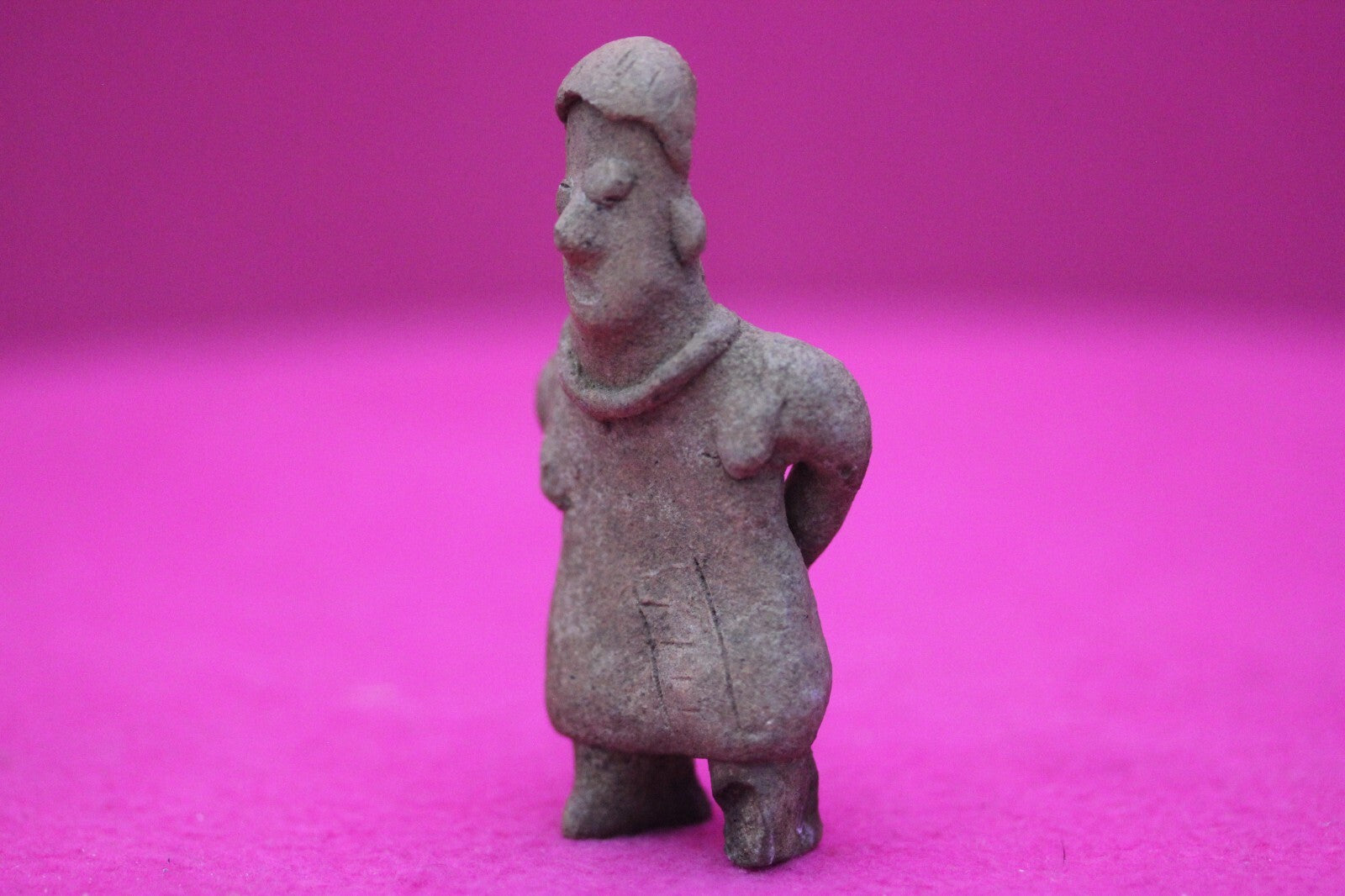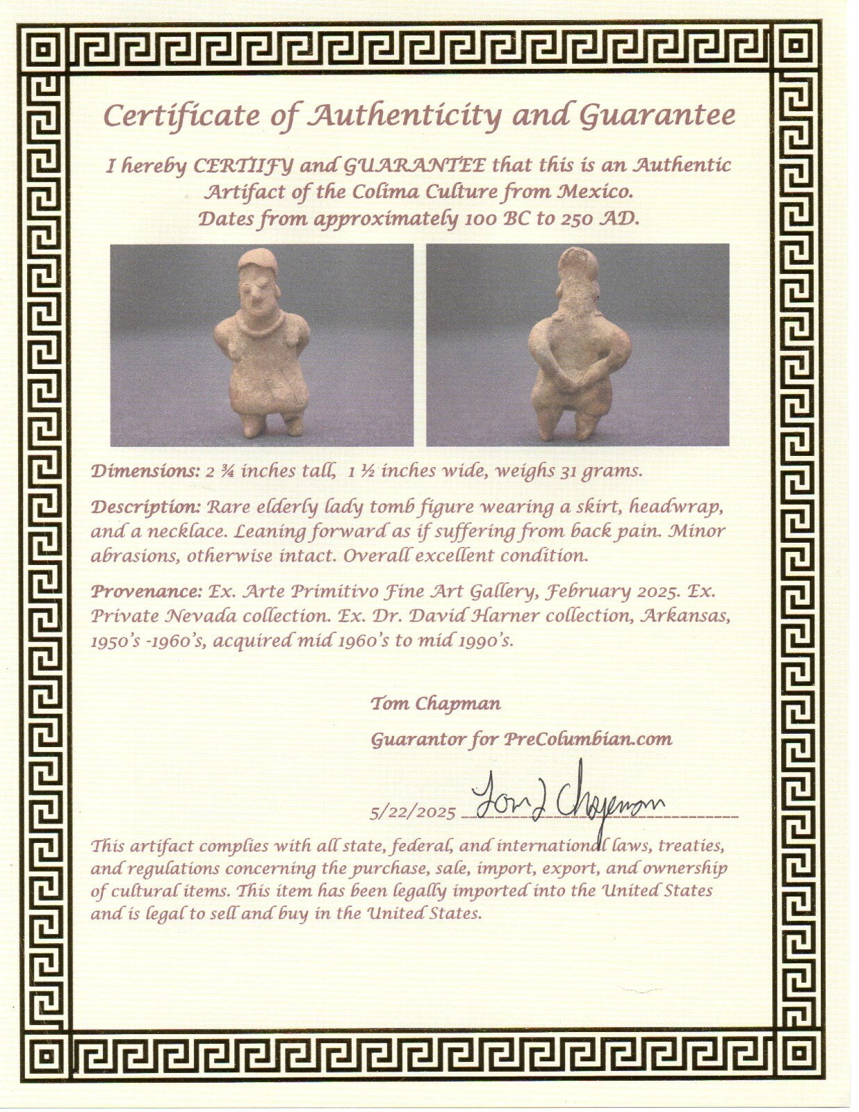 Dimensions: 2 ¾ inches tall, 1 ½ inches wide, weighs 31 grams.Description: Rare elderly lady tomb figure wearing a skirt, headwrap, and a necklace. Leaning forward as if suffering from back pain. Minor abrasions, otherwise intact. Overall excellent condition.Provenance: Ex. Arte Primitivo Fine Art Gallery, February 2025. Ex. Private Nevada collection. Ex. Dr. David Harner collection, Arkansas, 1950’s -1960’s, acquired mid 1960’s to mid 1990’s.