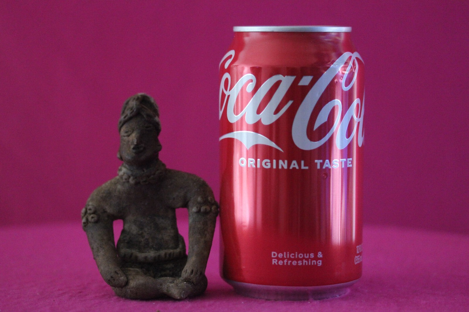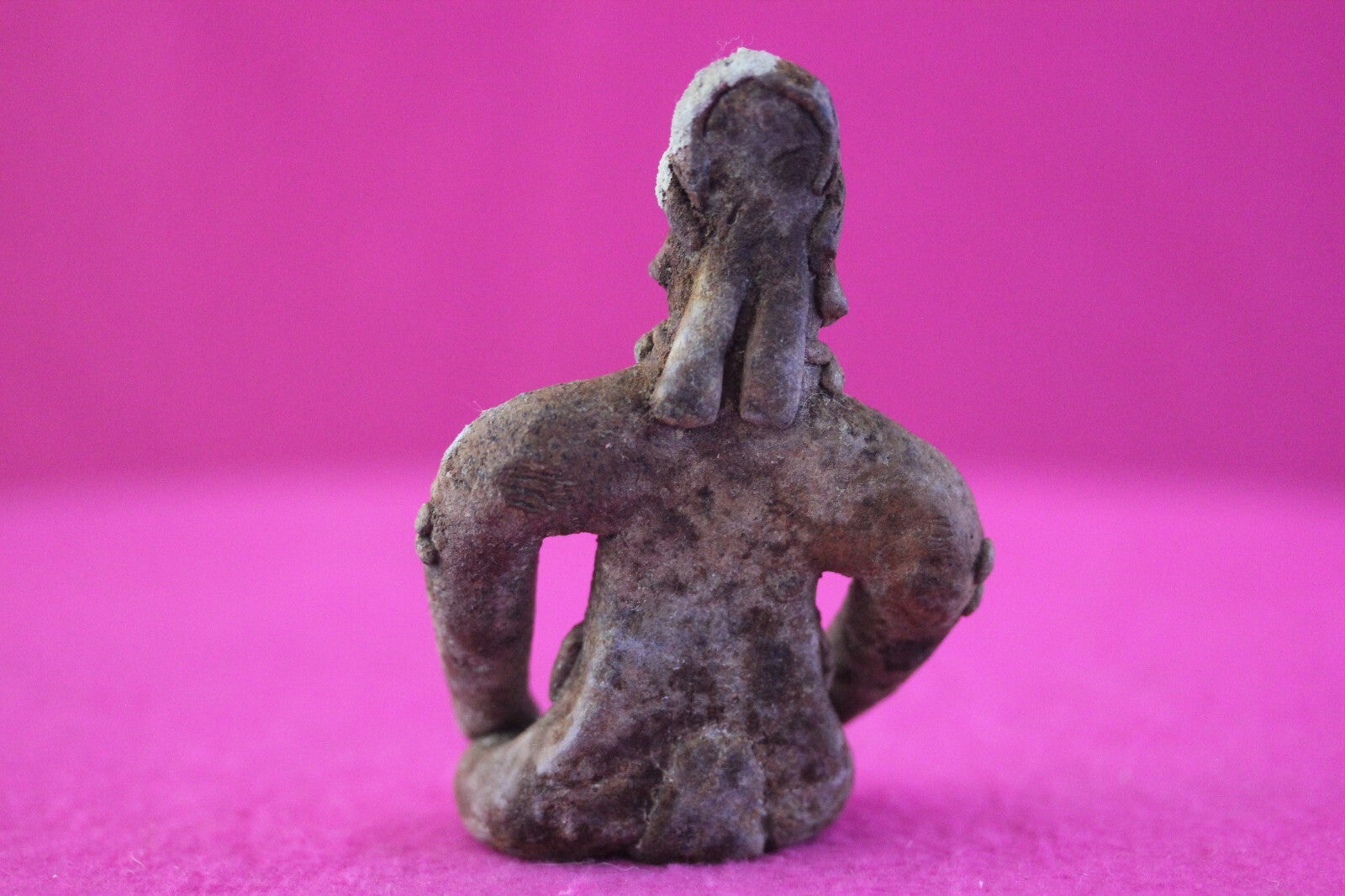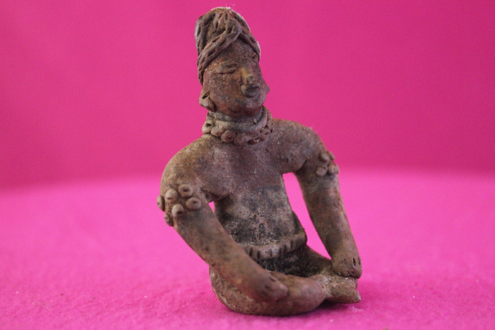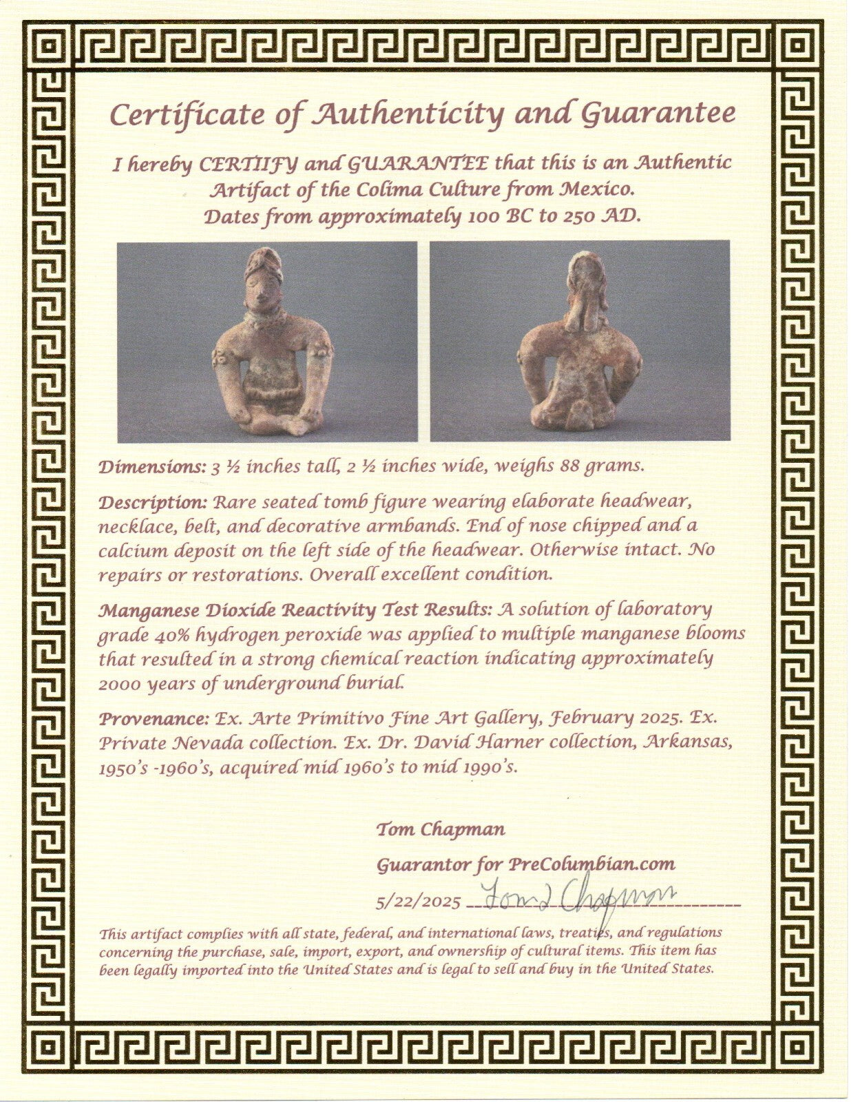 Dimensions: 3 ½ inches tall, 2 ½ inches wide, weighs 88 grams.Description: Rare seated tomb figure wearing elaborate headwear, necklace, belt, and decorative armbands. End of nose chipped and a calcium deposit on the left side of the headwear. Otherwise intact. No repairs or restorations. Overall excellent condition.Manganese Dioxide Reactivity Test Results: A solution of laboratory grade 40% hydrogen peroxide was applied to multiple manganese blooms that resulted in a strong chemical reaction indicating approximately 2000 years of underground burial.Provenance: Ex. Arte Primitivo Fine Art Gallery, February 2025. Ex. Private Nevada collection. Ex. Dr. David Harner collection, Arkansas, 1950’s -1960’s, acquired mid 1960’s to mid 1990’s.