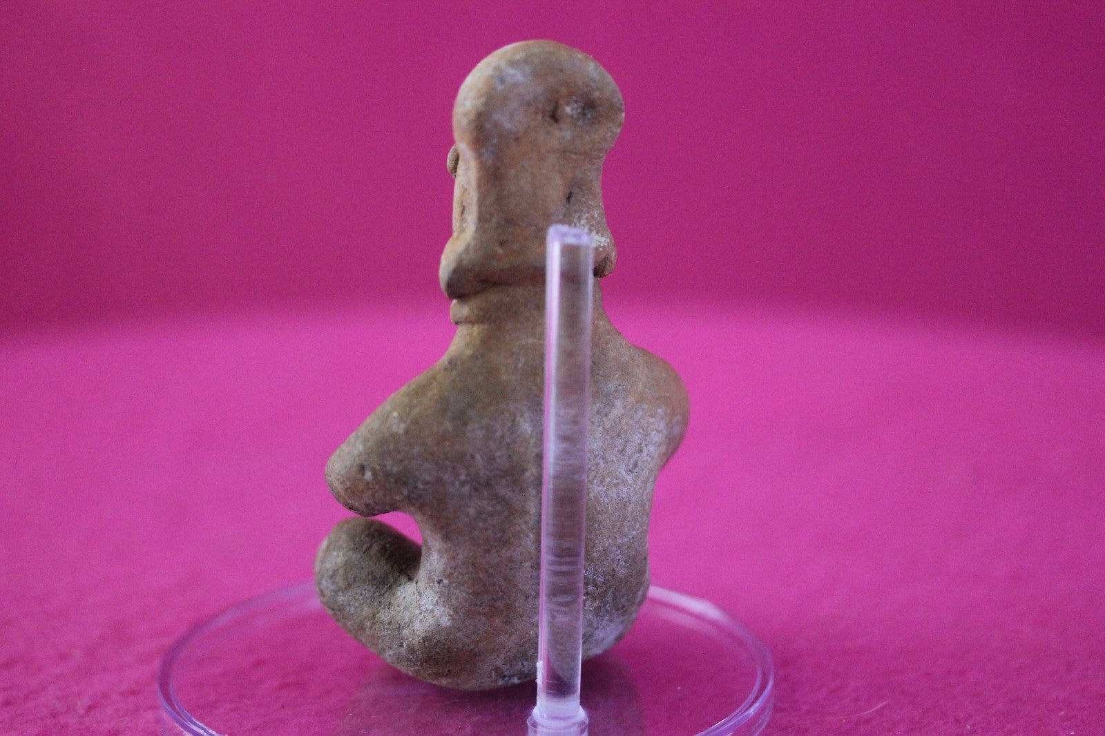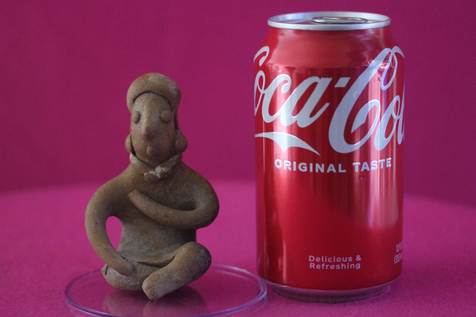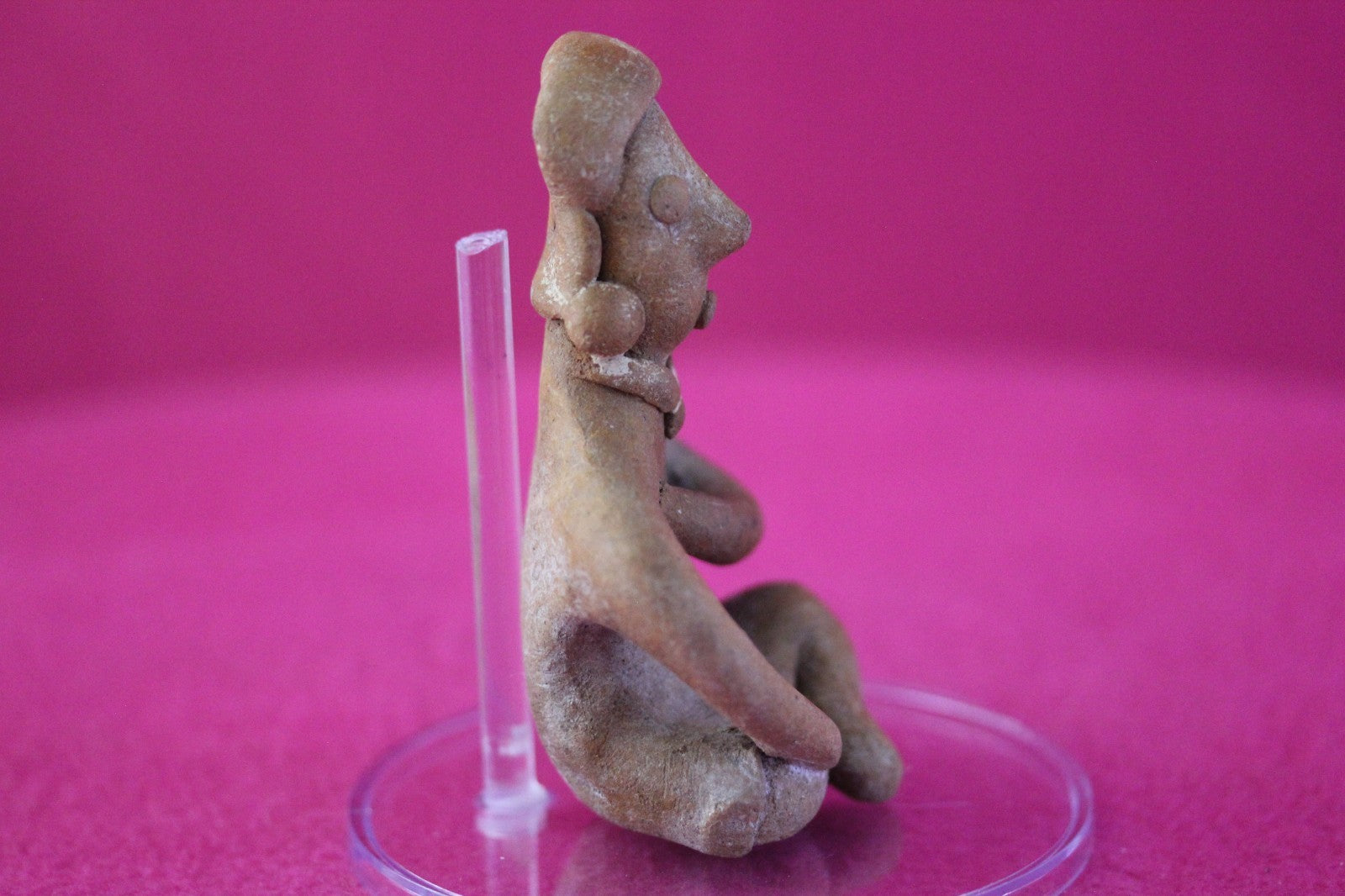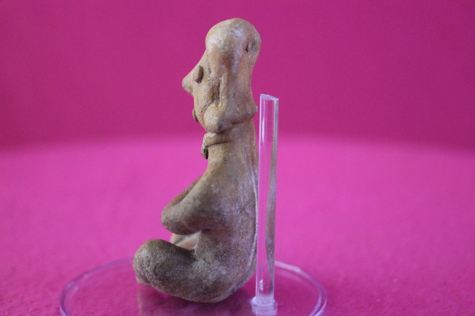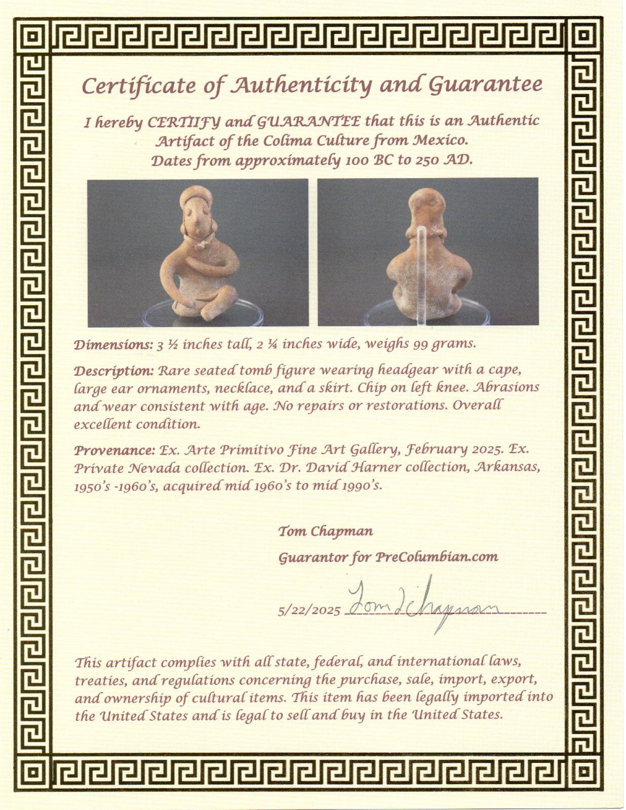 Dimensions: 3 ½ inches tall, 2 ¼ inches wide, weighs 99 grams.Description: Rare seated tomb figure wearing headgear with a cape, large ear ornaments, necklace, and a skirt. Chip on left knee. Abrasions and wear consistent with age. No repairs or restorations. Overall excellent condition.Provenance: Ex. Arte Primitivo Fine Art Gallery, February 2025. Ex. Private Nevada collection. Ex. Dr. David Harner collection, Arkansas, 1950’s -1960’s, acquired mid 1960’s to mid 1990’s.