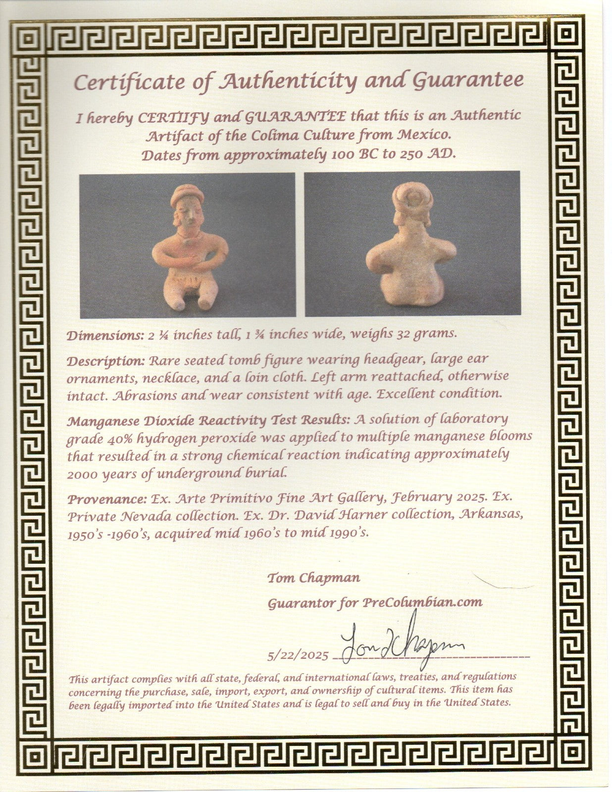 Dimensions: 2 ¼ inches tall, 1 ¾ inches wide, weighs 32 grams.Description: Rare seated tomb figure wearing headgear, large ear ornaments, necklace, and a loin cloth. Left arm reattached, otherwise intact. Abrasions and wear consistent with age. Excellent condition.Manganese Dioxide Reactivity Test Results: A solution of laboratory grade 40% hydrogen peroxide was applied to multiple manganese blooms that resulted in a strong chemical reaction indicating approximately 2000 years of underground burial.Provenance: Ex. Arte Primitivo Fine Art Gallery, February 2025. Ex. Private Nevada collection. Ex. Dr. David Harner collection, Arkansas, 1950’s -1960’s, acquired mid 1960’s to mid 1990’s.