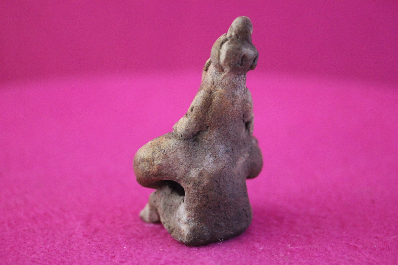 Dimensions: 3 ¼ inches tall, 2 ¼ inches wide, weighs 87 grams.Description: Rare seated tomb figure wearing a skirt, head gear, and a large nose ring. a crown, large earspools. Large bulging eyes and both hands on knees. Minor chips and abrasions. Otherwise intact. No repairs or restorations. Overall excellent condition.Provenance: Ex. Arte Primitivo Fine Art Gallery, February 2025. Ex. Private Nevada collection. Ex. Dr. David Harner collection, Arkansas, 1950’s -1960’s, acquired mid 1960’s to mid 1990’s.
