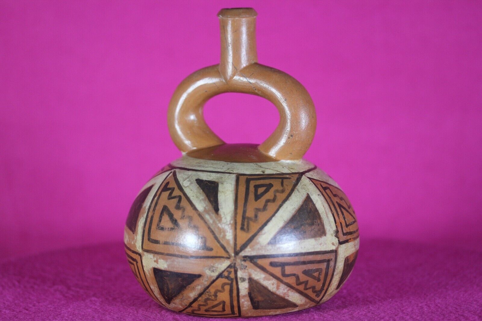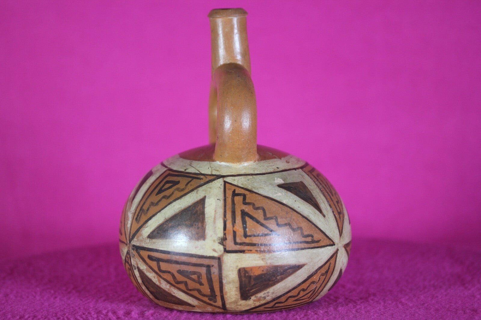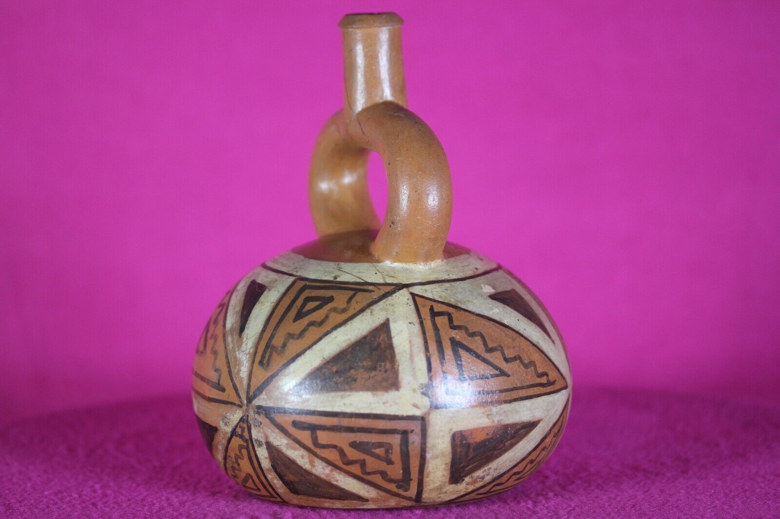 Museum Quality. Polychrome decorated pottery vessel having a stirrup type spout and a squat bulbous body, with painted tricolor geometric body decoration composed of various interlocking triangular elements. Overall scattered mineral deposits on the surface. Some minor scattered paint wear, otherwise intact, exc. cond. A nice example.