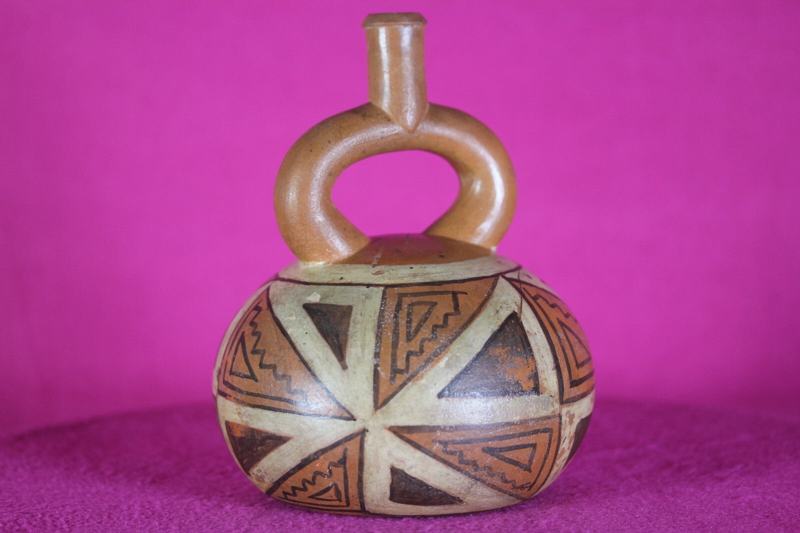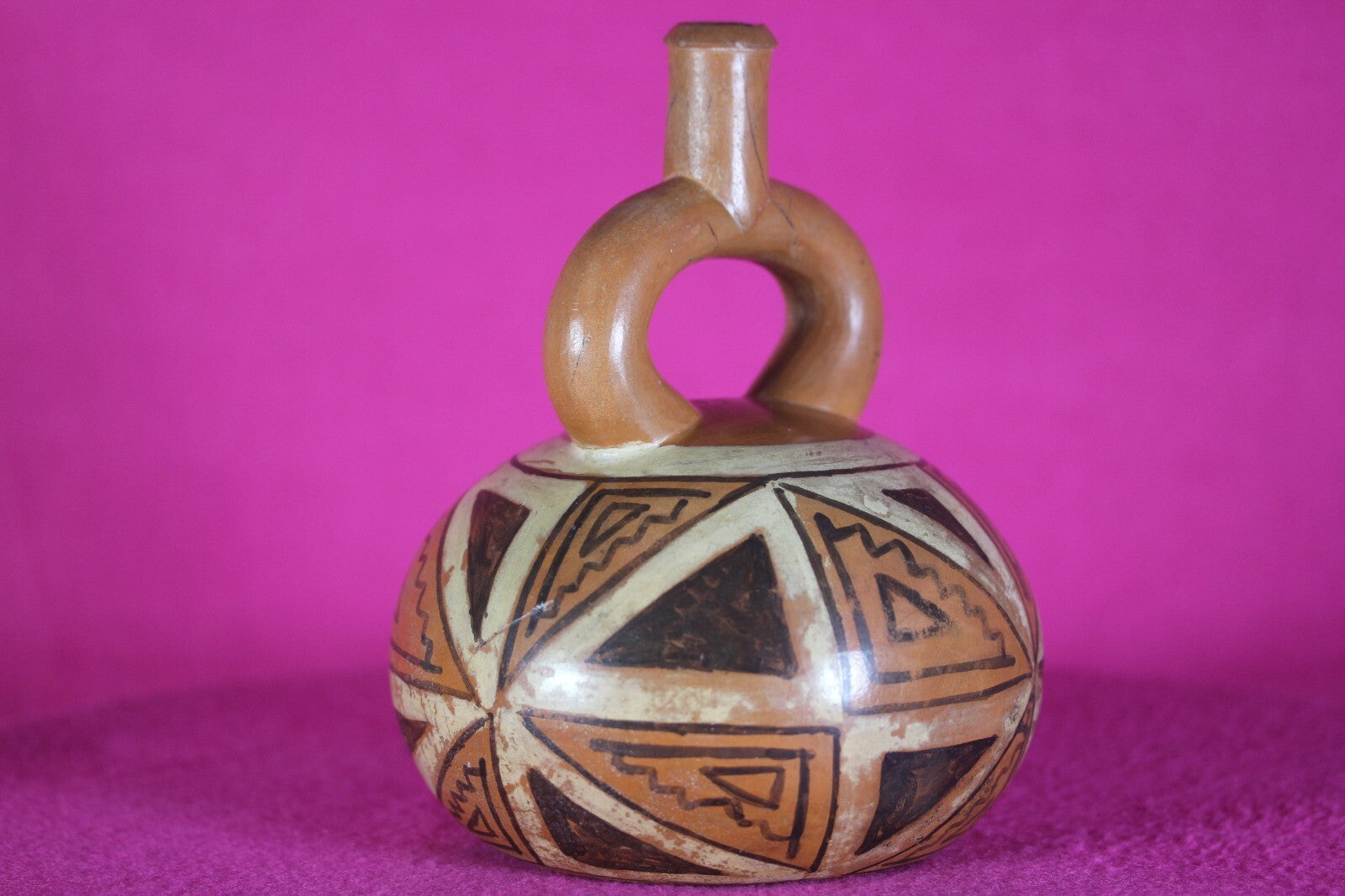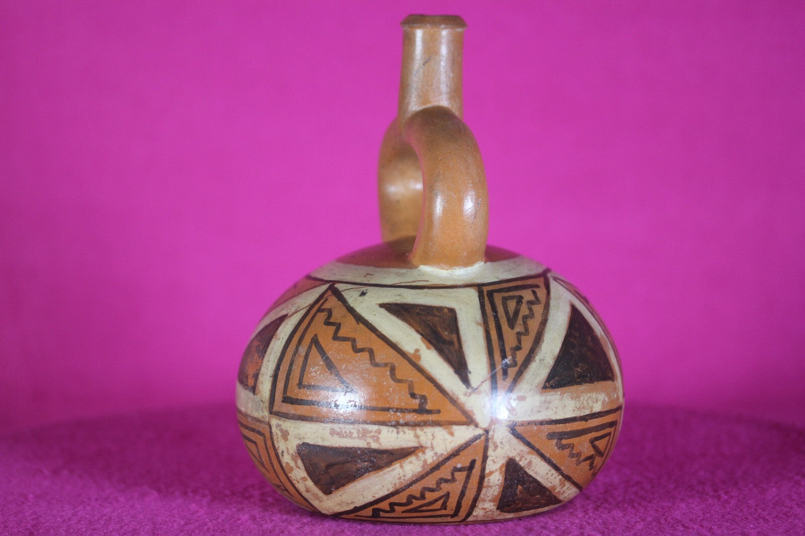 Museum Quality. Polychrome decorated pottery vessel having a stirrup type spout and a squat bulbous body, with painted tricolor geometric body decoration composed of various interlocking triangular elements. Overall scattered mineral deposits on the surface. Some minor scattered paint wear, otherwise intact, exc. cond. A nice example.