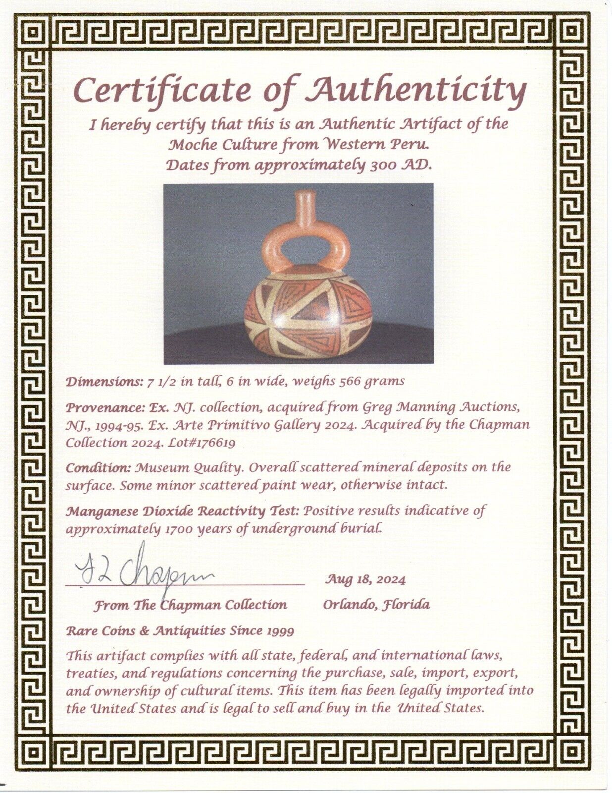 Authentic Pre Columbian Artifact Stirrup Vessel Moche Ex Arte Primitivo COA T31