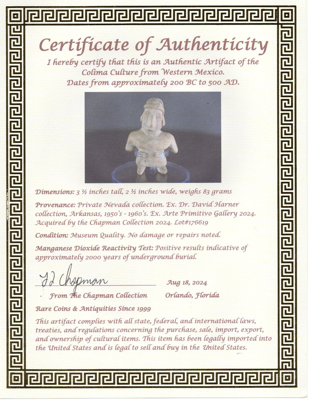 Acquired from the world renowned Arte Primitivo Gallery in Downtown Manhattan, New York City. This is the most prestigious gallery of ancient artifacts in the United States. Artifacts from Arte Primitivo are the most sought after in the world. They are instantly recognized and respected by antiquities dealers and collectors alike as being the best of the best. Artifacts that are authenticated by Arte Primitivo instantly increase in value due to their expertise and decades of experience. They are the go to experts when it comes to ancient art. Provenance: Private Nevada collection. Ex. Dr. David Harner collection, Arkansas, 1950’s - 1960’s. Ex. Arte Primitivo Gallery 2024. Acquired by the Chapman Collection 2024. Lot#176619. Condition: Museum Quality. Left arm professionally restored.Manganese Dioxide Reactivity Test: Positive results indicative of approximately 2000 years of underground burial.
